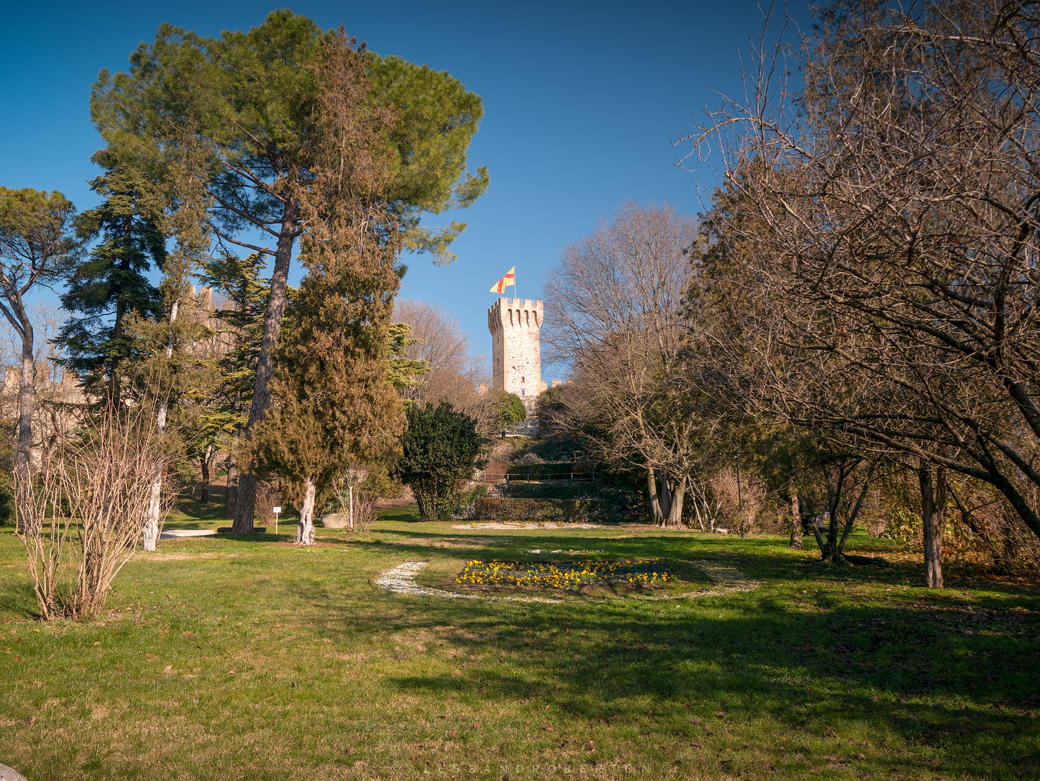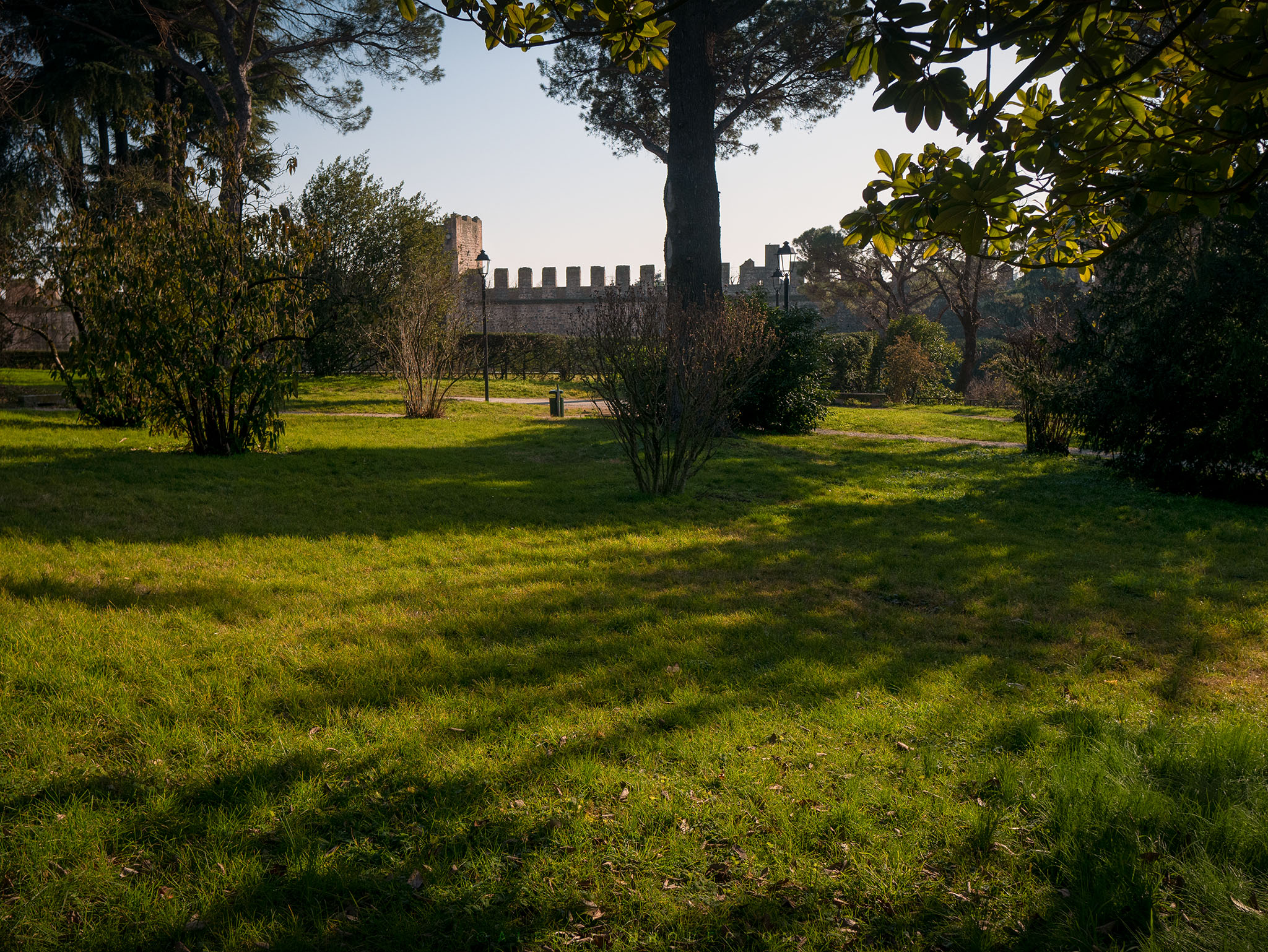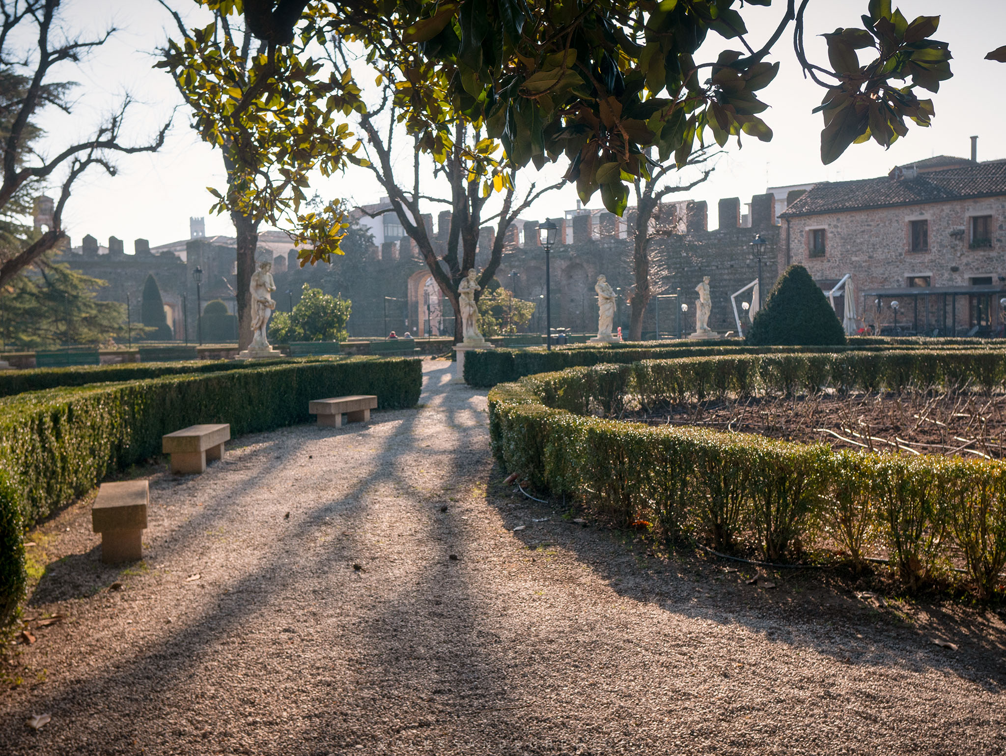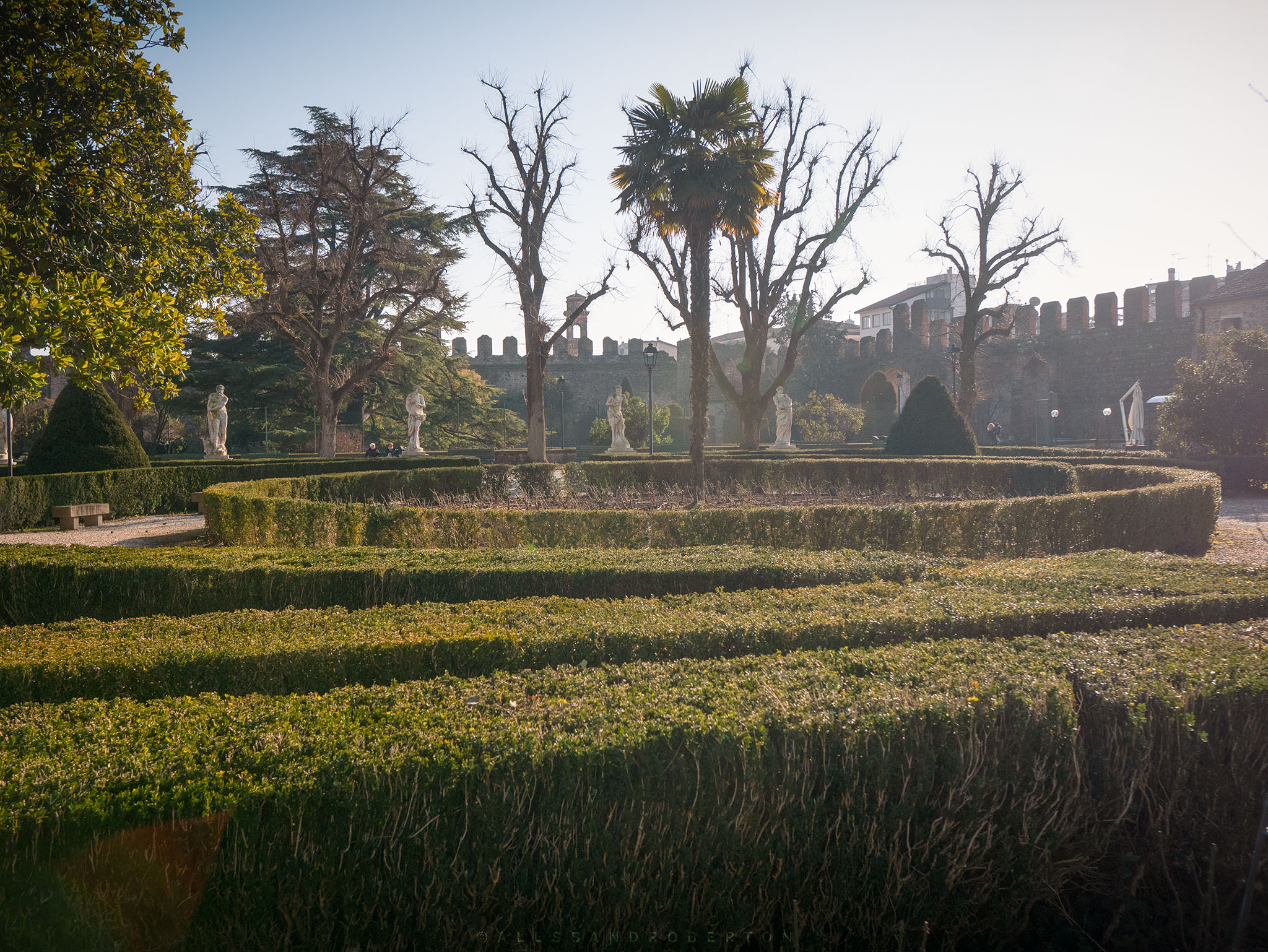 Low walls and box hedges delimit the areas: an Italian garden, a public park with benches, old trees and paths leading to the highest part of the castle.