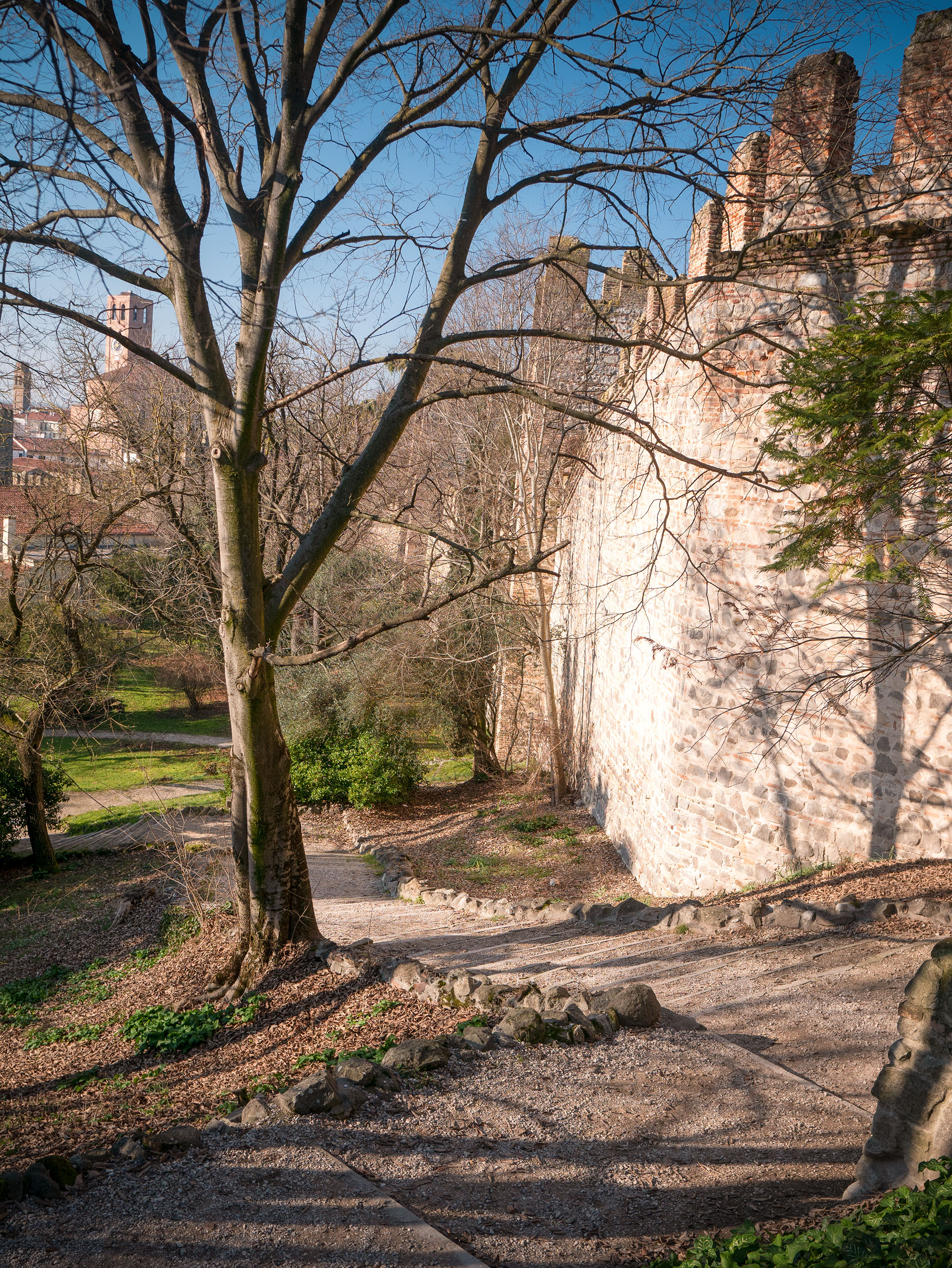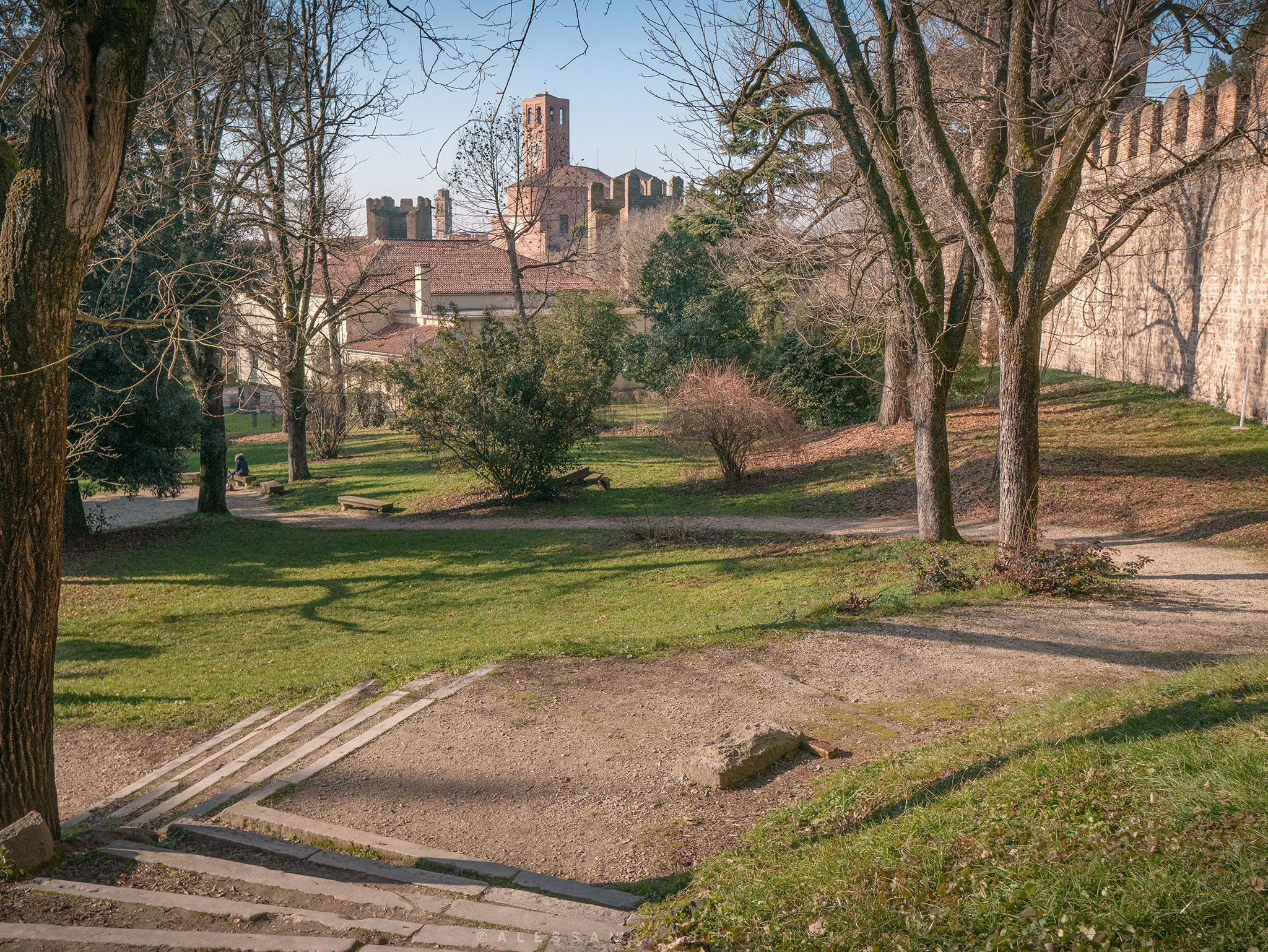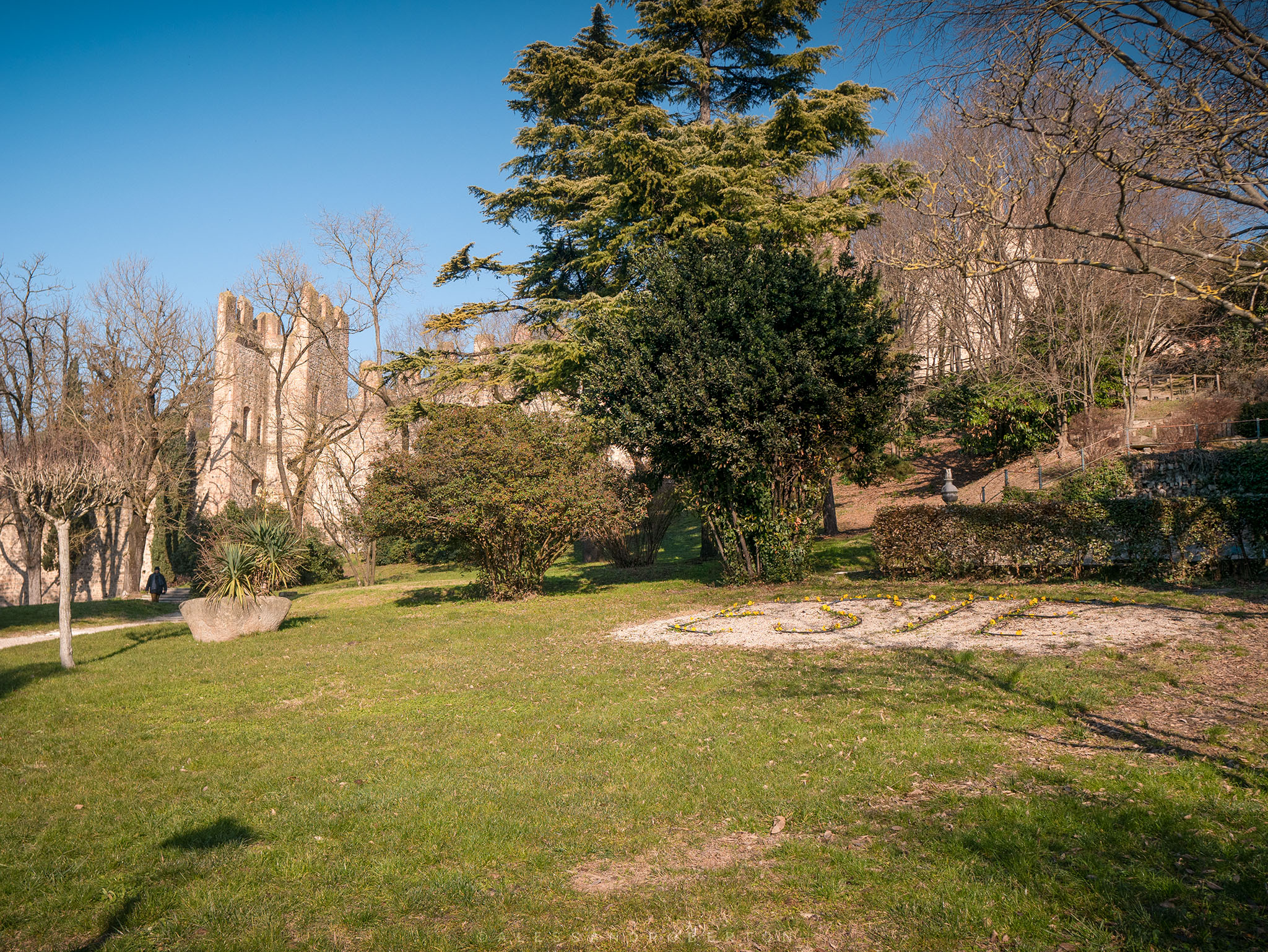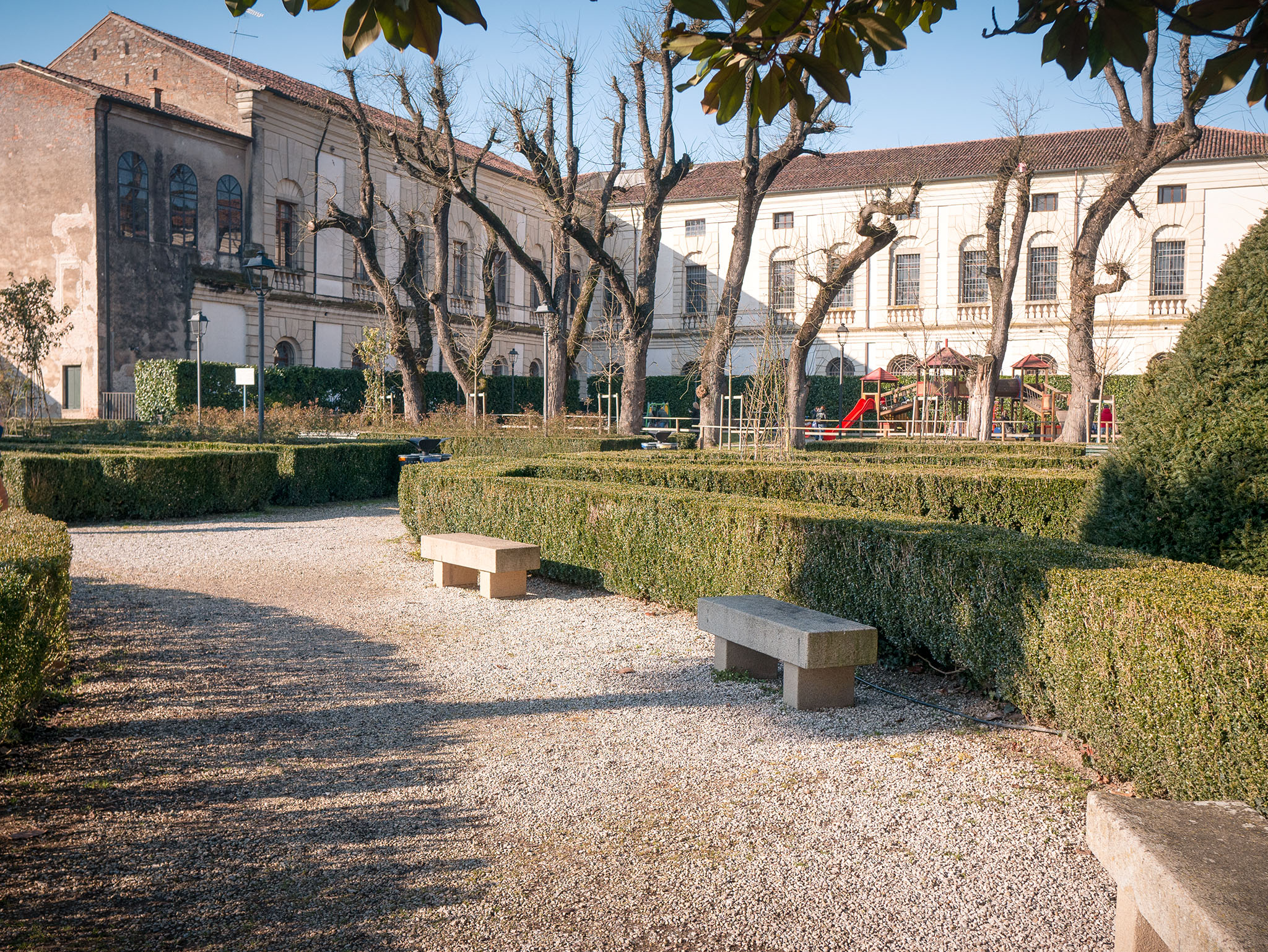Low walls and box hedges delimit the areas: an Italian garden, a public park with benches, old trees and paths leading to the highest part of the castle.