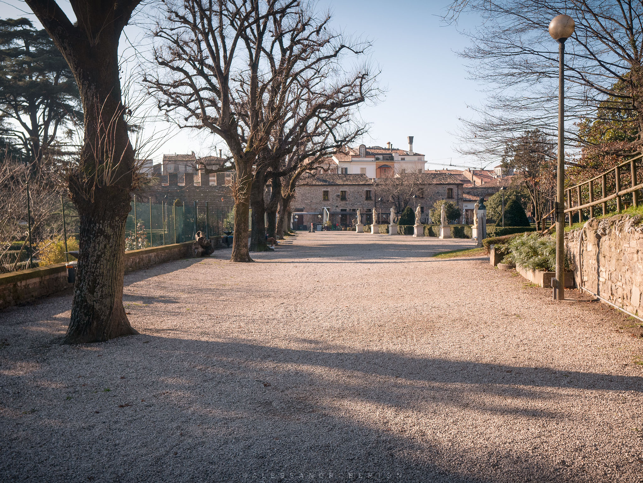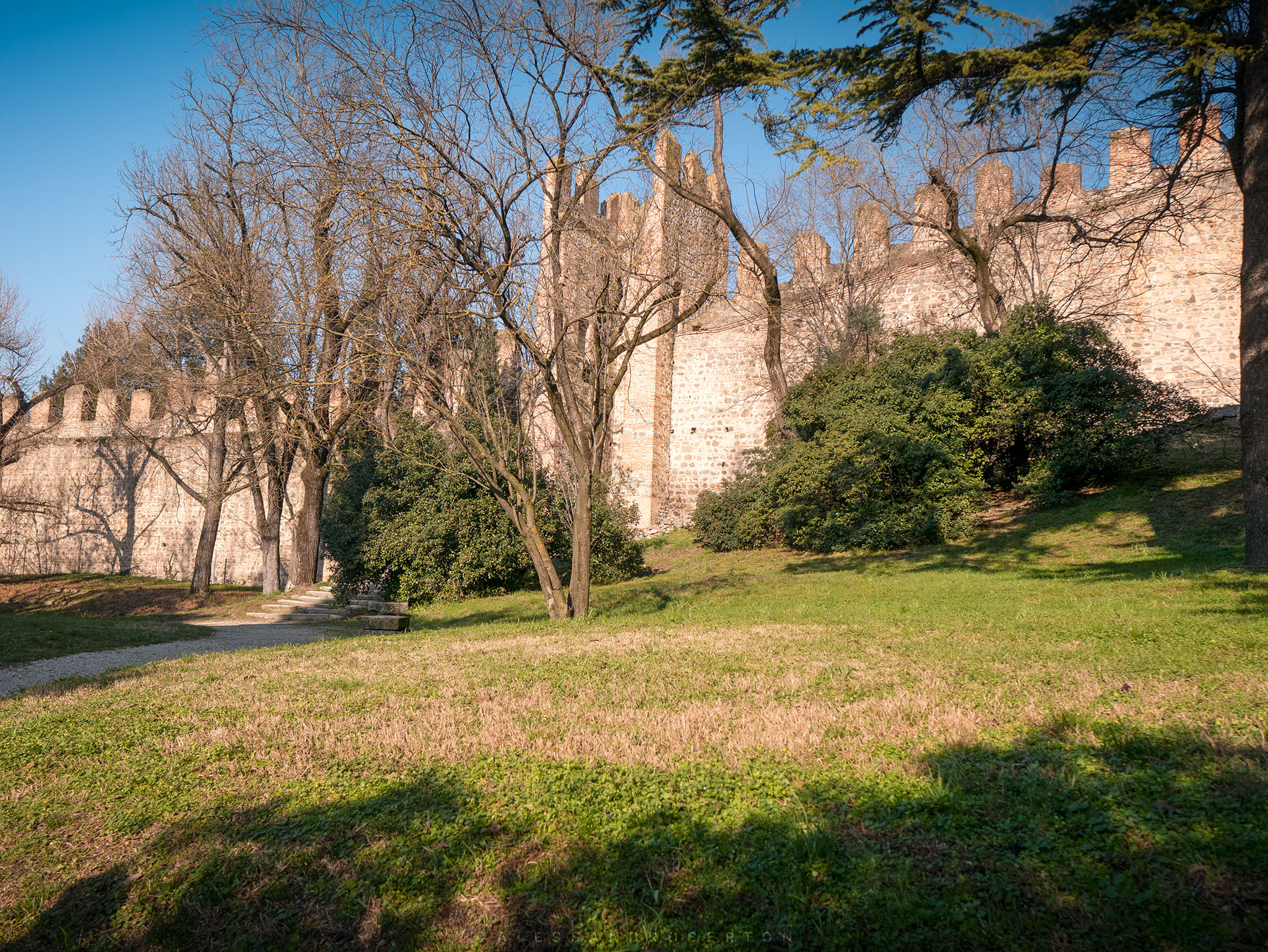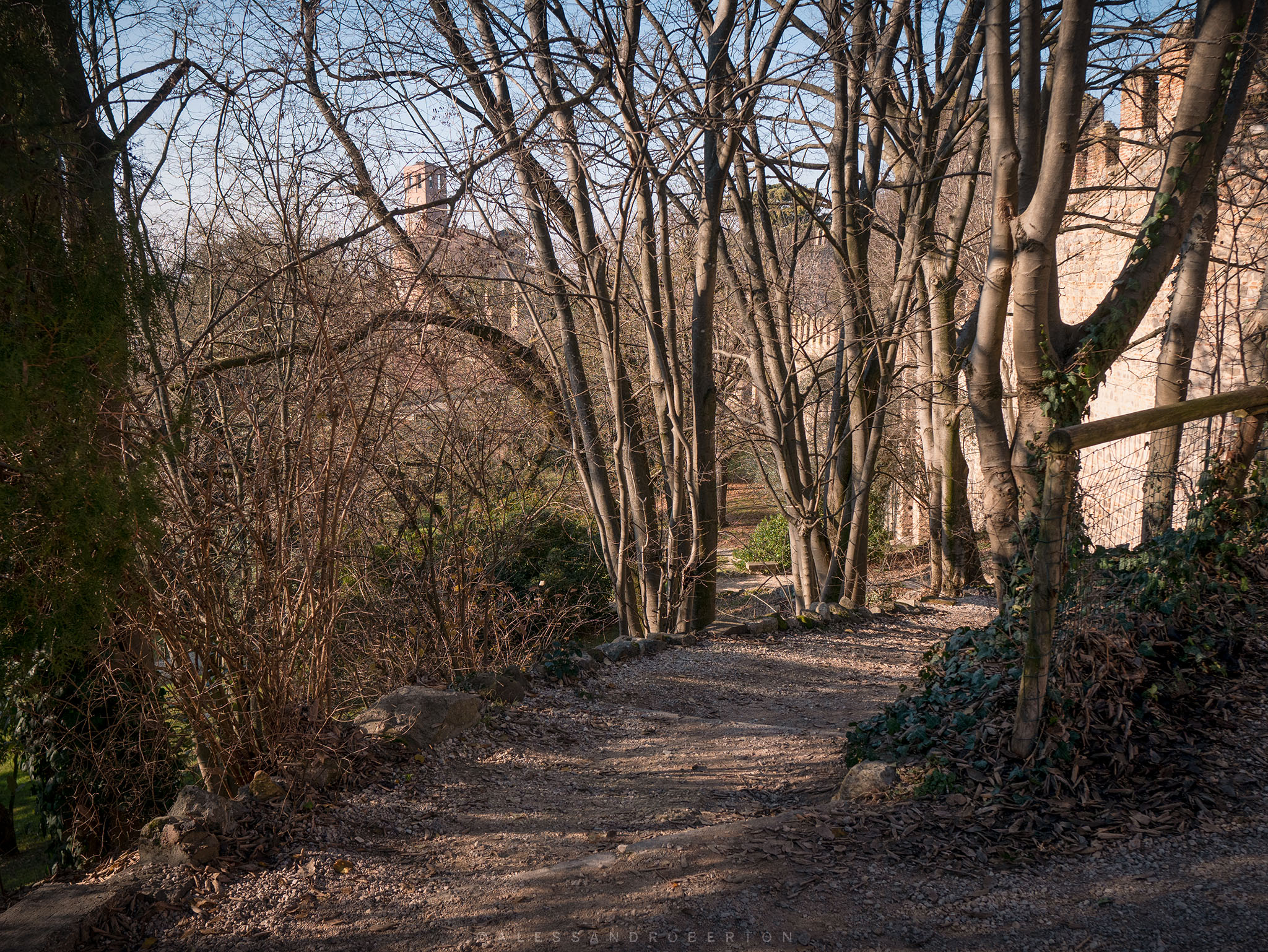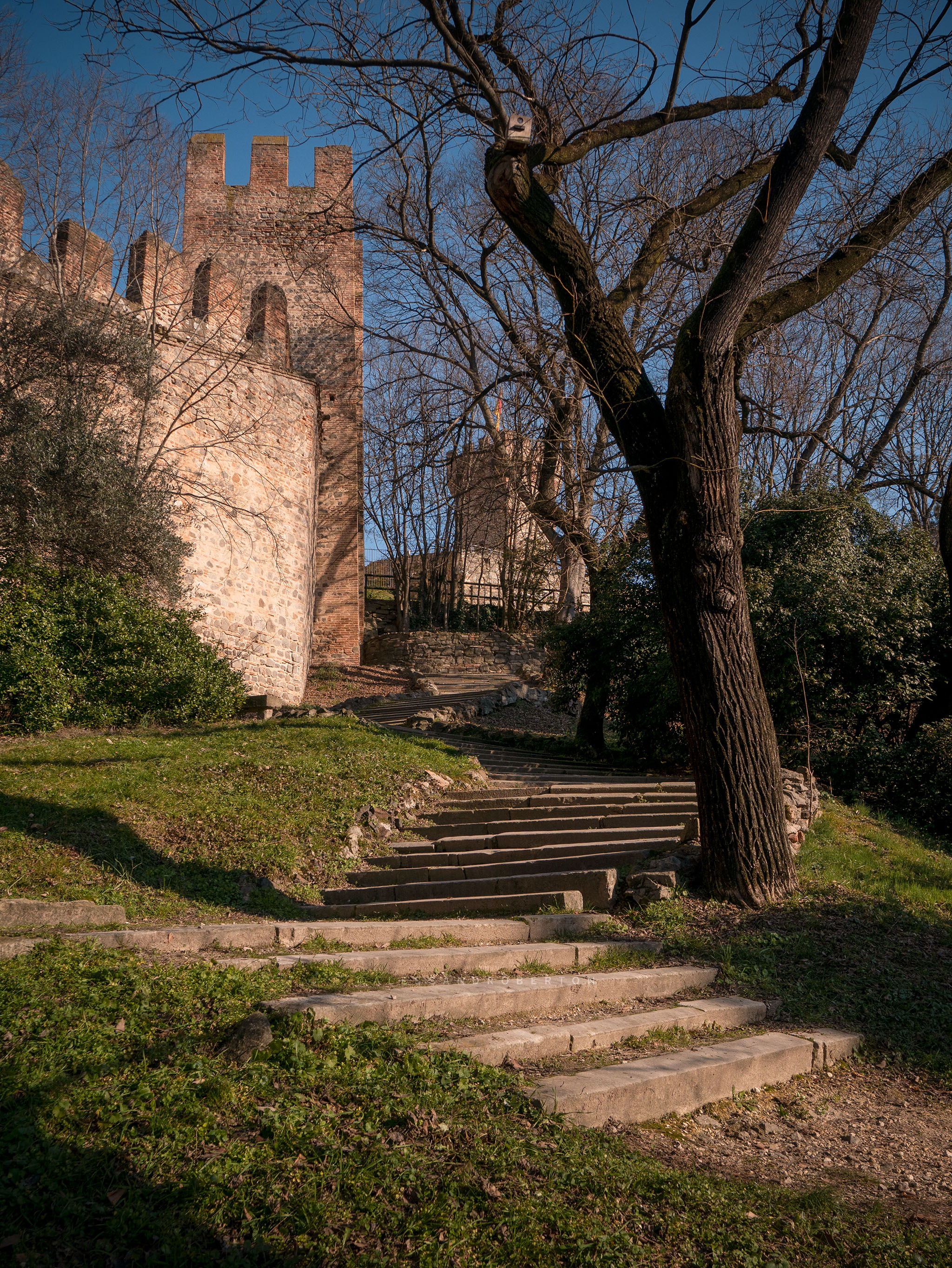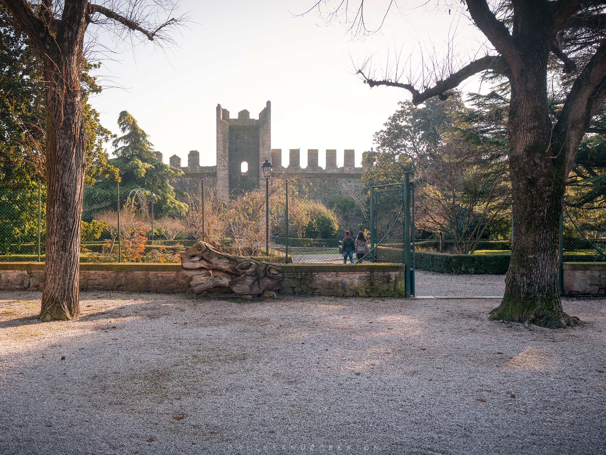 Low walls and box hedges delimit the areas: an Italian garden, a public park with benches, old trees and paths leading to the highest part of the castle.