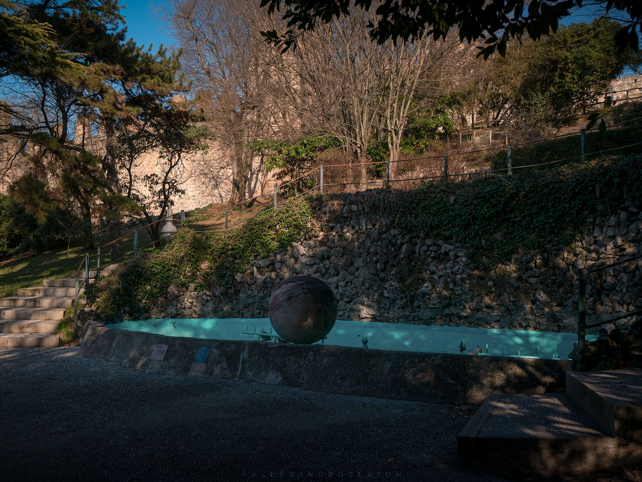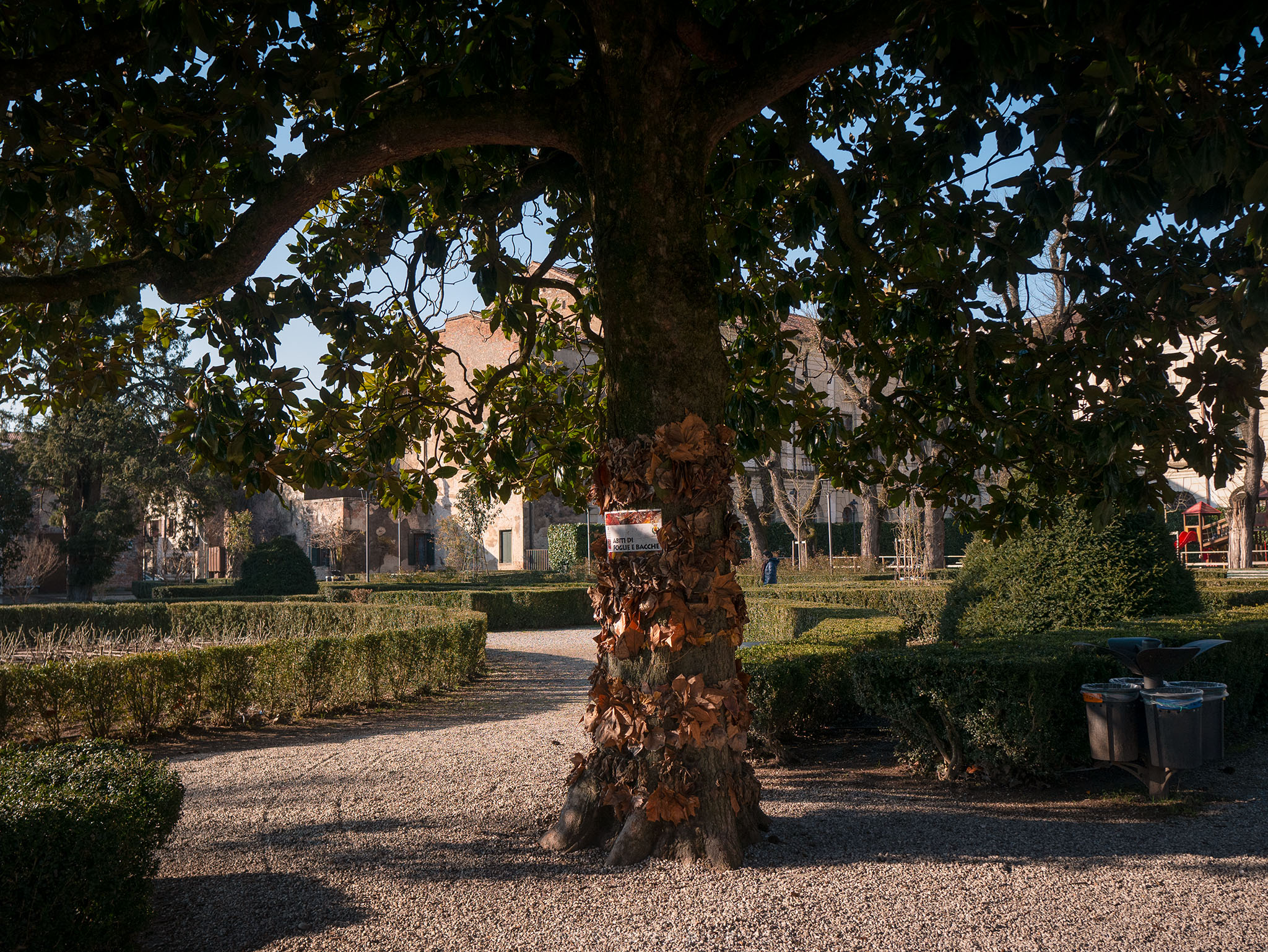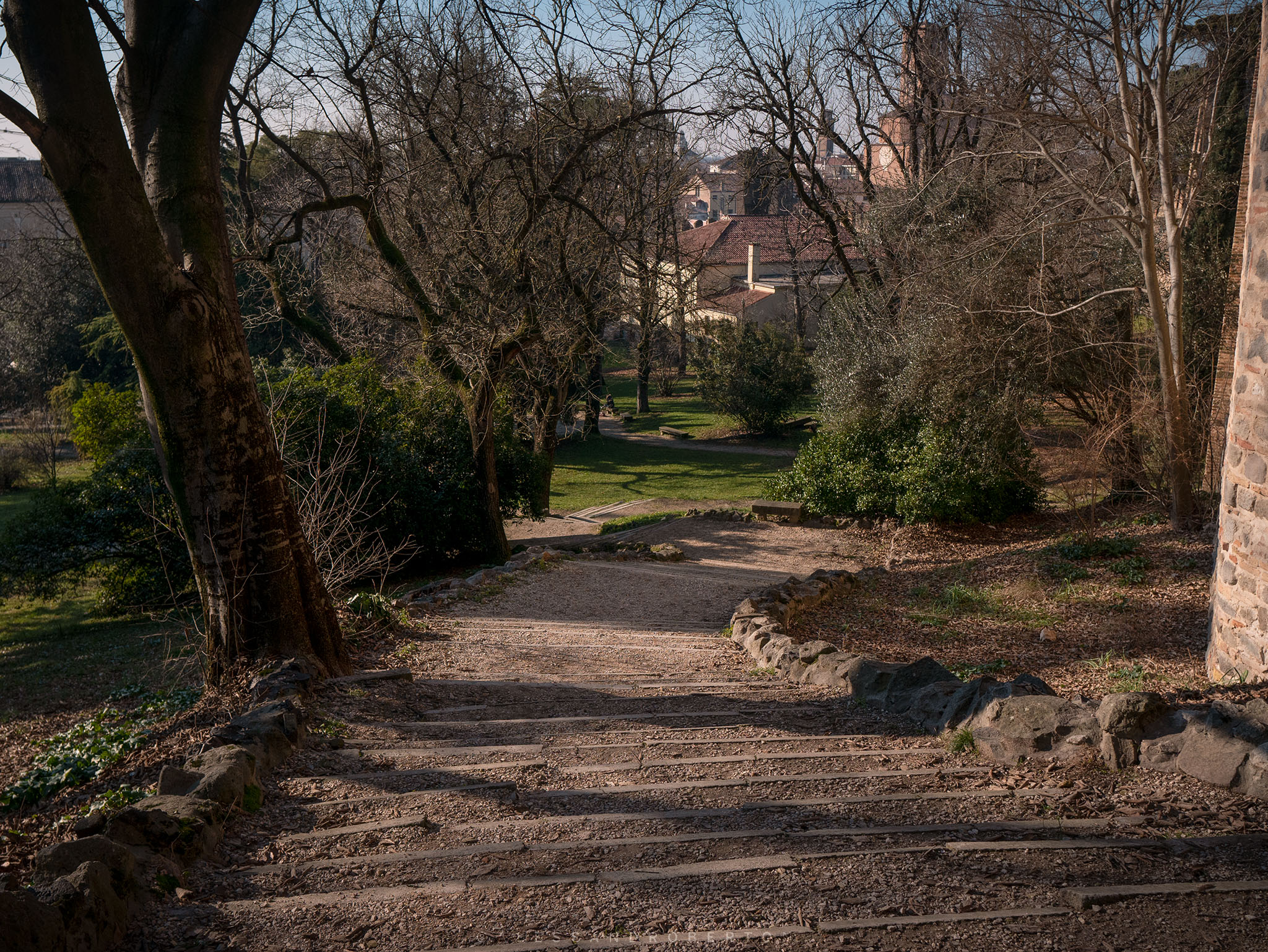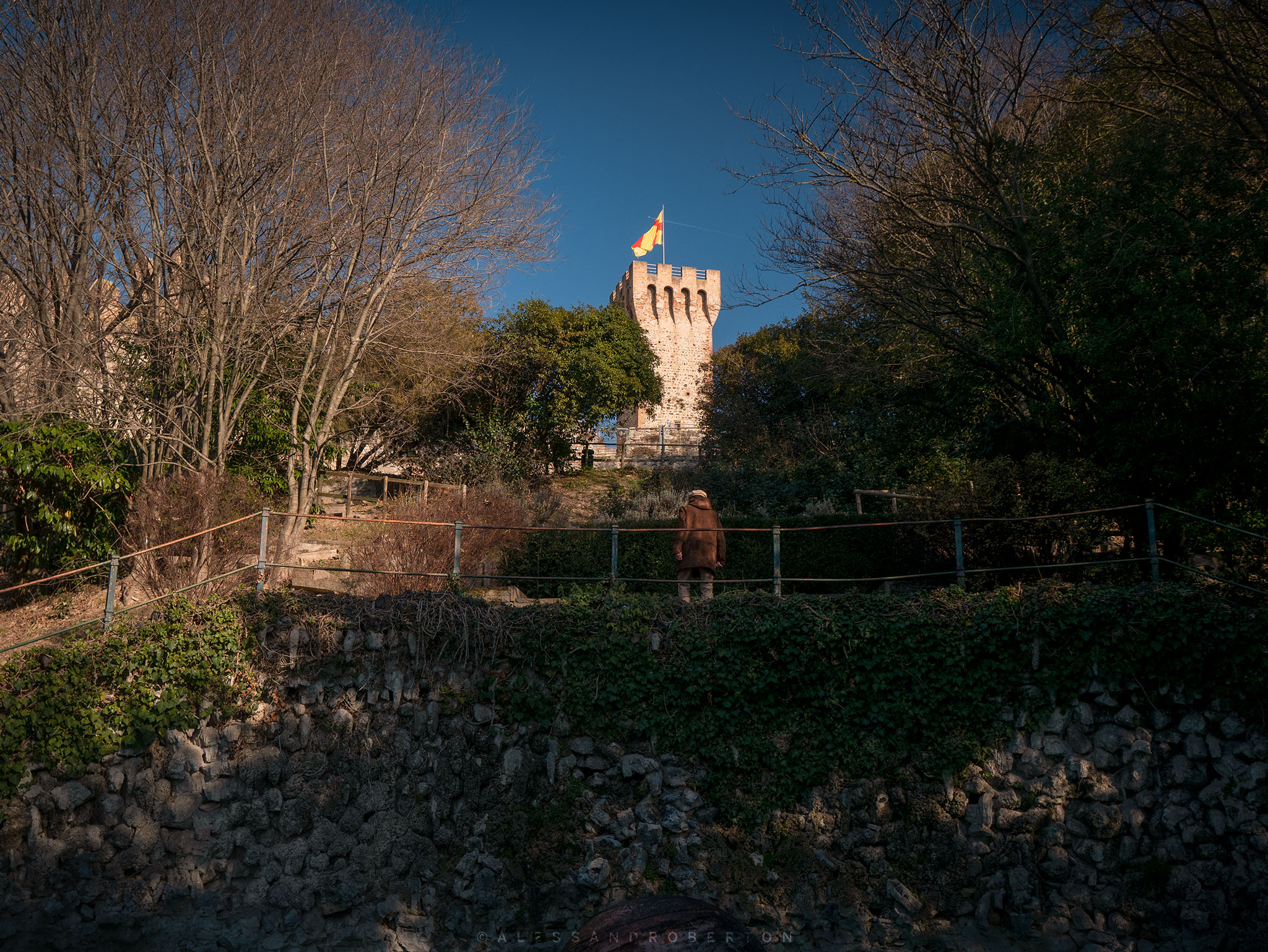 Low walls and box hedges delimit the areas: an Italian garden, a public park with benches, old trees and paths leading to the highest part of the castle.