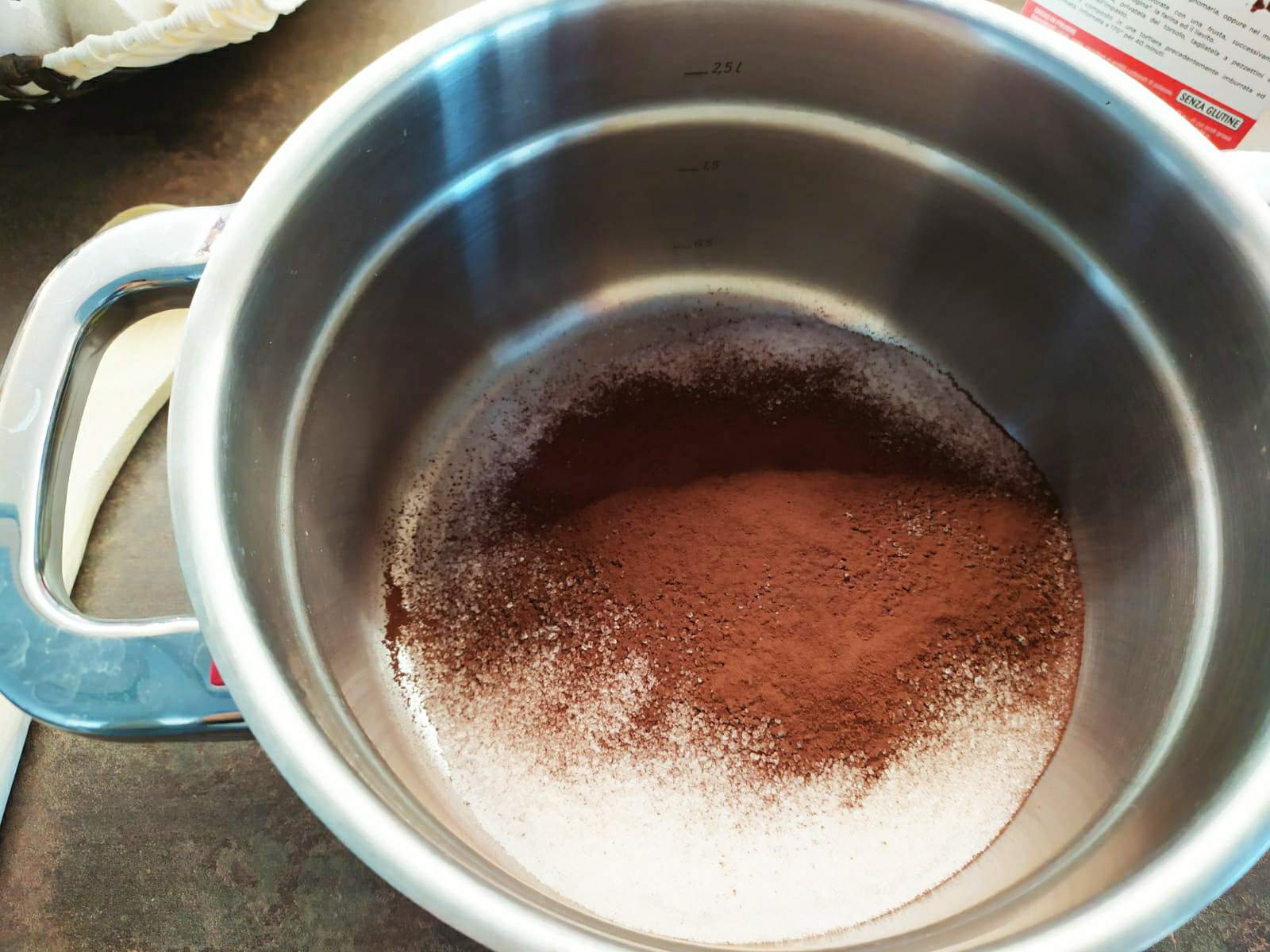 - Mescoliamo bene lo zucchero e il cacao amaro setacciato accuratamente. Più sarà accurato meno grumoli si formeranno.