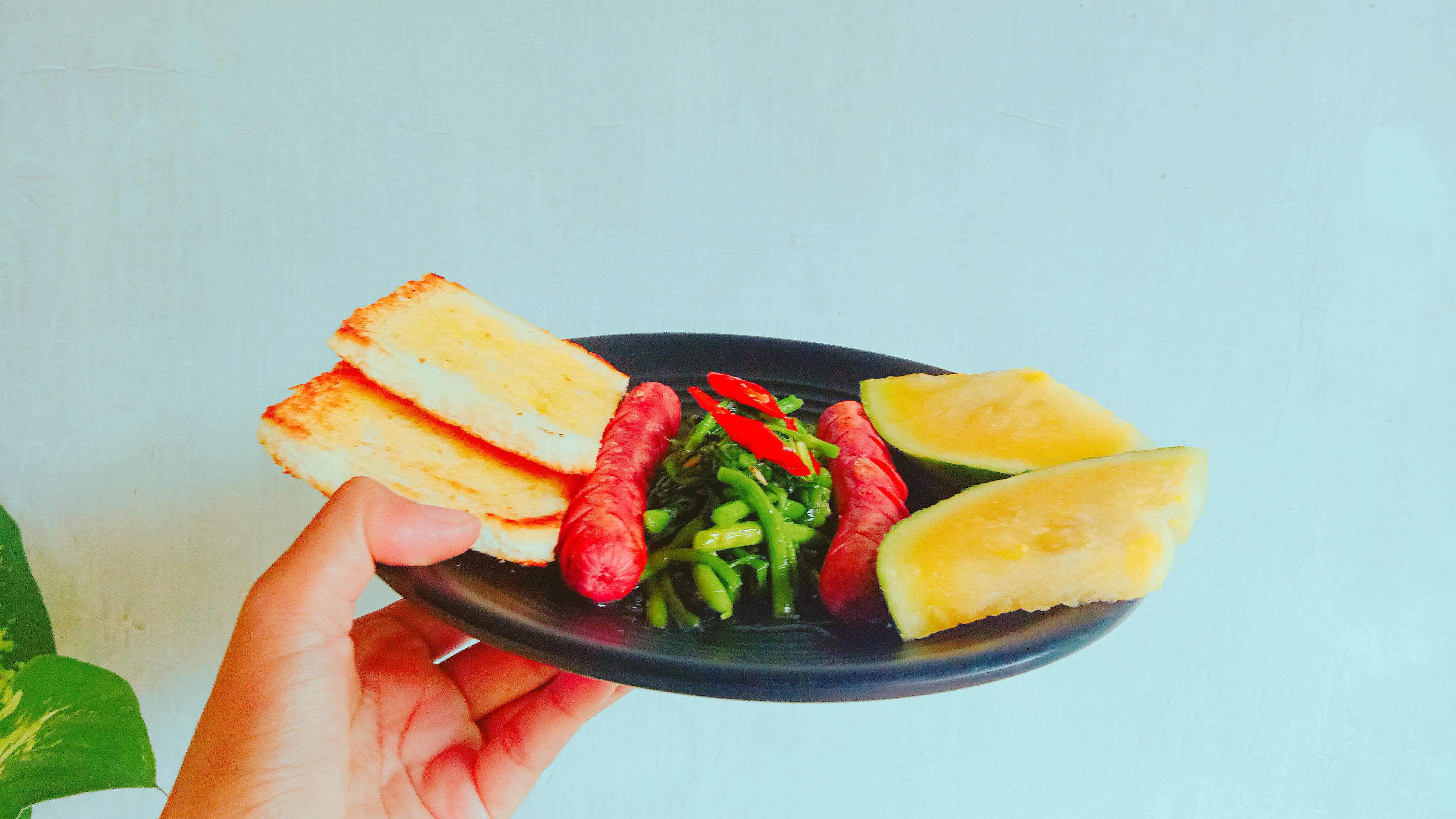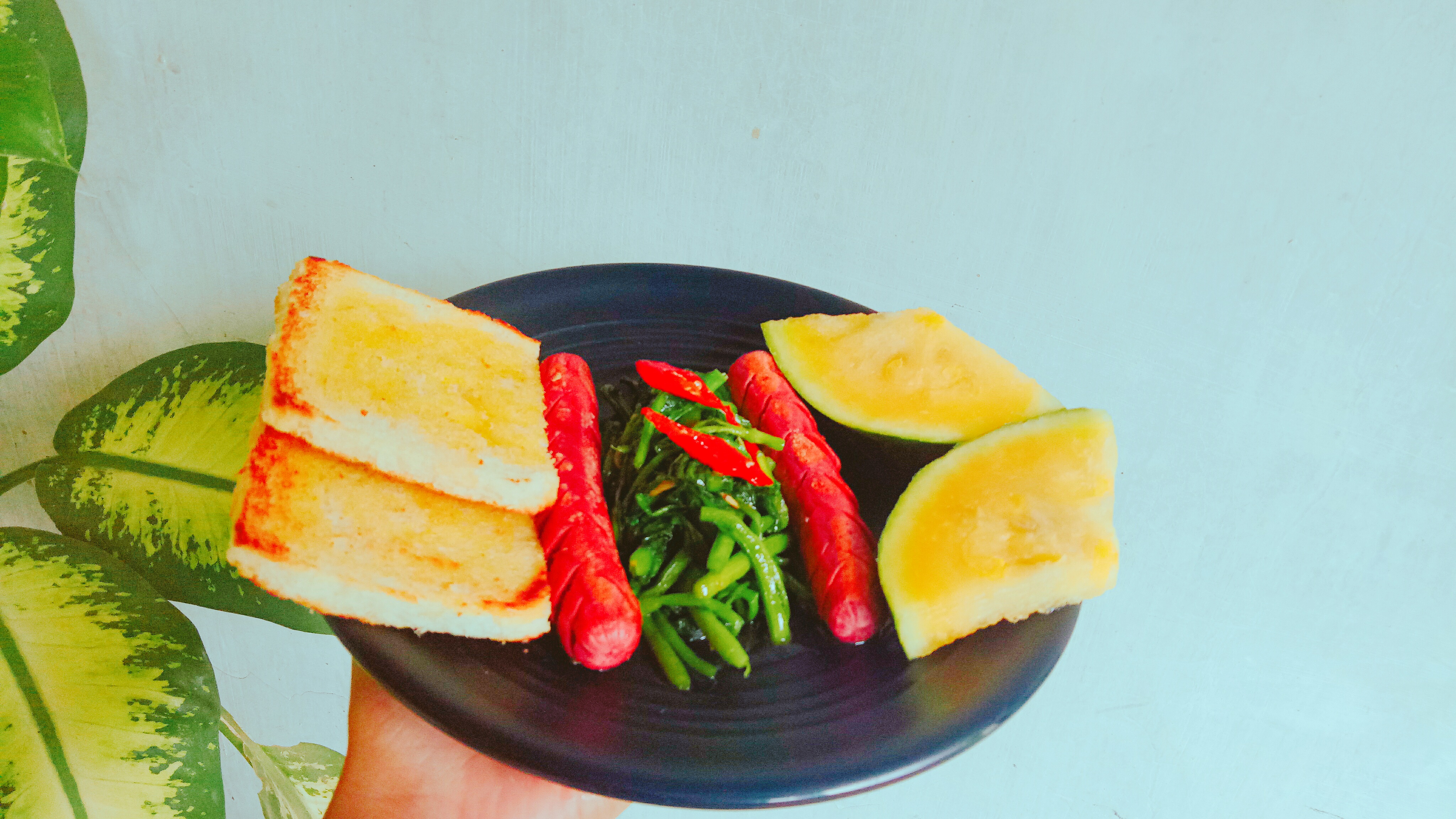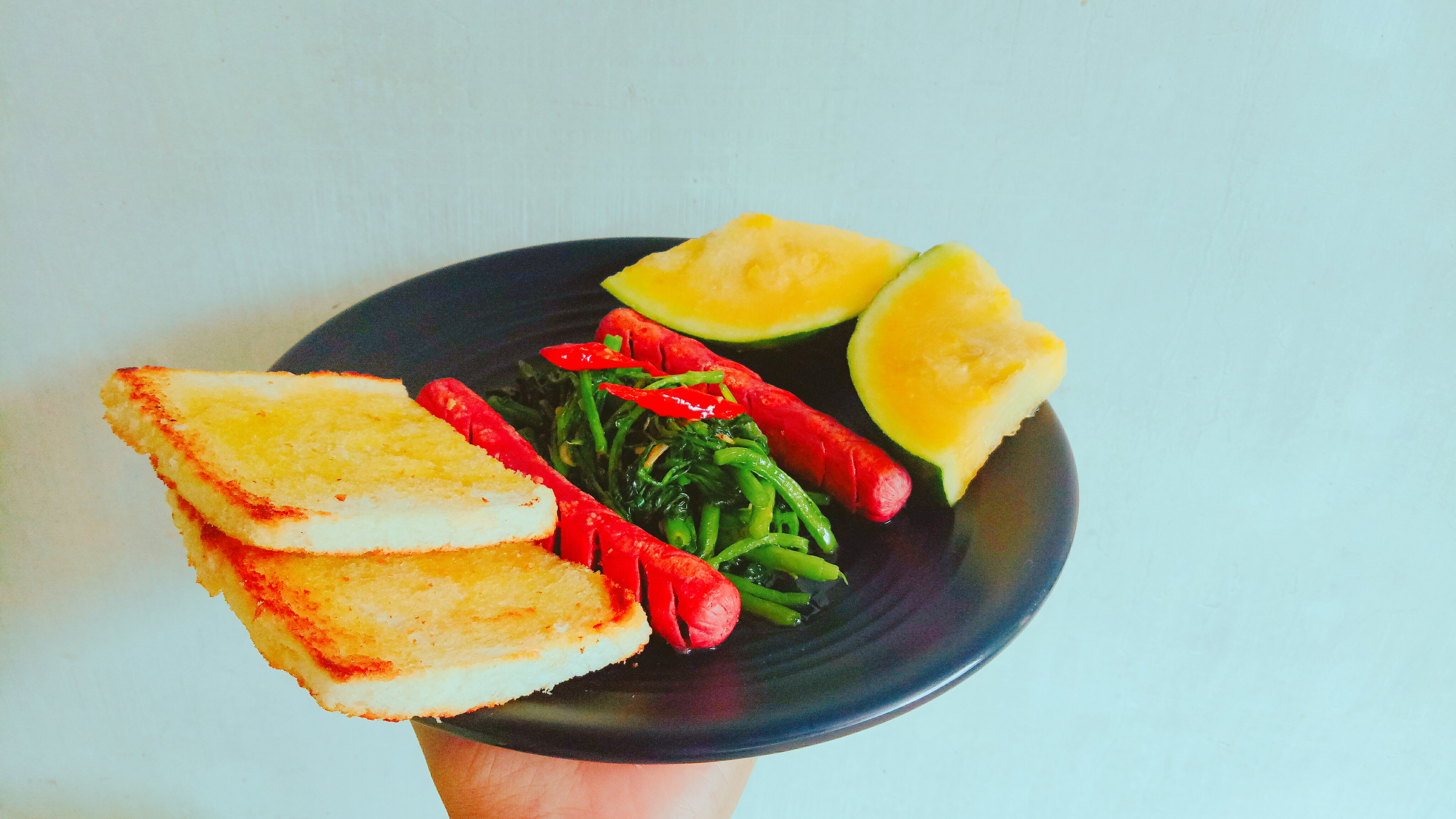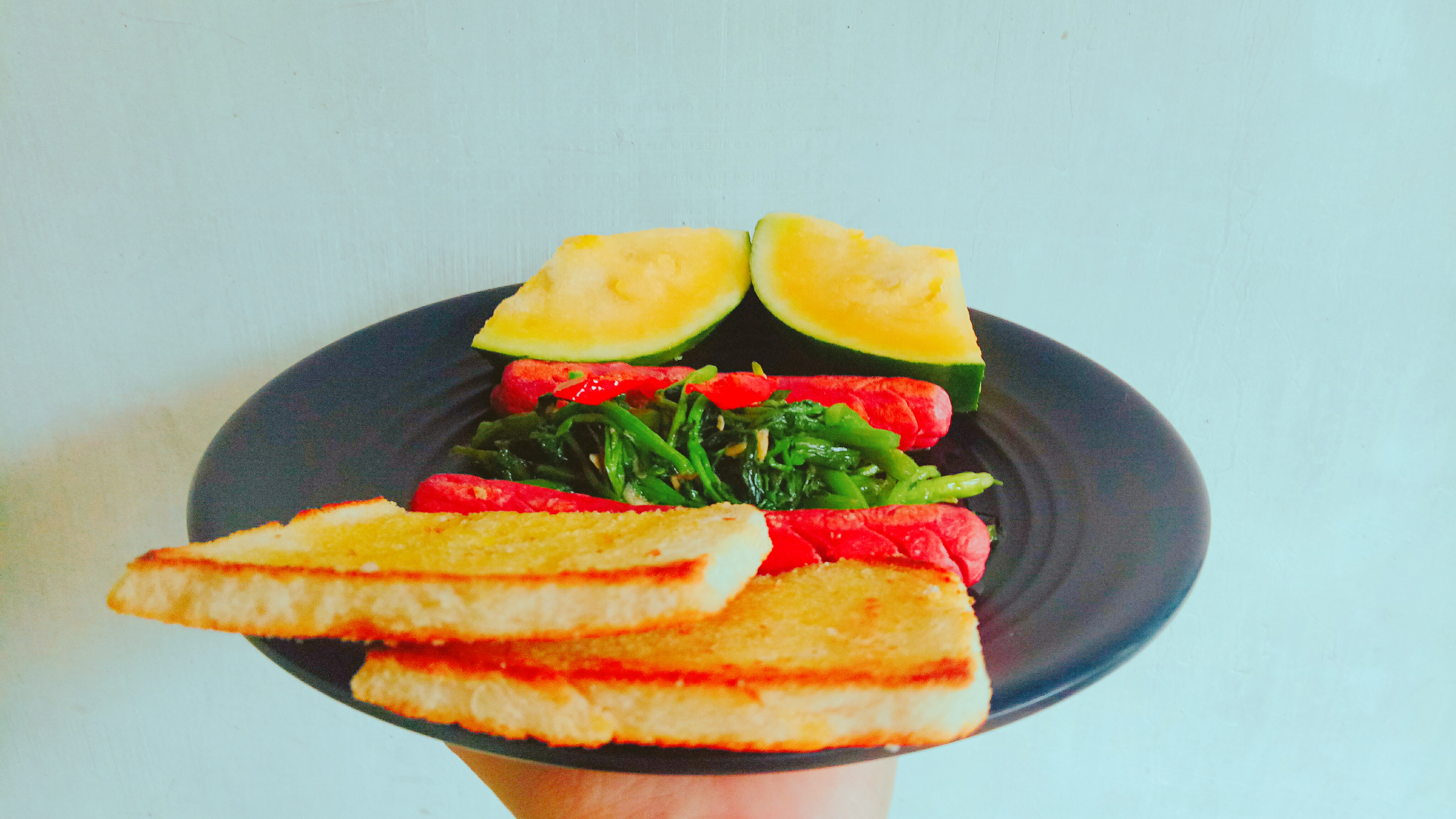 I combine toast, sausages, and stir-fried vegetables.