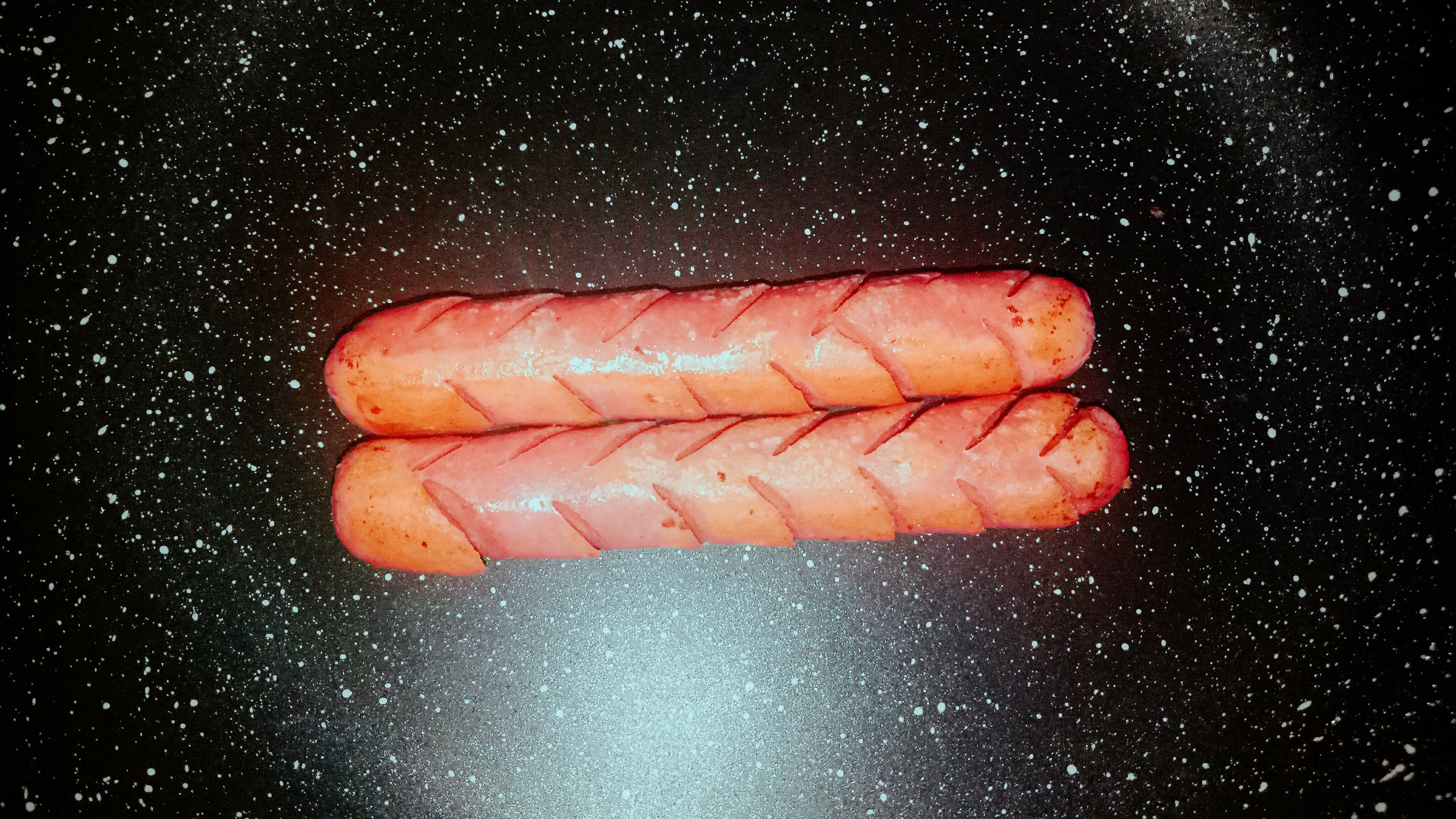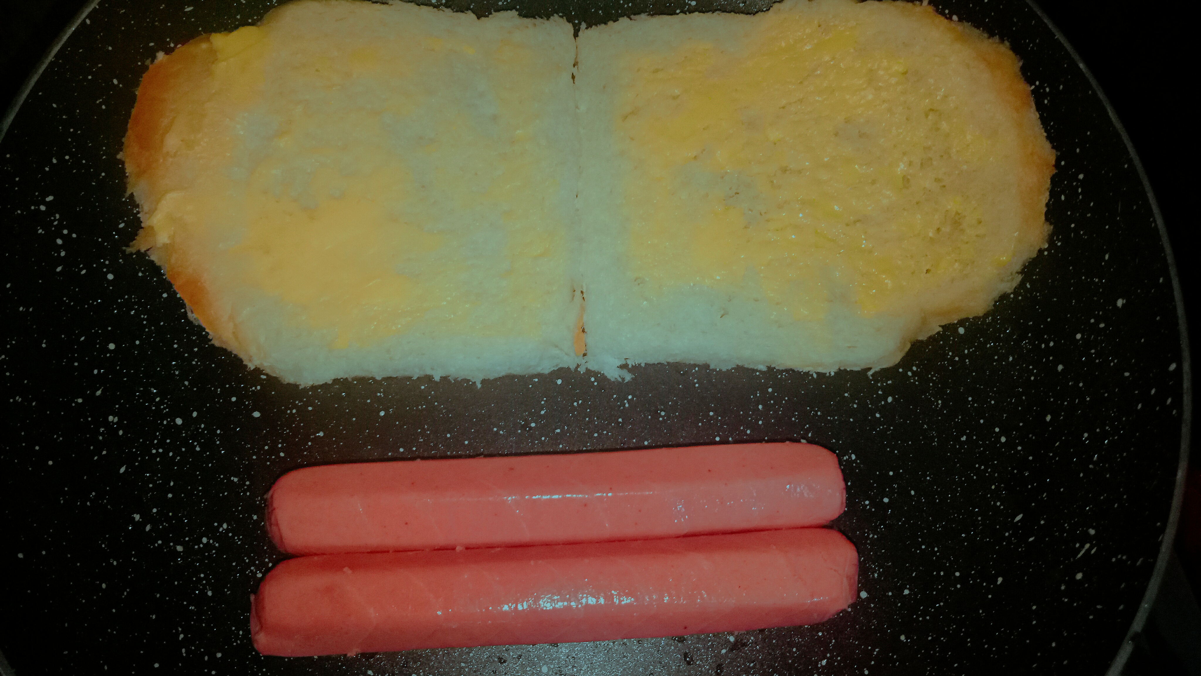 To save time, I cook sausages and bread in a pan at once.
