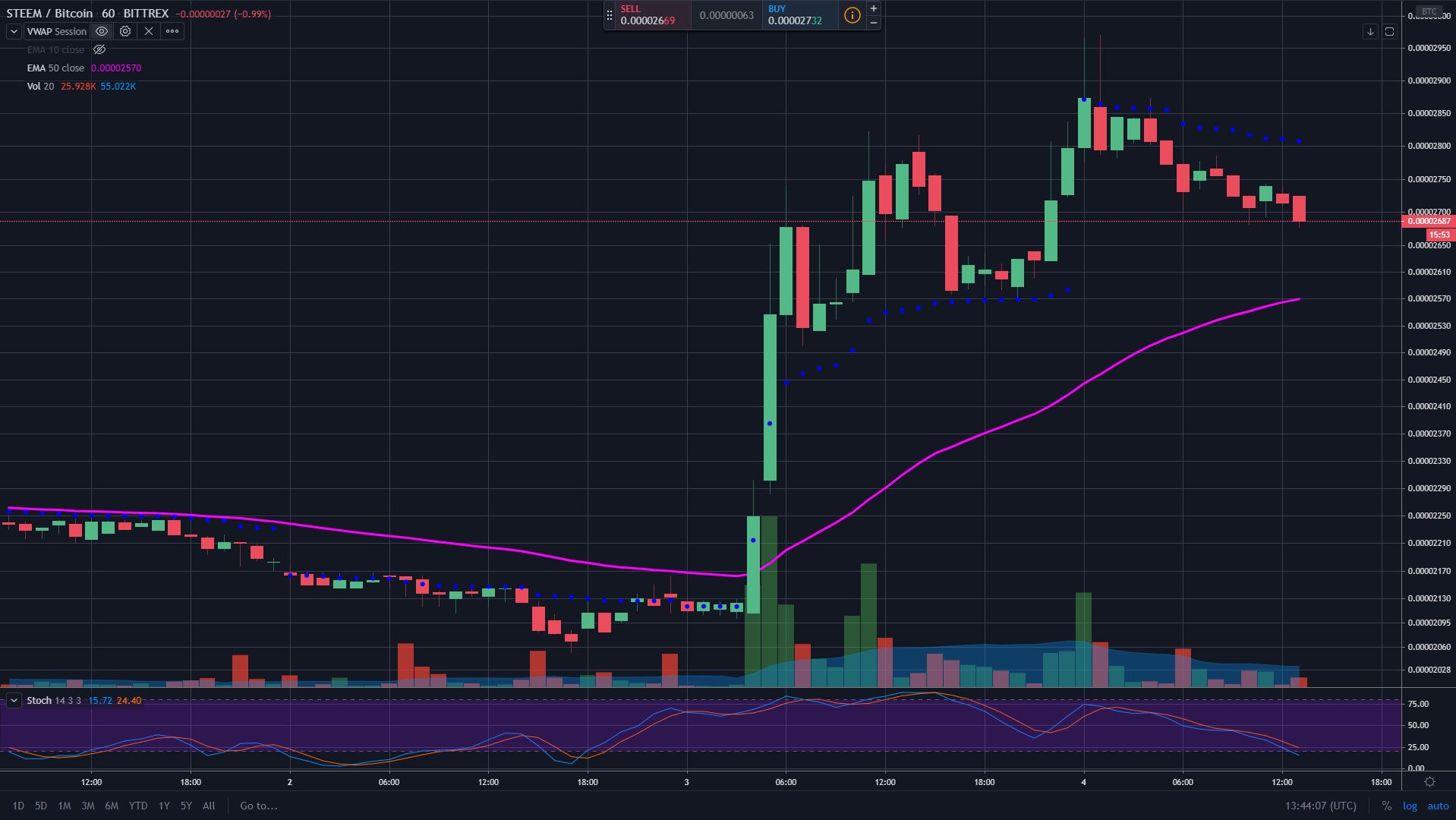 On the hourly chart the price jumps are clearly visible. The first 3 bar push took the price from 2100 satoshis to 2700 satoshi. The the move paused a bit to catch up with VWAP (volume weighted average price), which is shown here in blue dots. The using VWAP as a base, two smaller rallies pushed prices up to high 2900 satoshi range. After that volume dried up, so the prices began to stall below the VWAP. It is currently trading at around 2700 at the time of this writing.