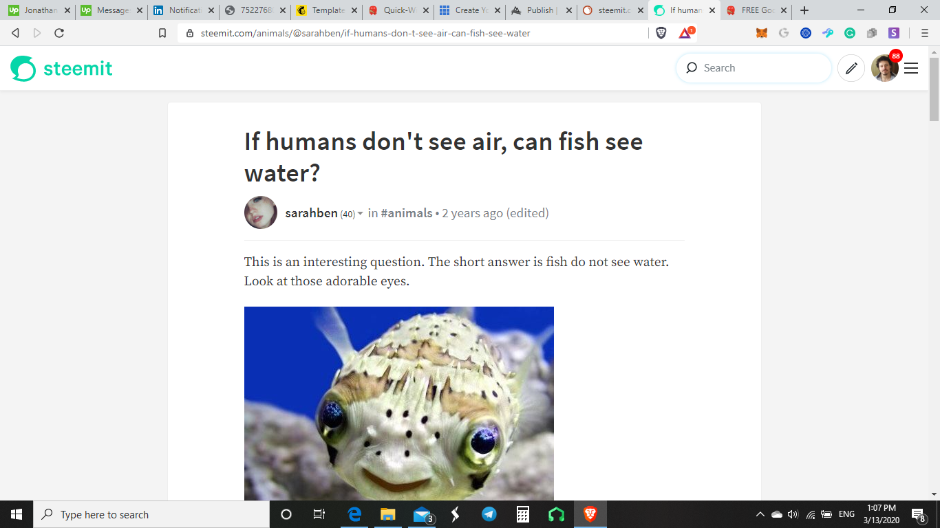 An article called, "Can Fish See Water," written by @sarahben, is #5 on the list for driving traffic to Steemit.com!