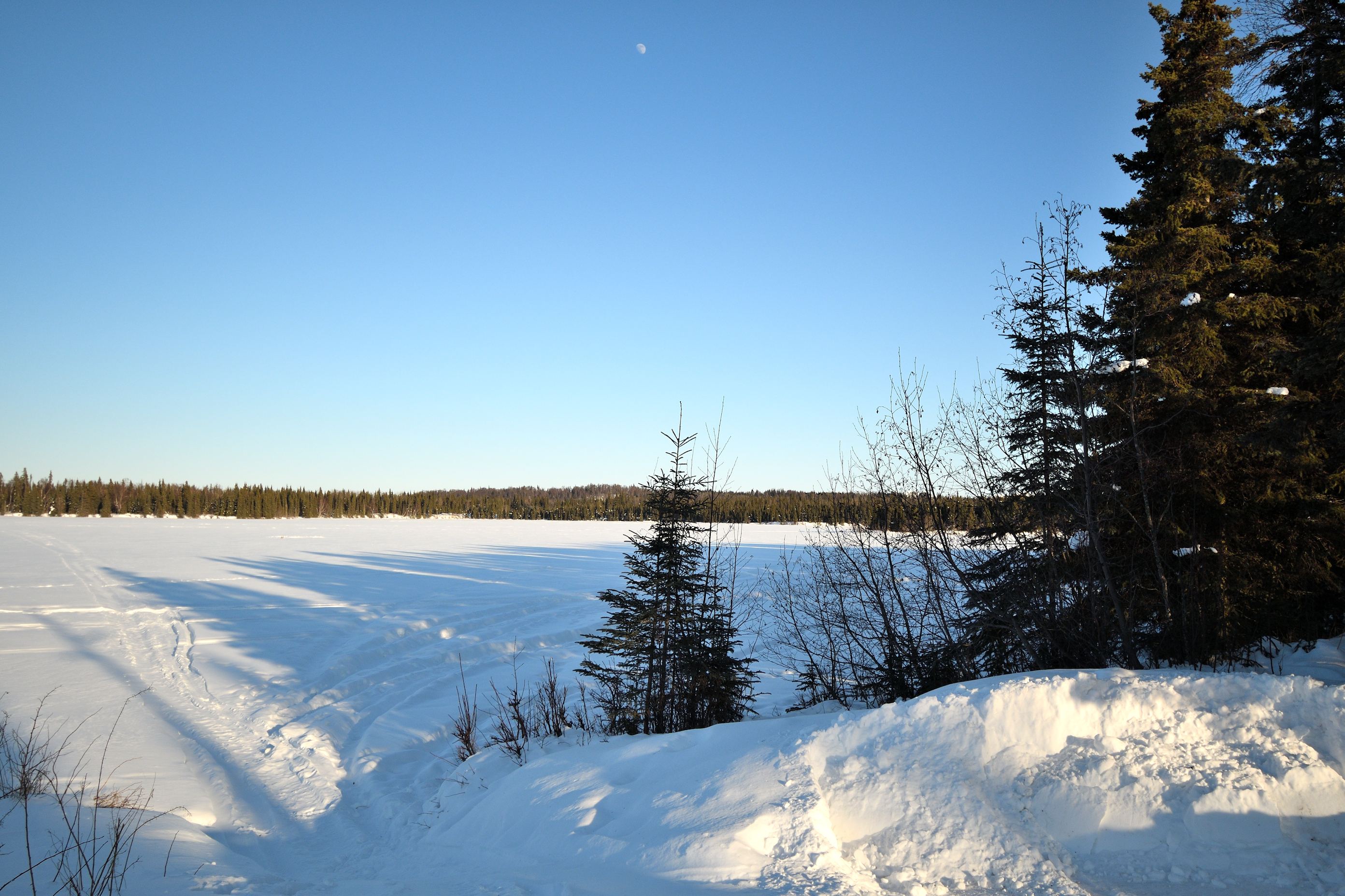 Long tree shadows, snow mobile tracks, and the moon still high in the sky. It is hard to believe that in a couple of months there will be a lot of lilies in the lake and nice clear blue water. It will still be cold but at least the snow will be gone, and the single digit temperatures at night will be done with.