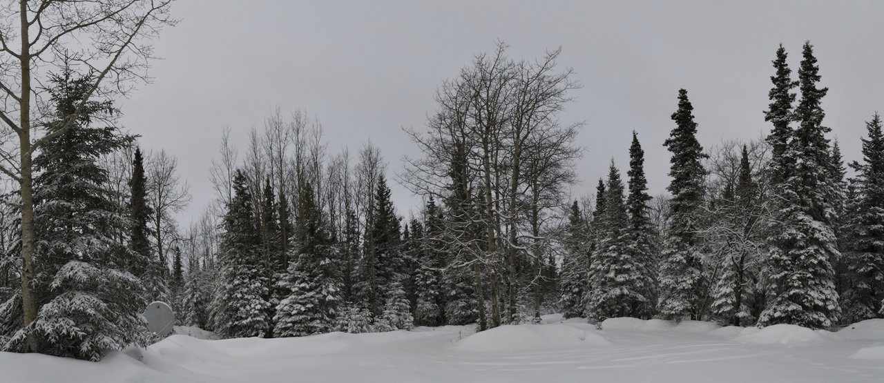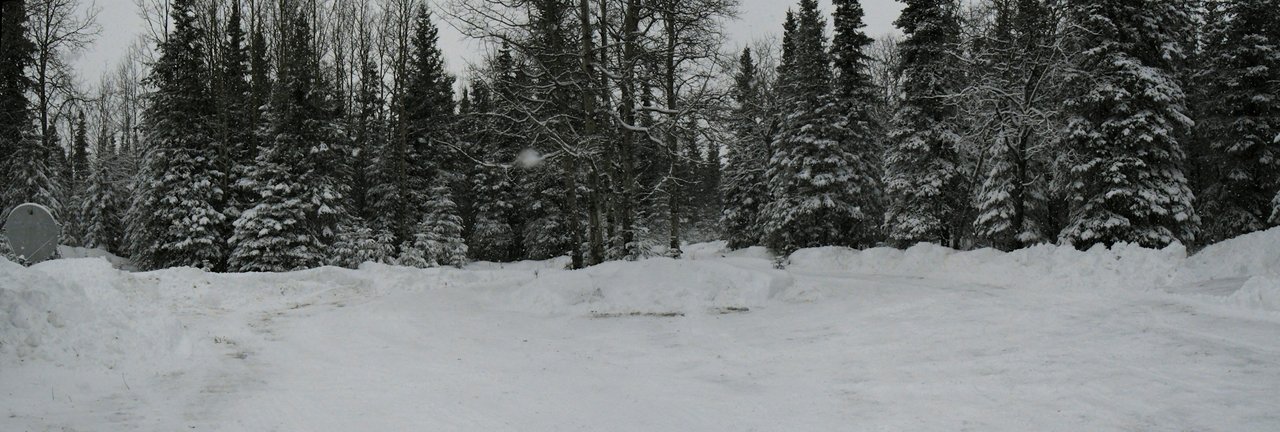 Panoramic time, pre-plowed driveway first. This is six images, three lower and three upper ones stitched together with the "Autostitch" program from Canada's University system. Like I said it was overcast all day, at least for the pre-plow shots it was not snowing so I was able to sort of take my time. Everything so smooth out there.