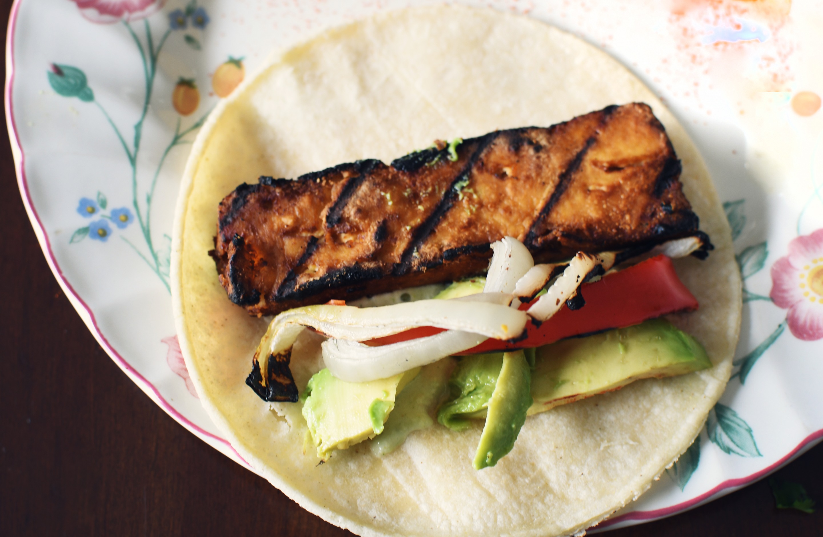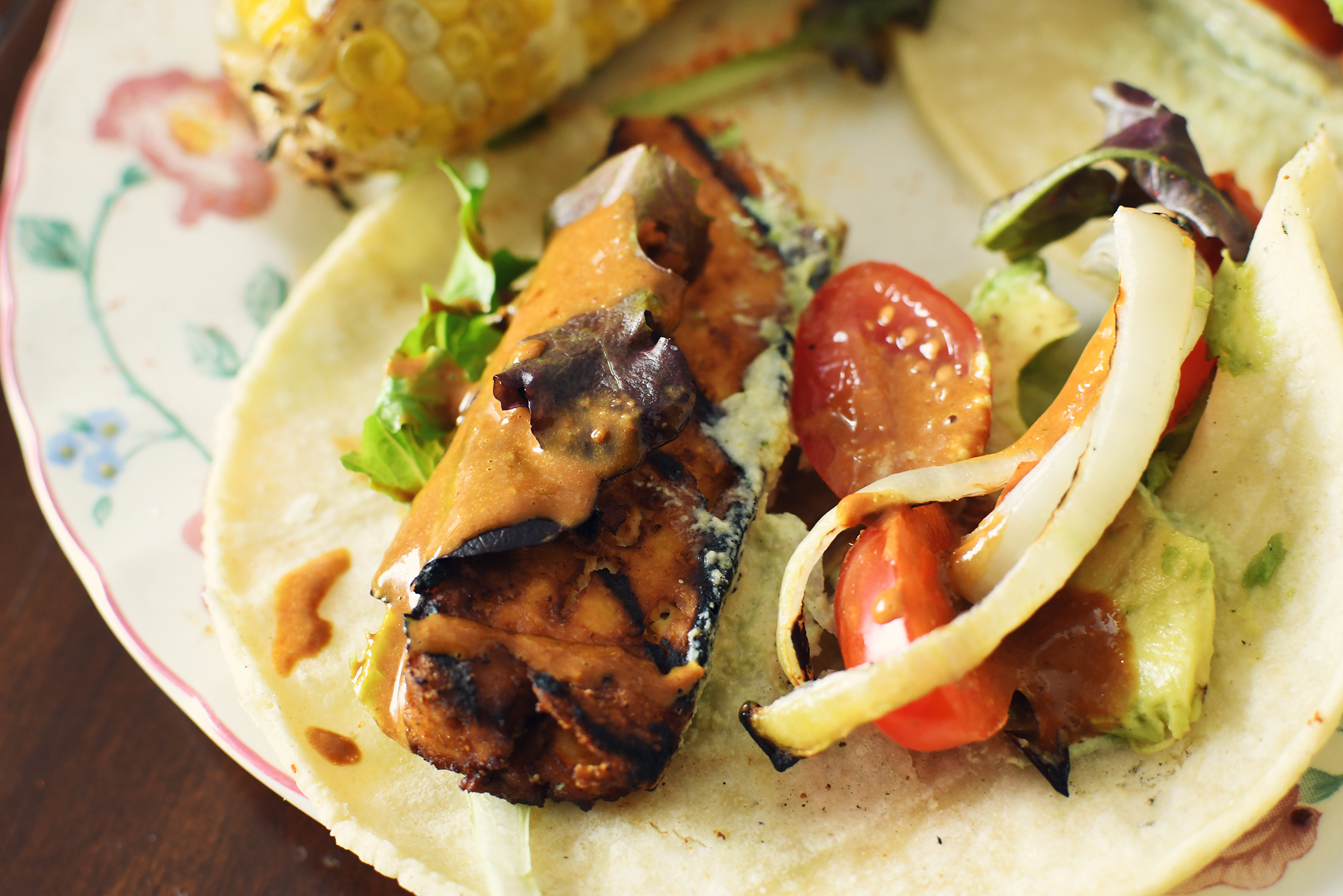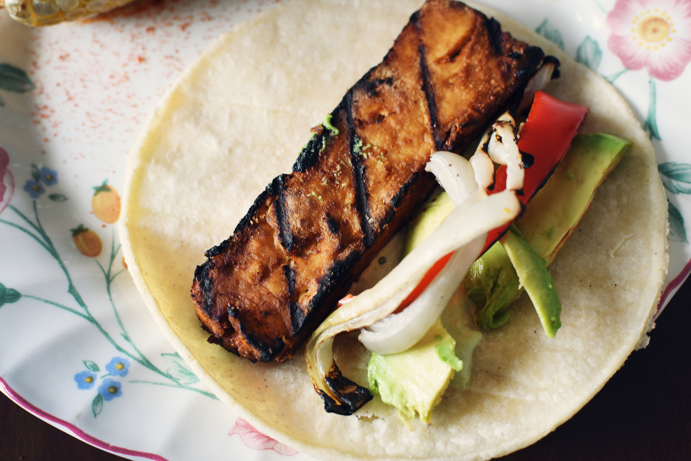 Today we grilled some tofu in order to make tacos with. I marinated it in the same sauce which would be one of our sauce options to put on the tacos and the corn. I marinated and basted in a peanut sauce but no ginger which would have made it taste like an Asian peanut sauce, and I was going for more of a Mexican theme. Not that I recall peanut sauce in Mexico but there are peanuts and lime so why not make a peanut sauce.
