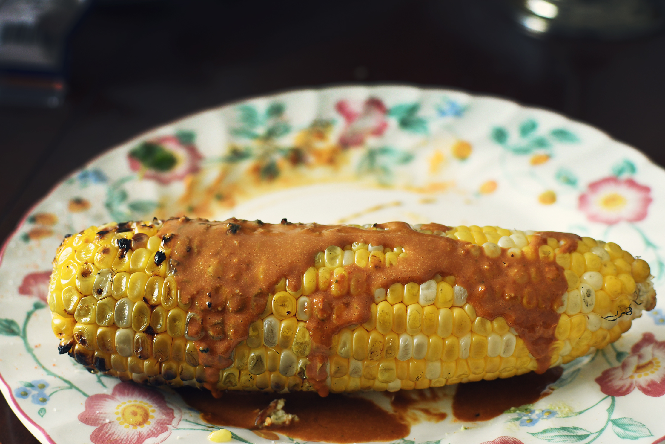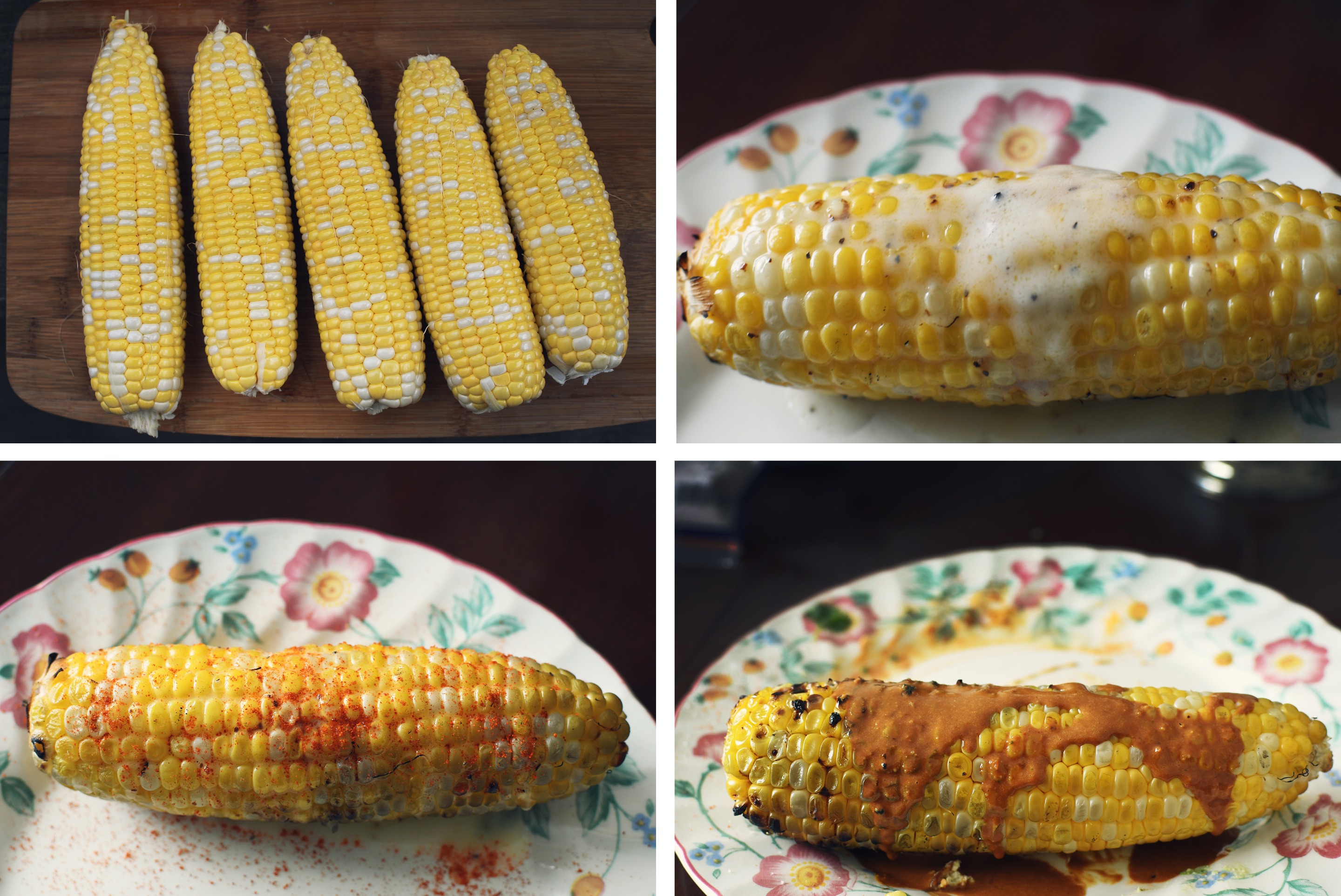 When I was in Mexico I saw that it was popular to barbecue corn on the street and sell it. I never did get it but I noticed that they had a creamy butter or sour cream and mayo to slather all over it and usually chili or chili sauce on top of that.