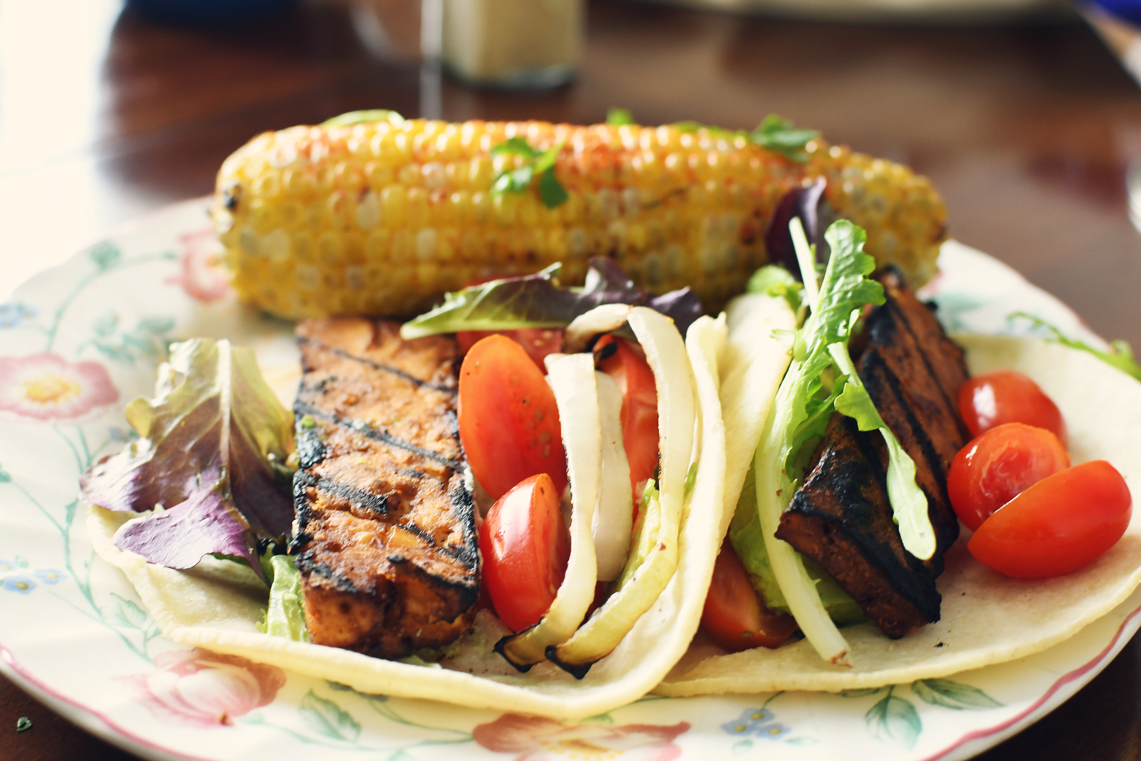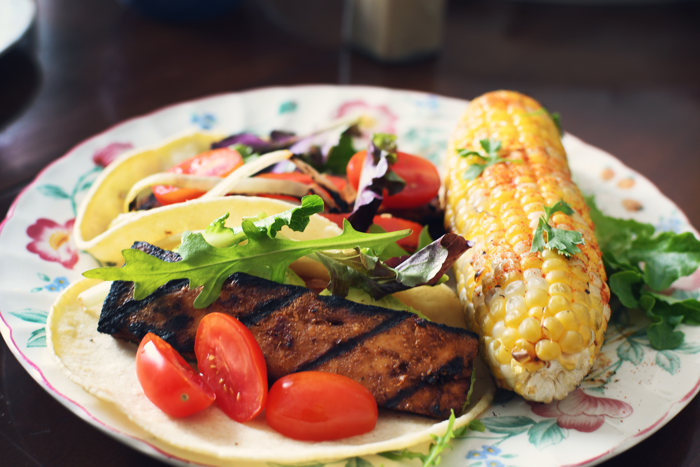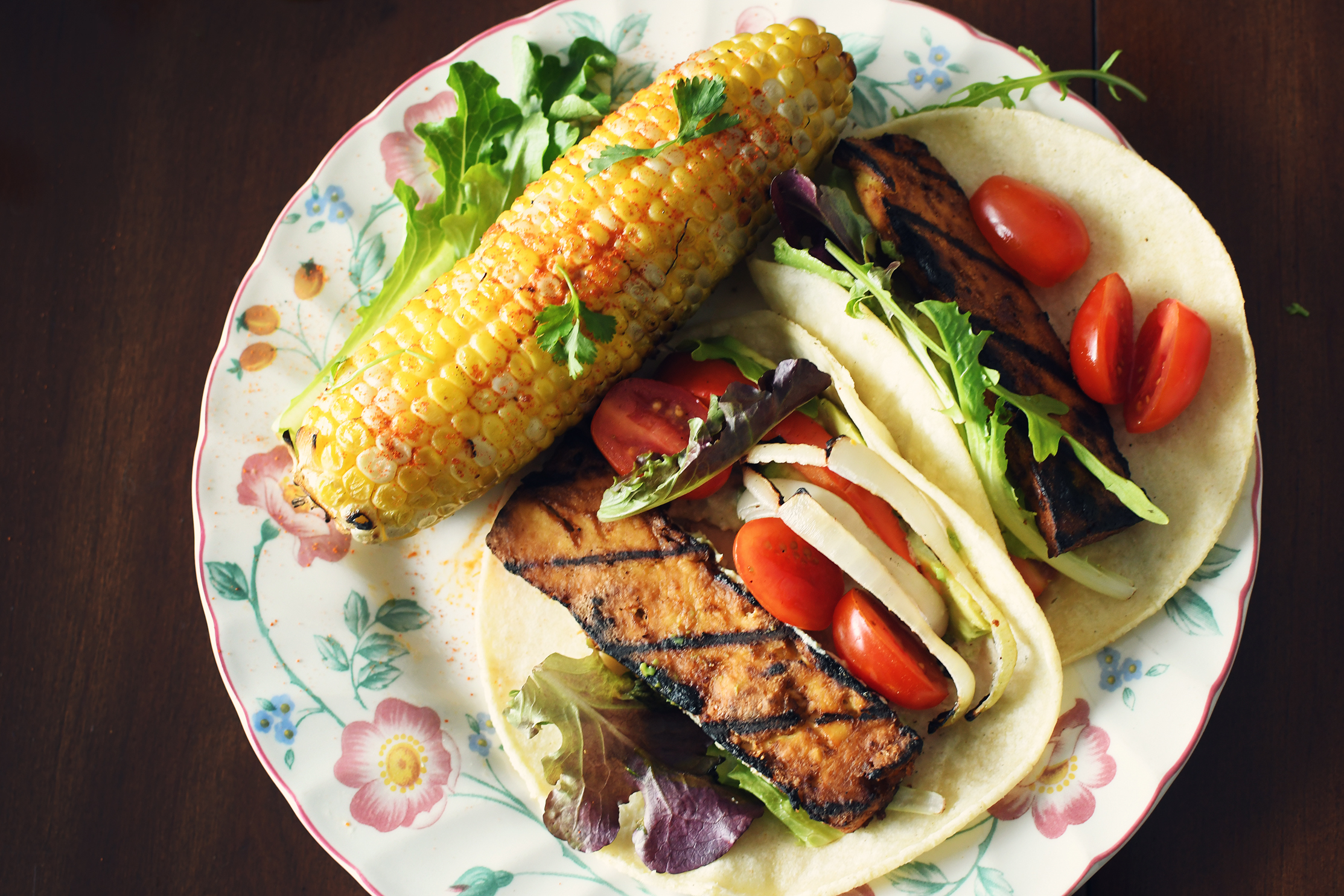 Vegan Barbecued tofu tacos and corn on the cob with three sauces