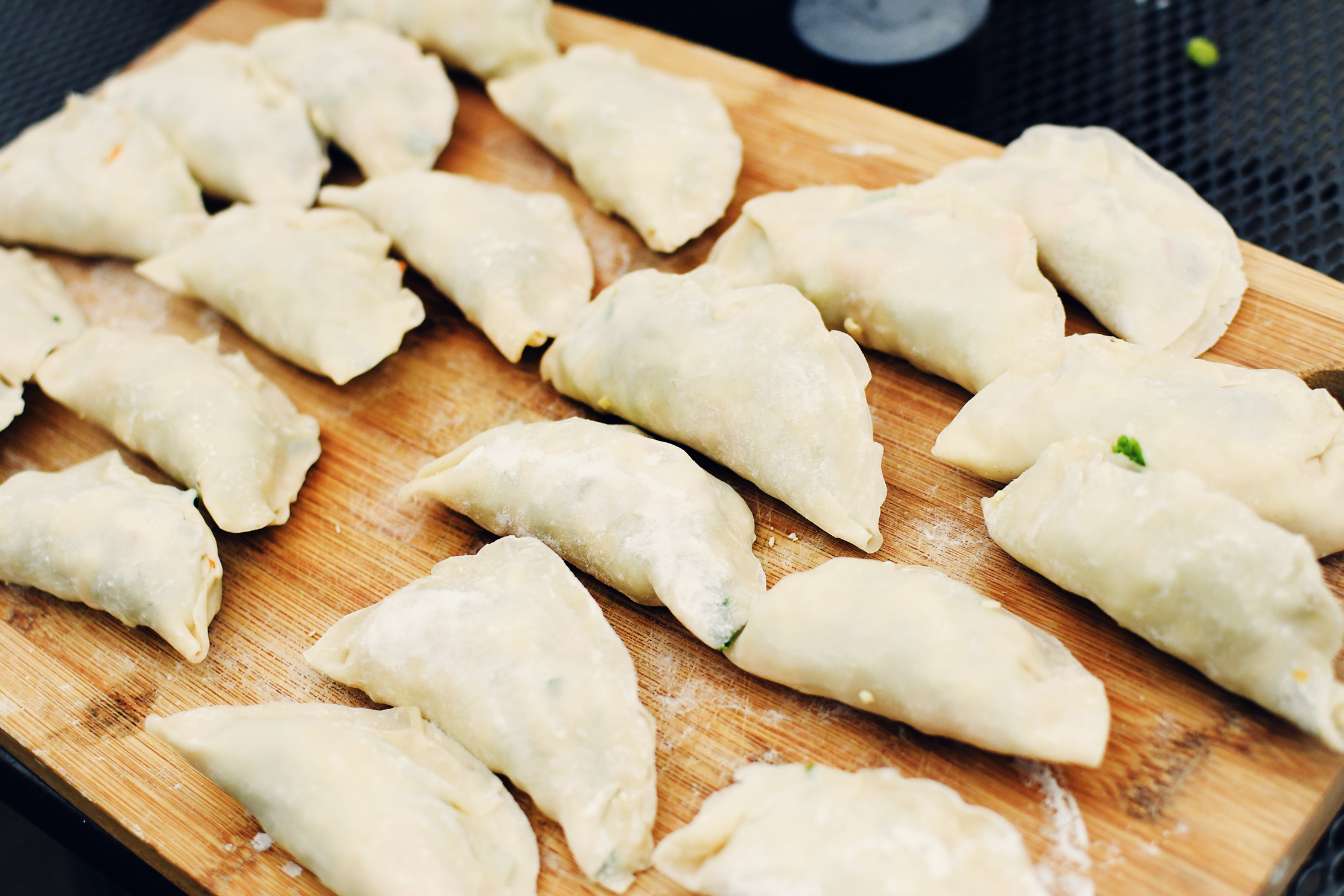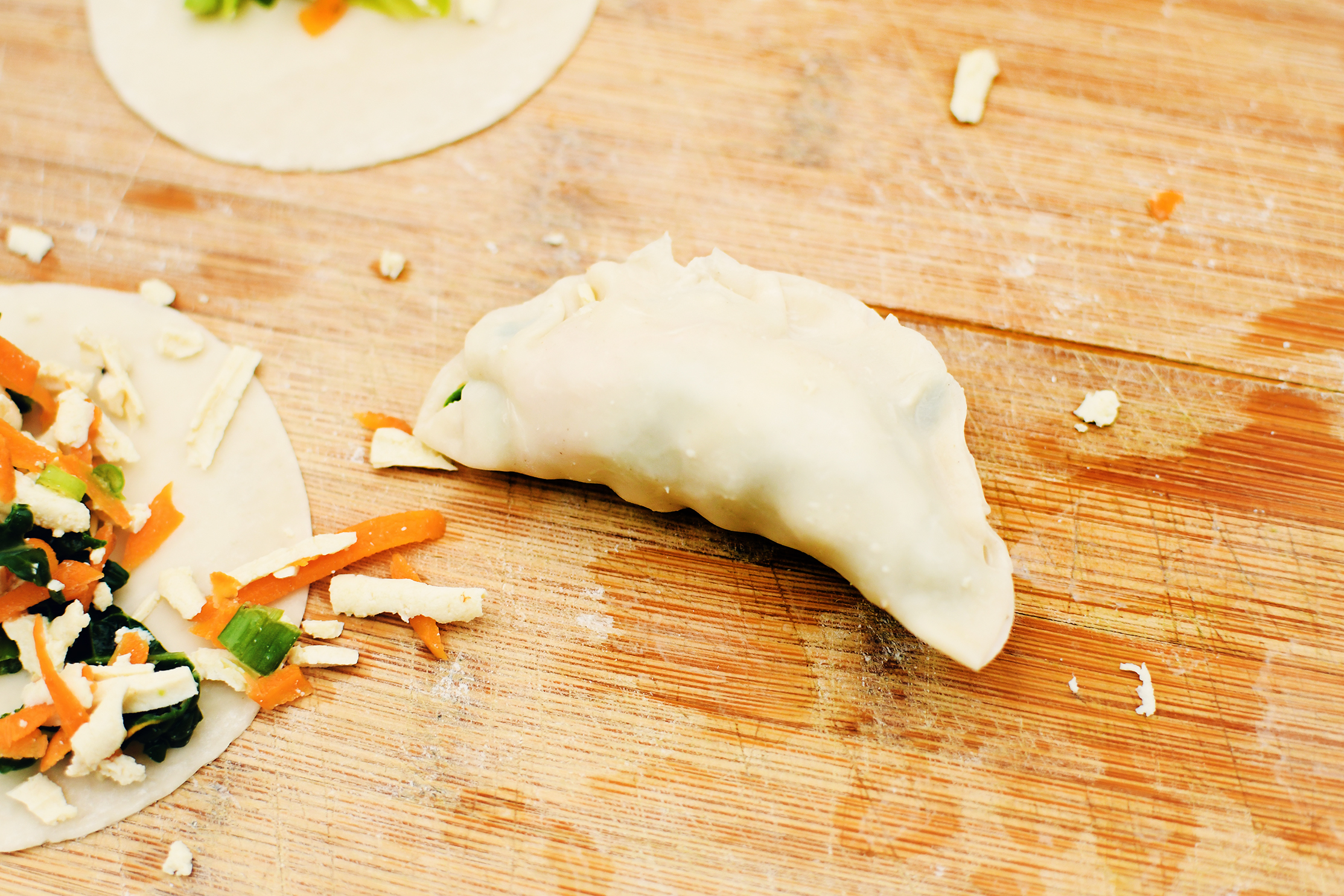Because of the cabbage not being cooked down enough, I decided to use two wrappers to avoid the dumplings from breaking. In order to keep the two wrappers from sliding, I brushed water on each one to ensure they didn't slip apart.