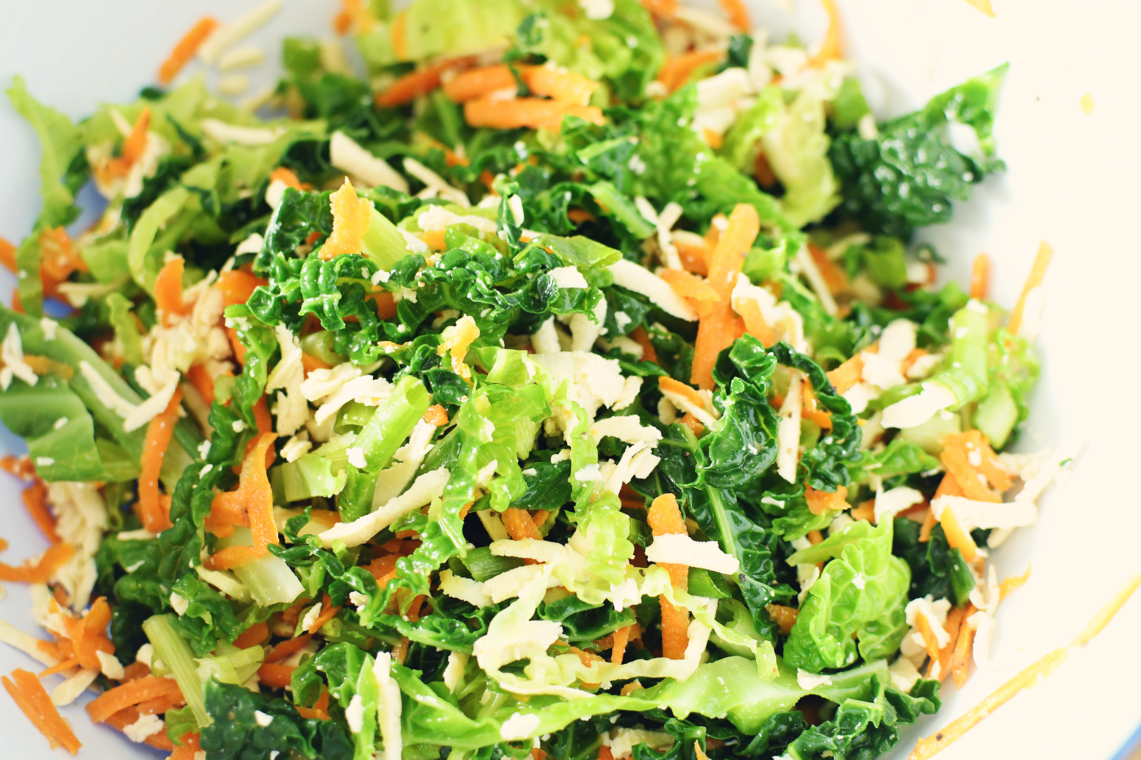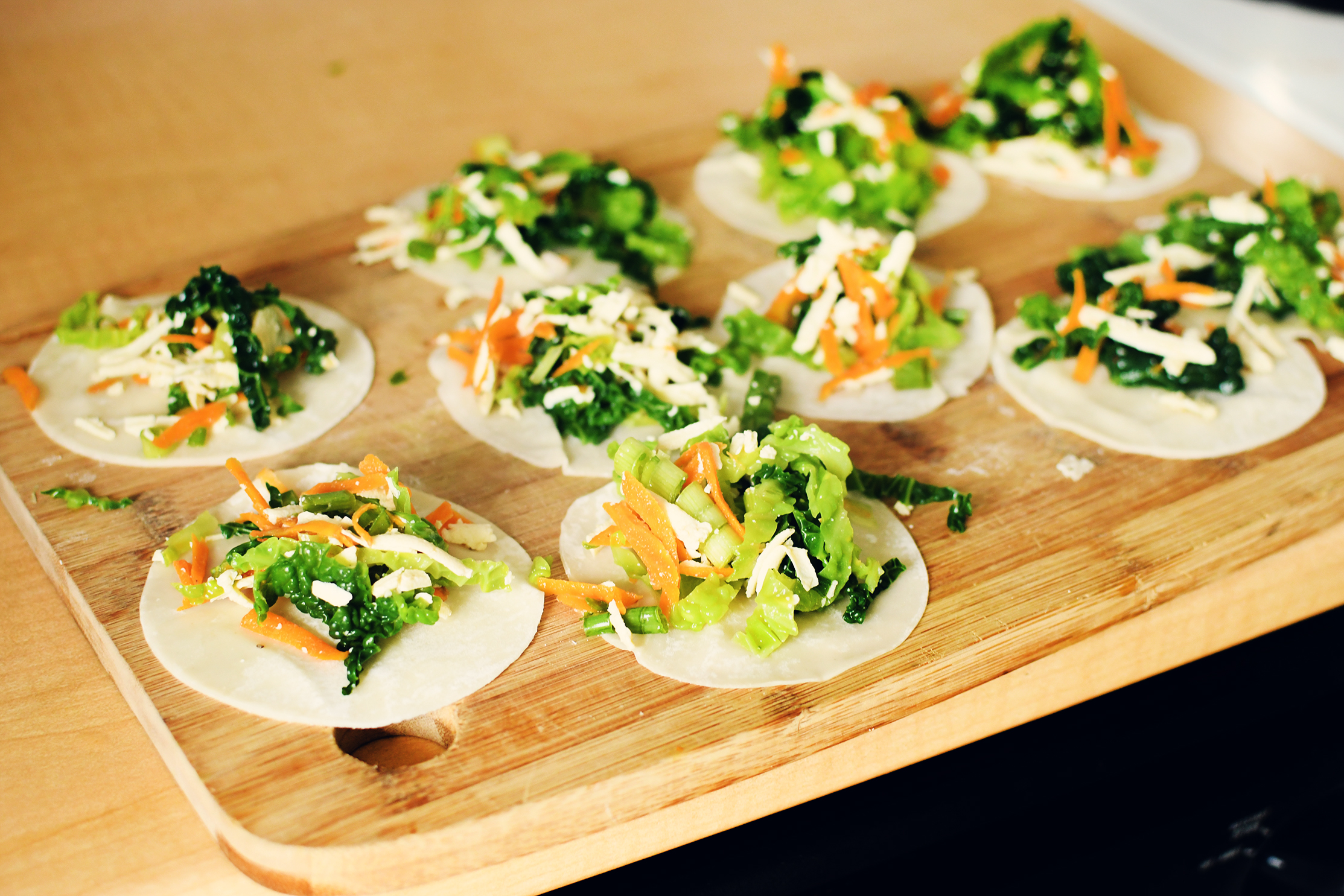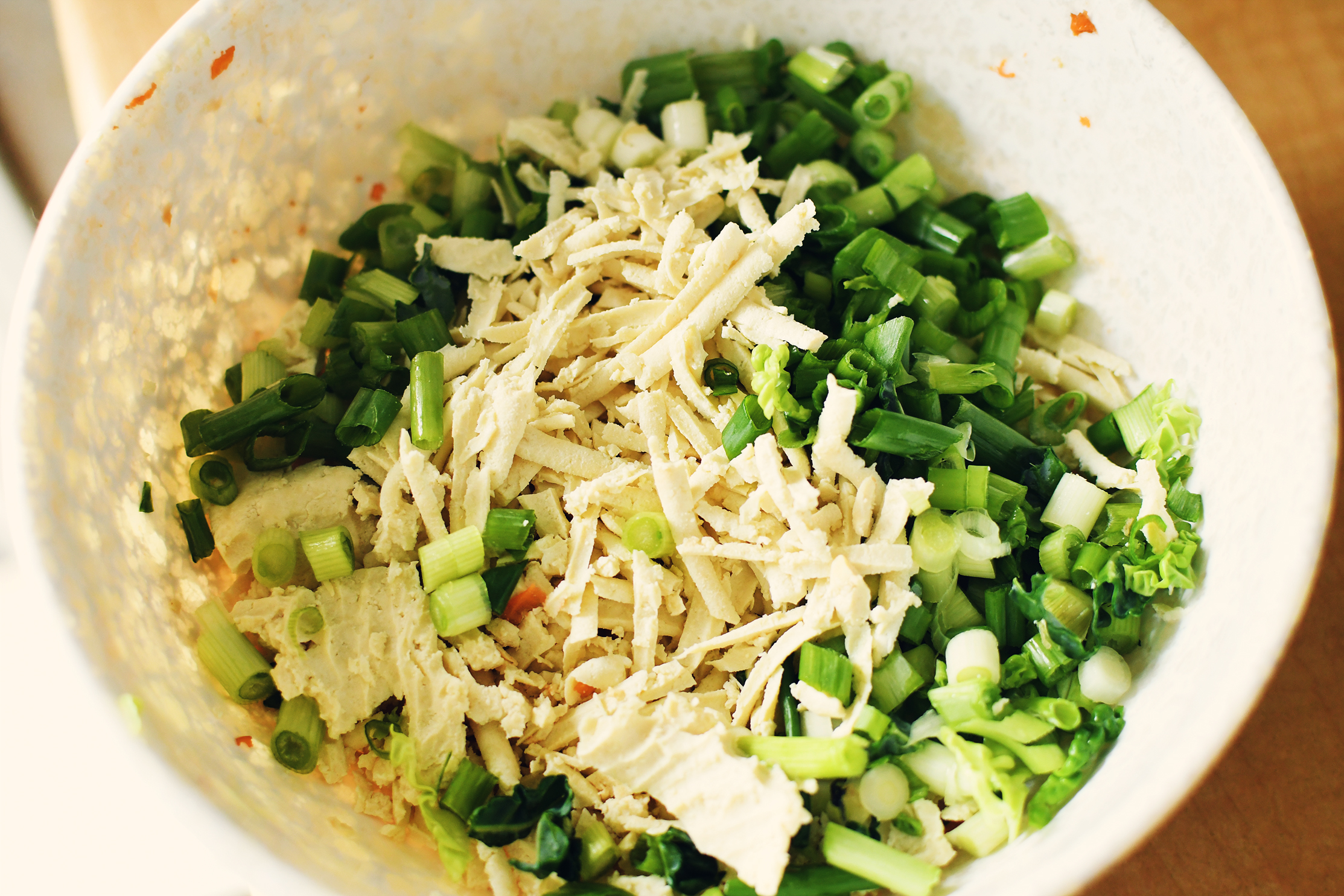 Because of my needing to hurry, I cut the steaming of the cabbage and carrots short. This would make it more challenging to fill the wrappers. It's much easier to do when things are softer. I strained them, rinsed them in cold water and mixed them in with the tofu.