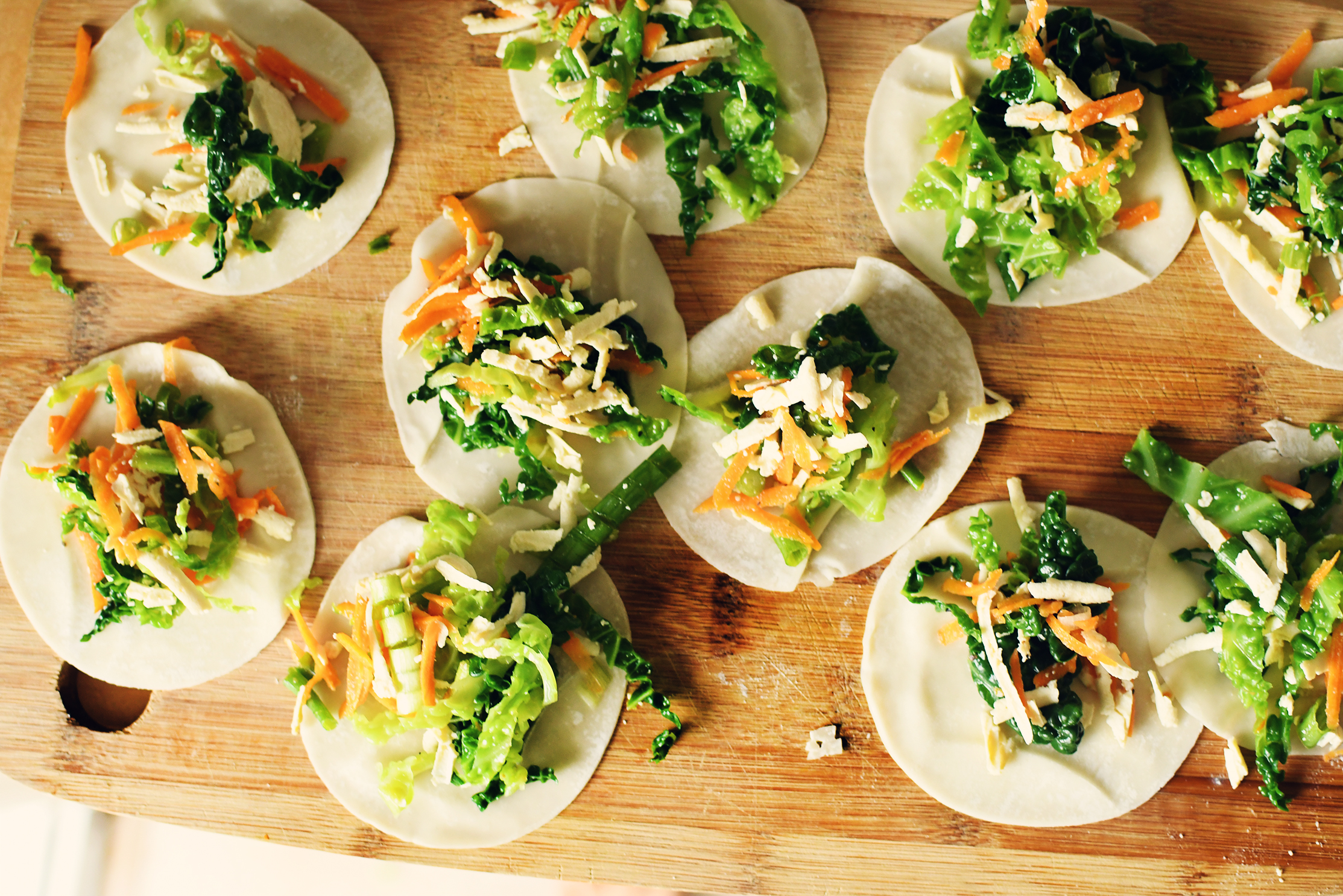 As soon as they got out the door I ran to the fridge like they do on Iron Chef, and quickly got out a head of savoy cabbage, a carrot , a bunch of green onions and a brick of tofu for the filler. The cabbage and carrots would have to be steamed down and cooked in order to make a filling.
