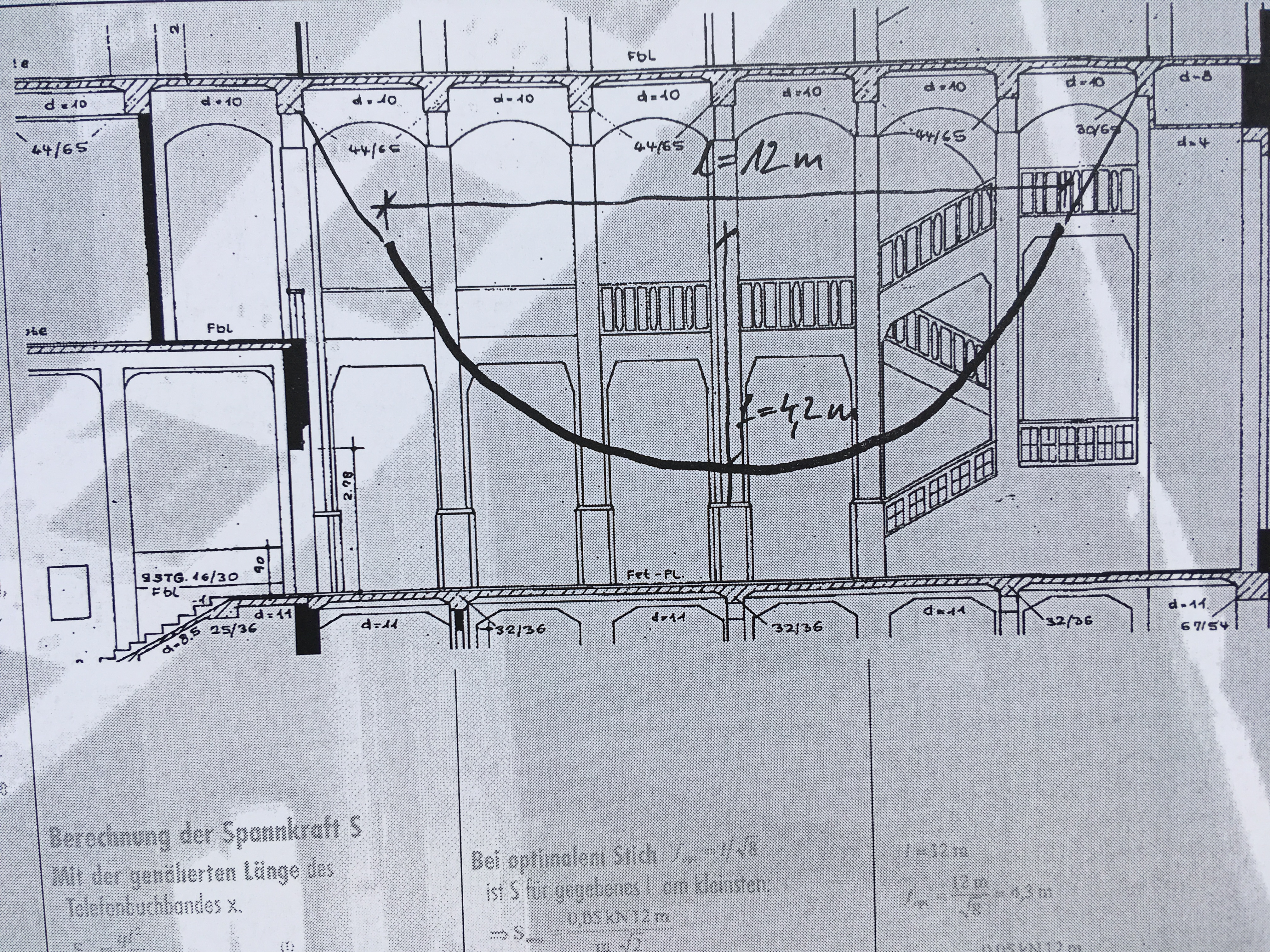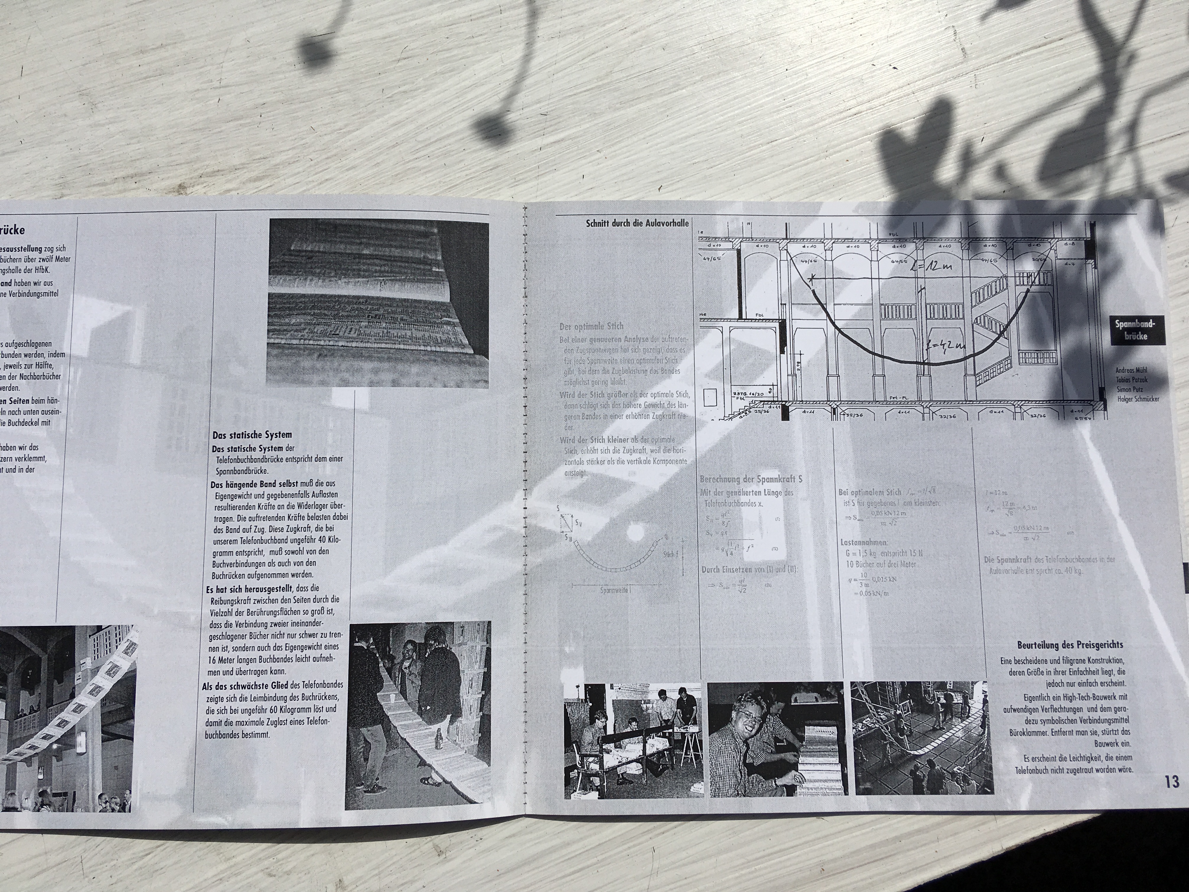 Tension strap bridge: The suspended belt itself must transmit the forces resulting from its own weight and any superimposed stresses to the abutments. The occurring forces load the belt in tension. This tensile force, which corresponds to approximately 40 kg for our telephone book band, must be absorbed both by the book connections and by the spines of the books. It has turned out that the friction force between the pages is so great due to the large number of contact surfaces that it is not only difficult to separate the connection of two books folded into each other, but it is also easy to absorb and transfer the dead weight of a 16-metre book volume. The weakest link in the telephone band was the glue binding of the spine, which loosens at about 60 kilograms and thus determines the maximum tensile load of a telephone book strap.