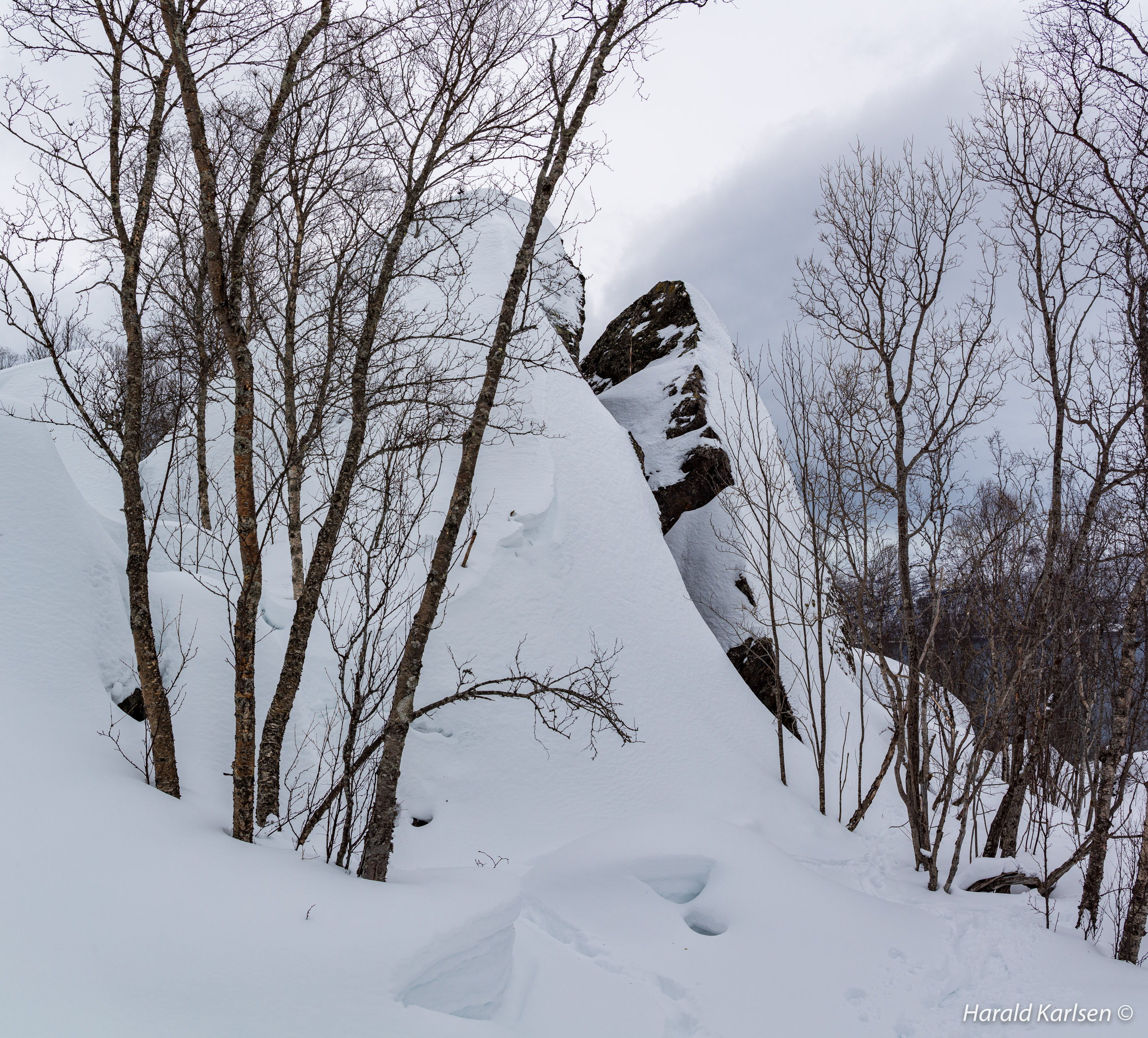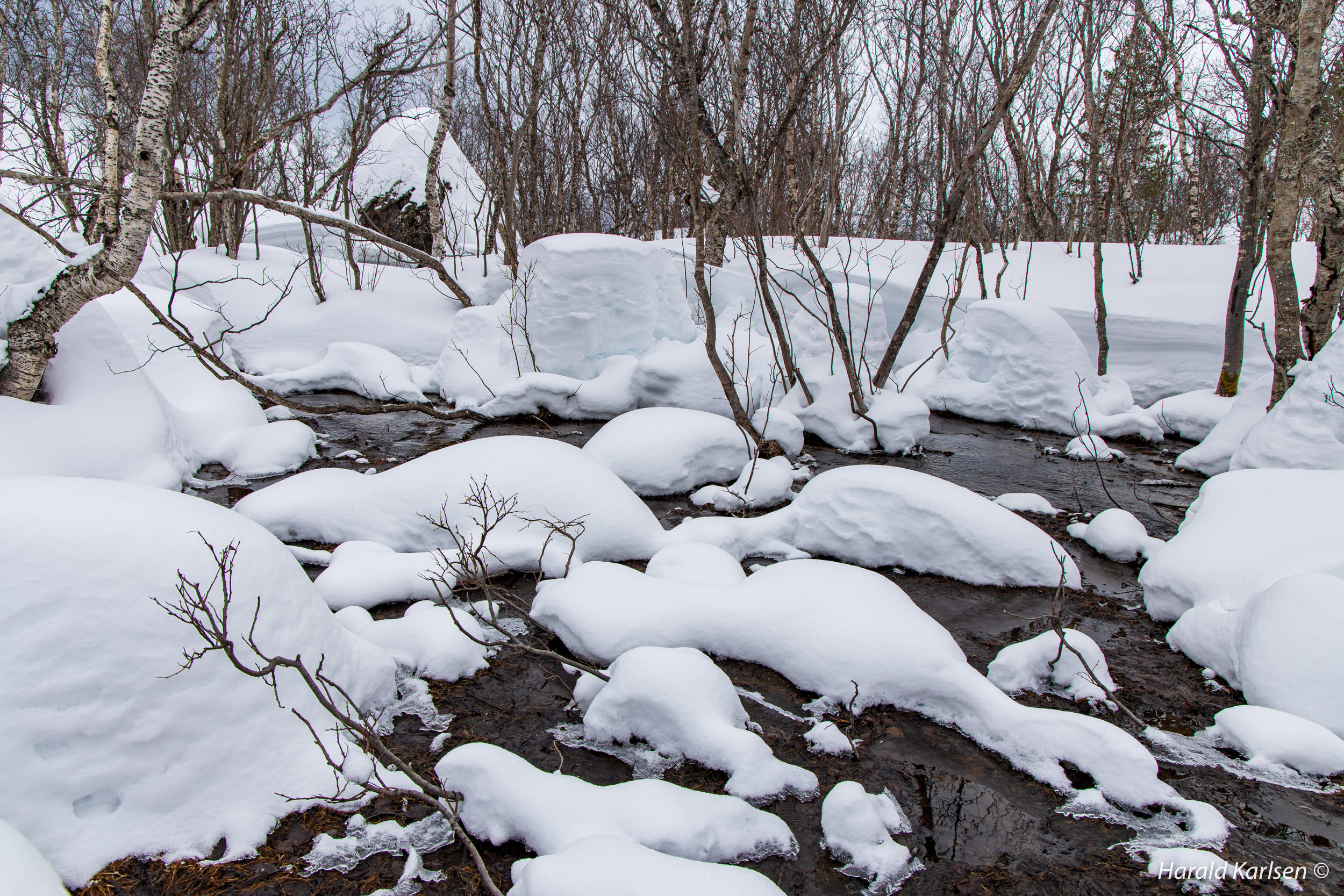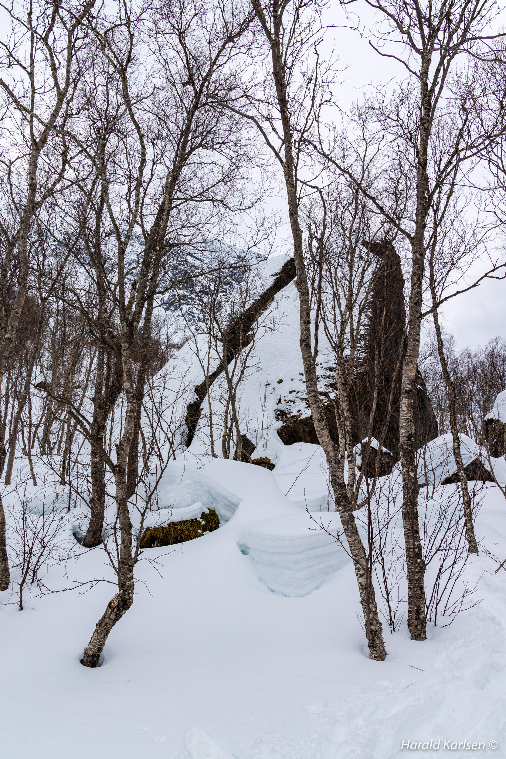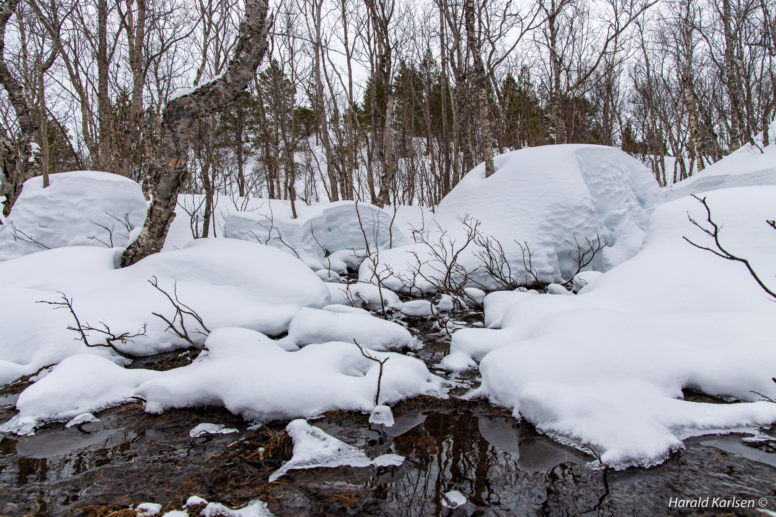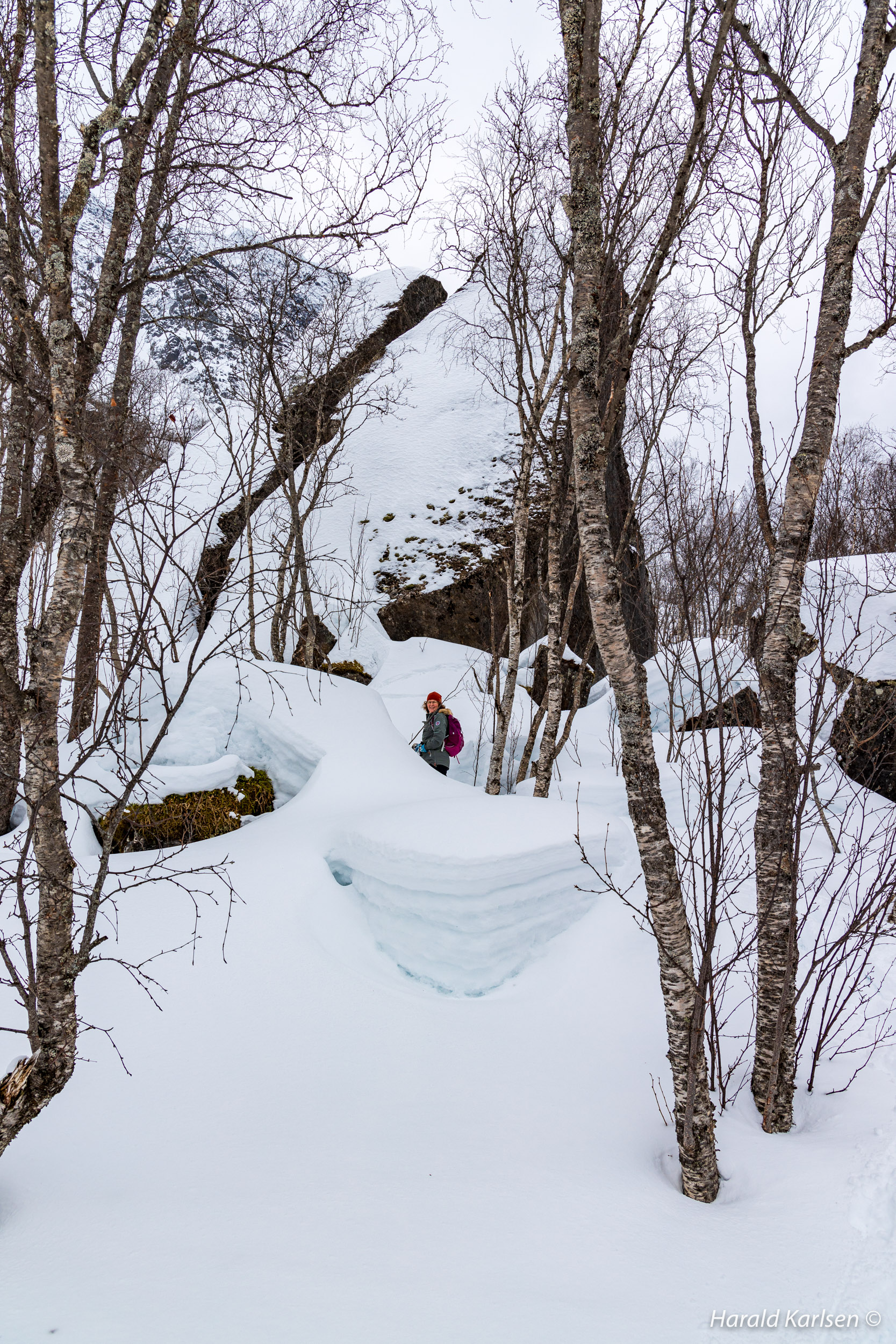 From the little stream to the rock there is much stone covered with high piles of snow. We had to be a little careful and check where it was safe to walk. Between all the rocks we followed tracks after reindeer that have been grazing in the area for the past 24 hours. If the reindeer didn't disappeared under the rocks it was safe for us too.