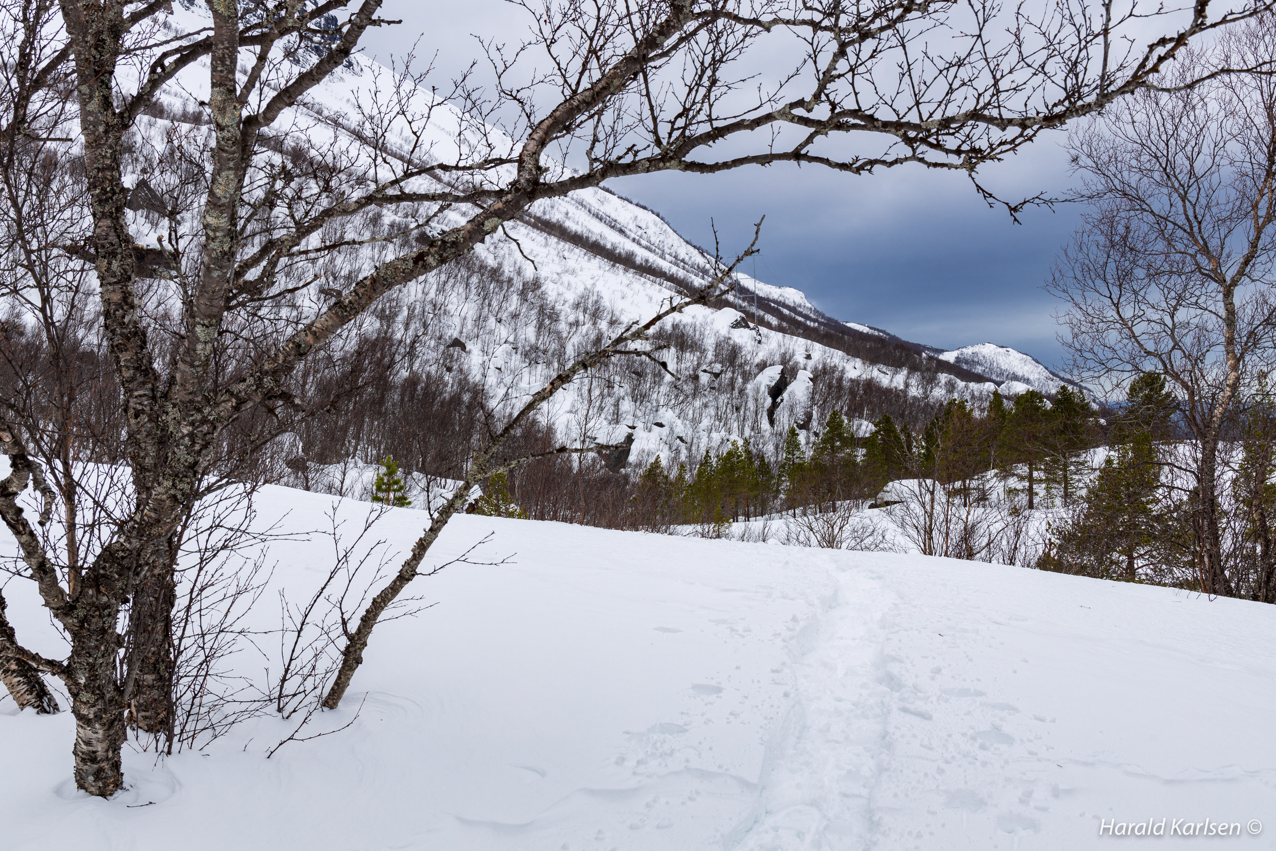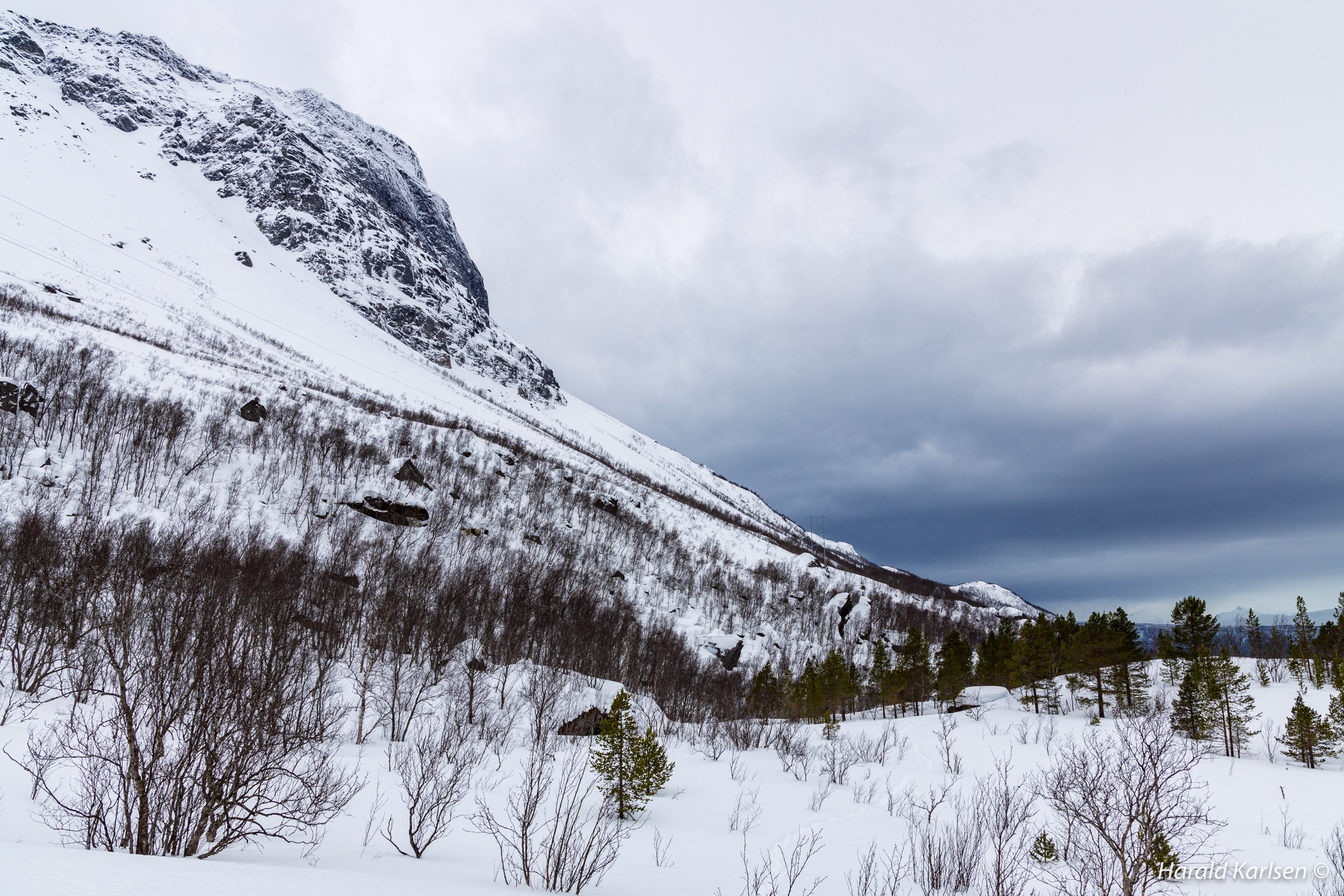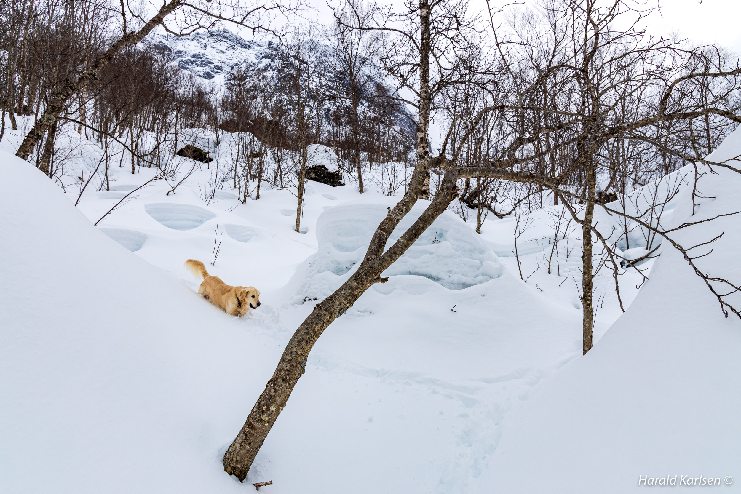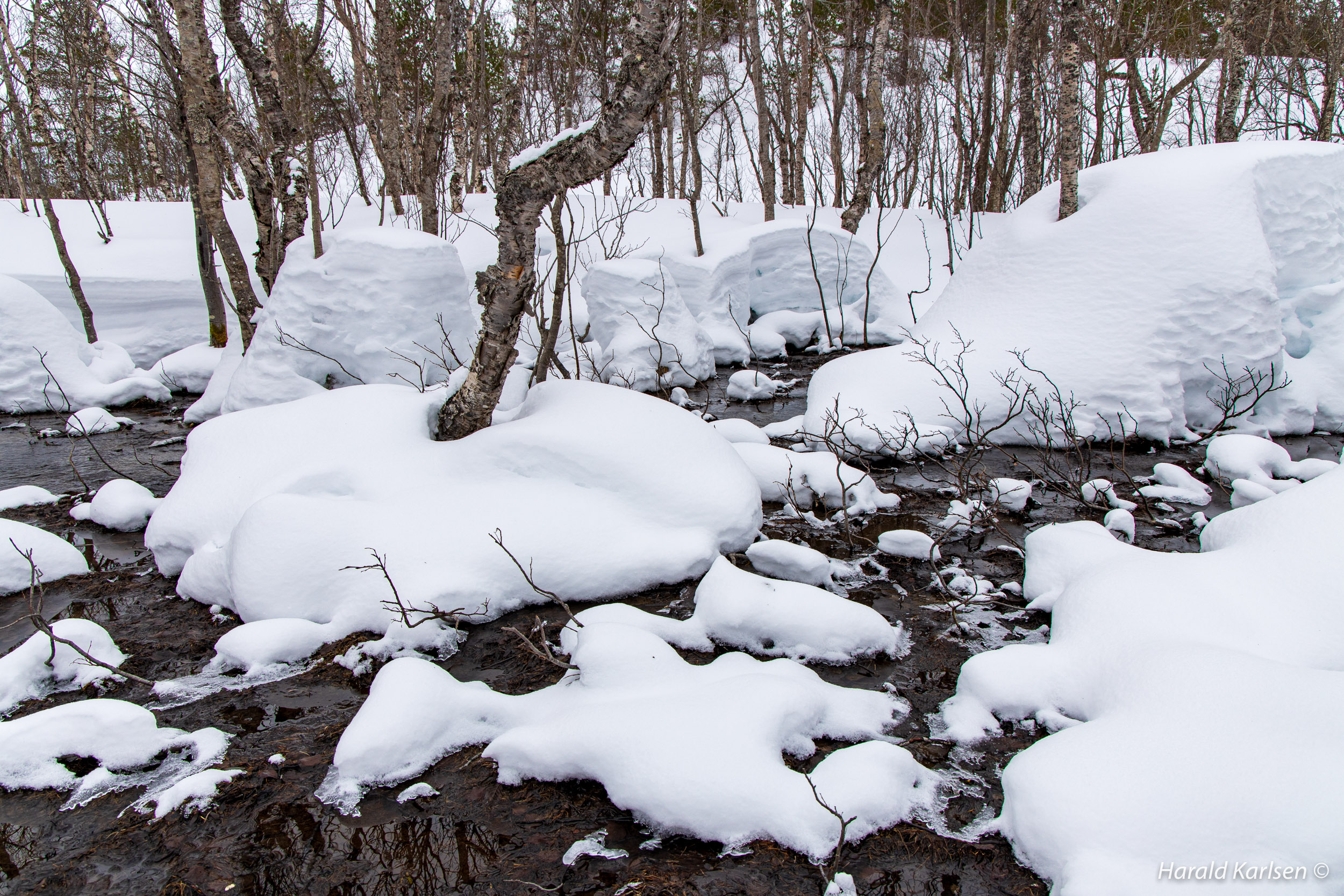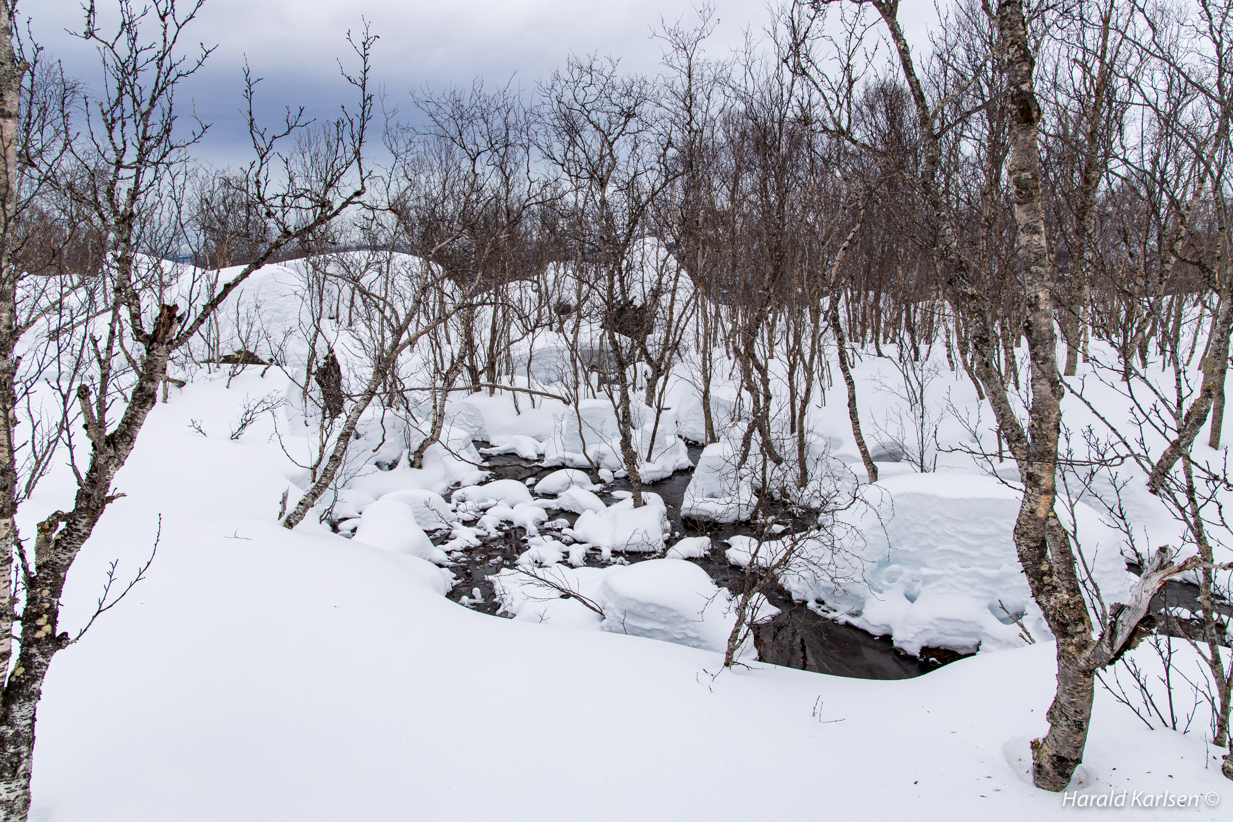 From the little stream to the rock there is much stone covered with high piles of snow. We had to be a little careful and check where it was safe to walk. Between all the rocks we followed tracks after reindeer that have been grazing in the area for the past 24 hours. If the reindeer didn't disappeared under the rocks it was safe for us too.