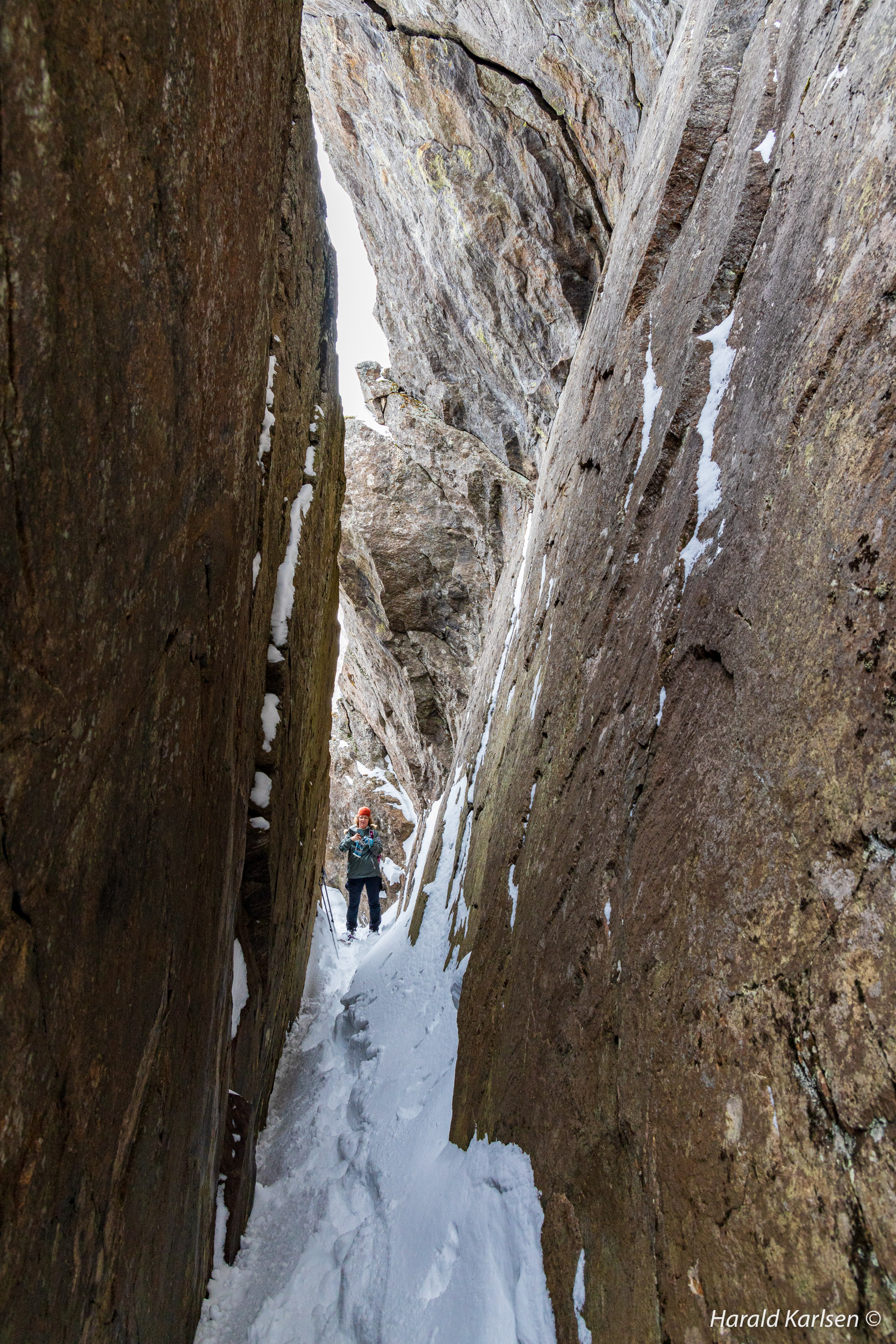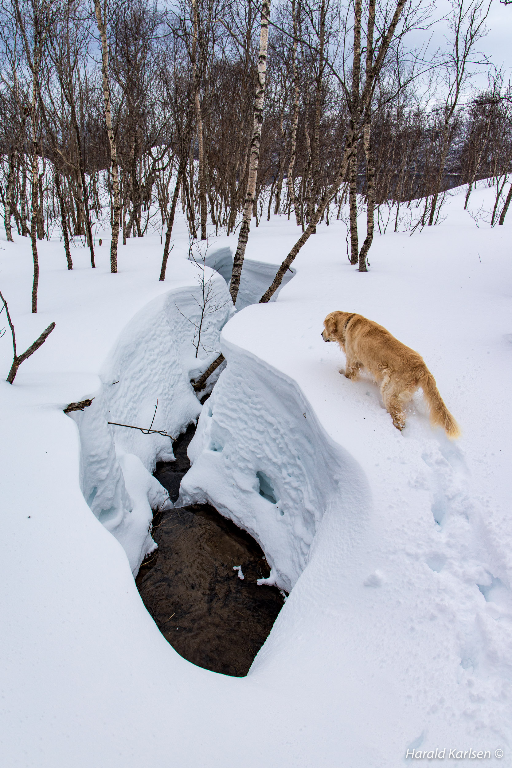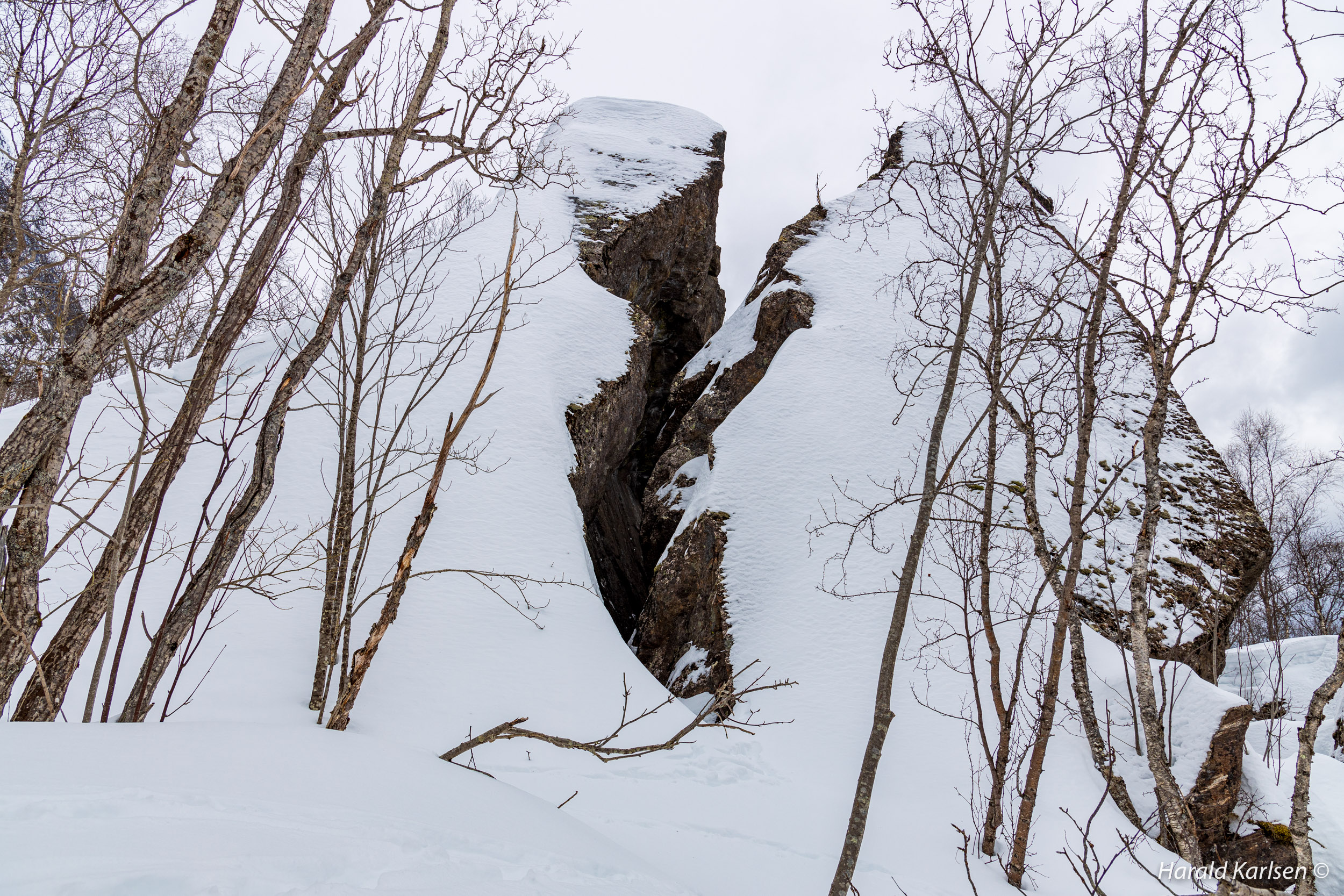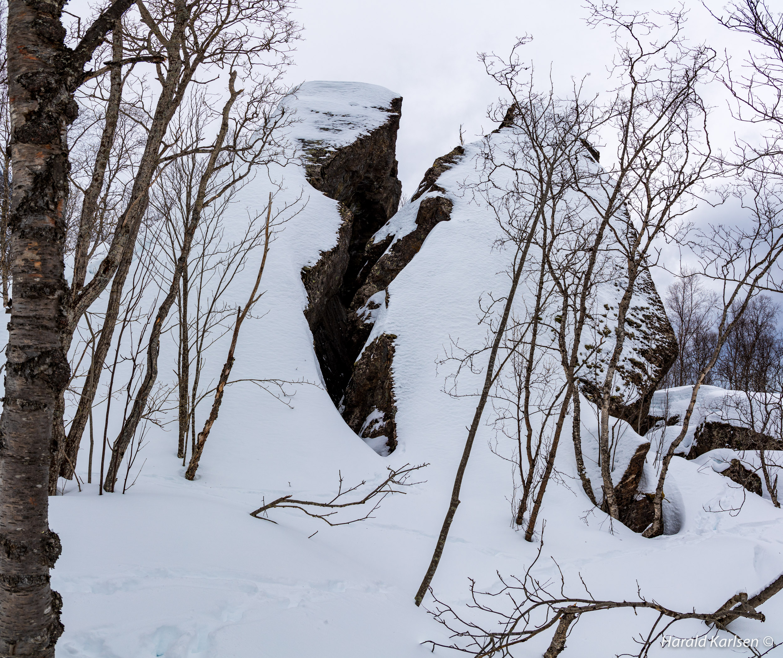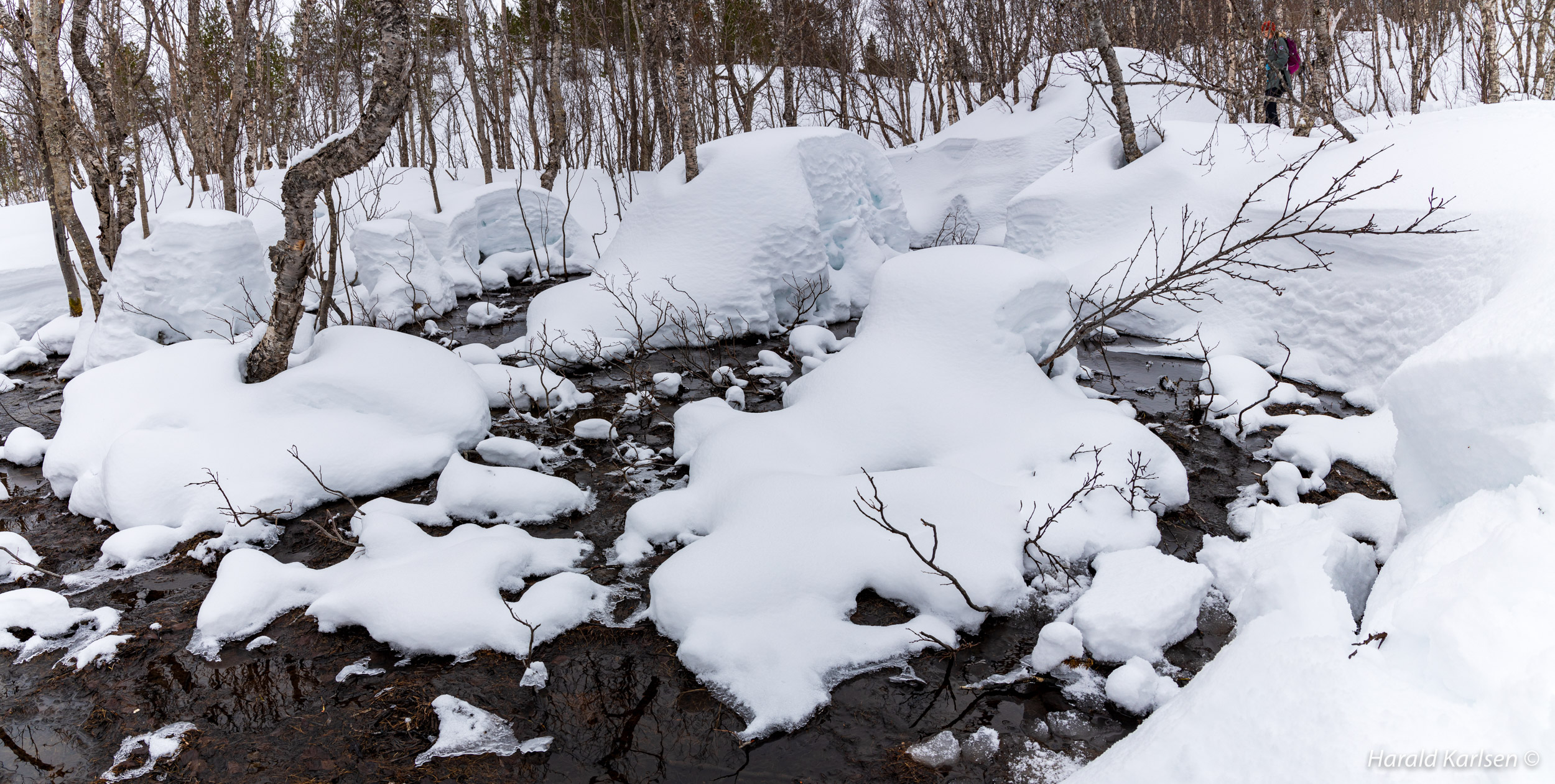 On our way toward the rock we crossed this stream, probably a sign of spring with flooding water between at least 1,5 meters deep snow. My wife stand on the upper right corner of the picture.