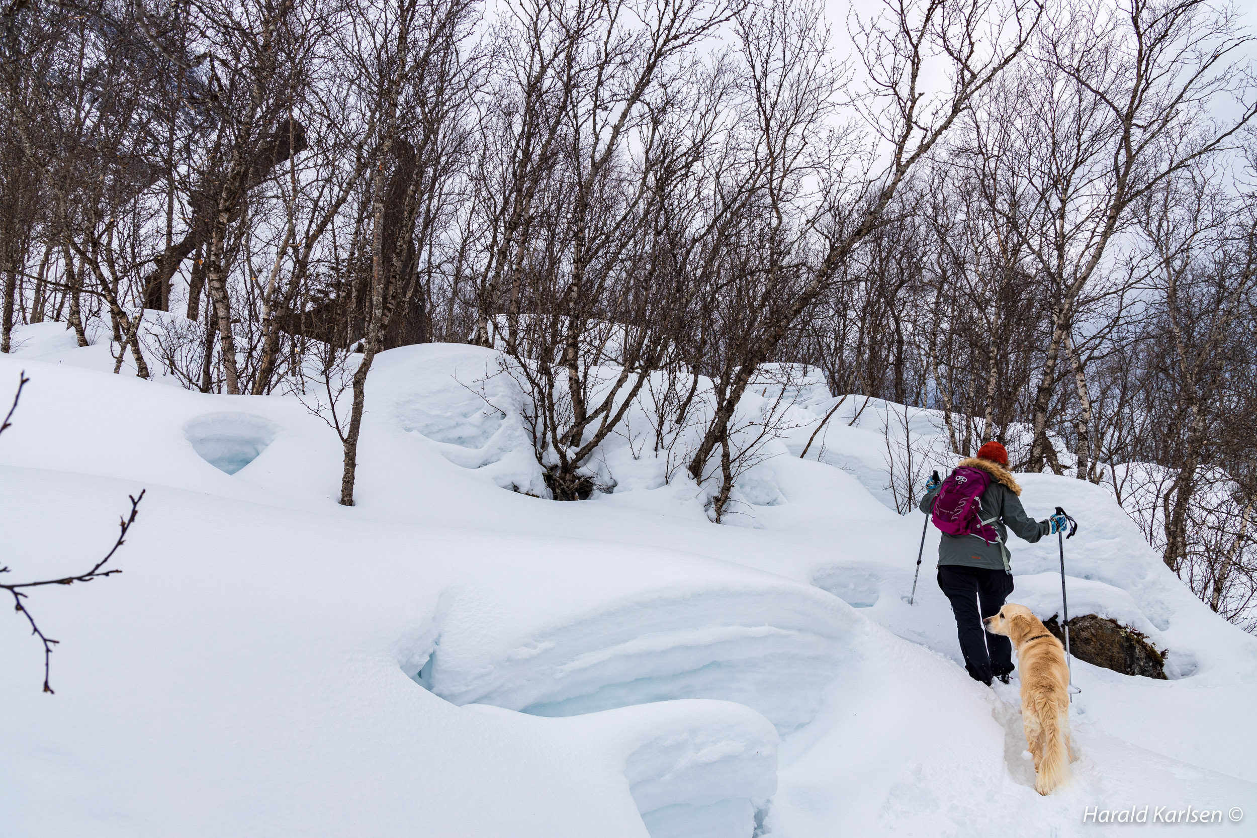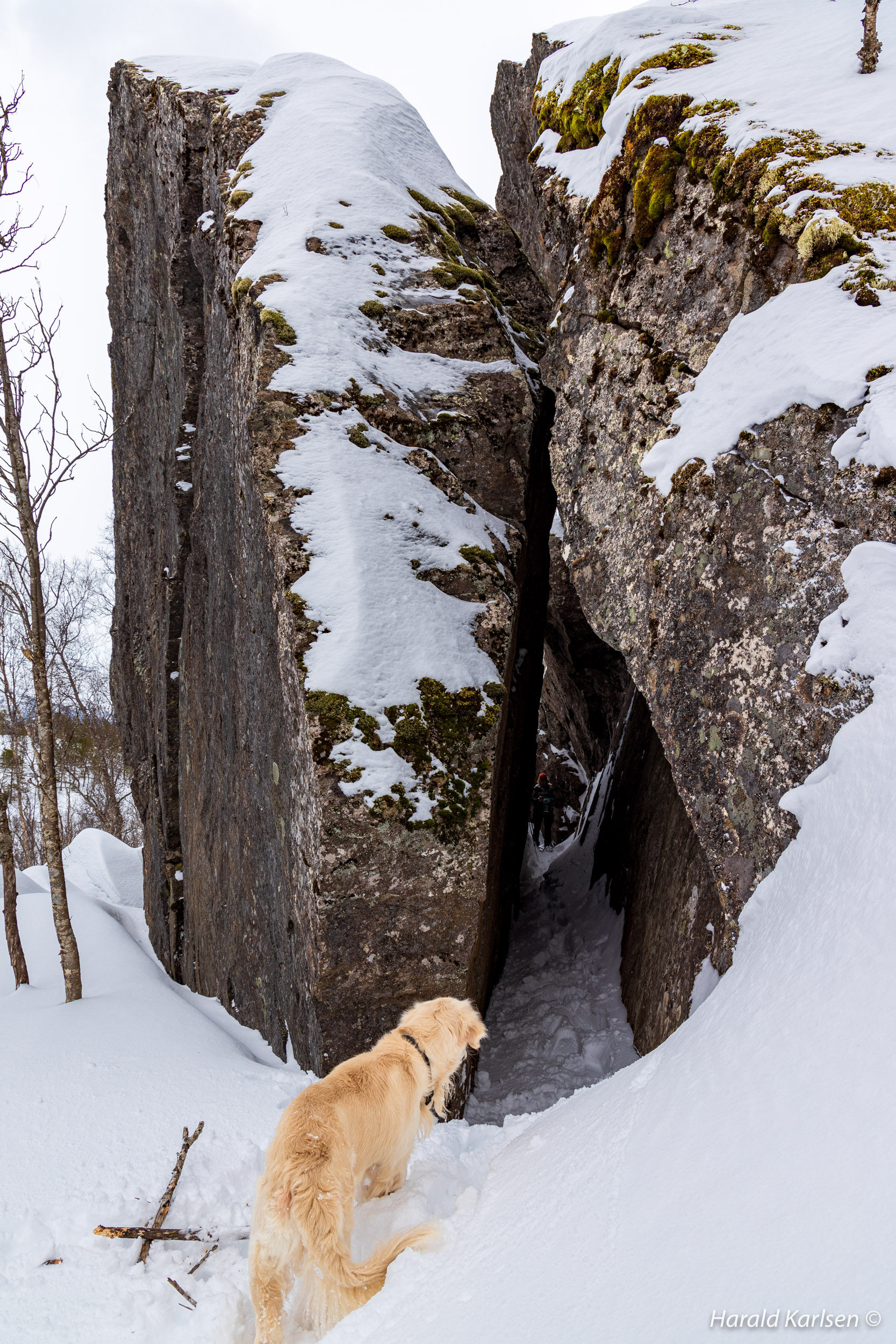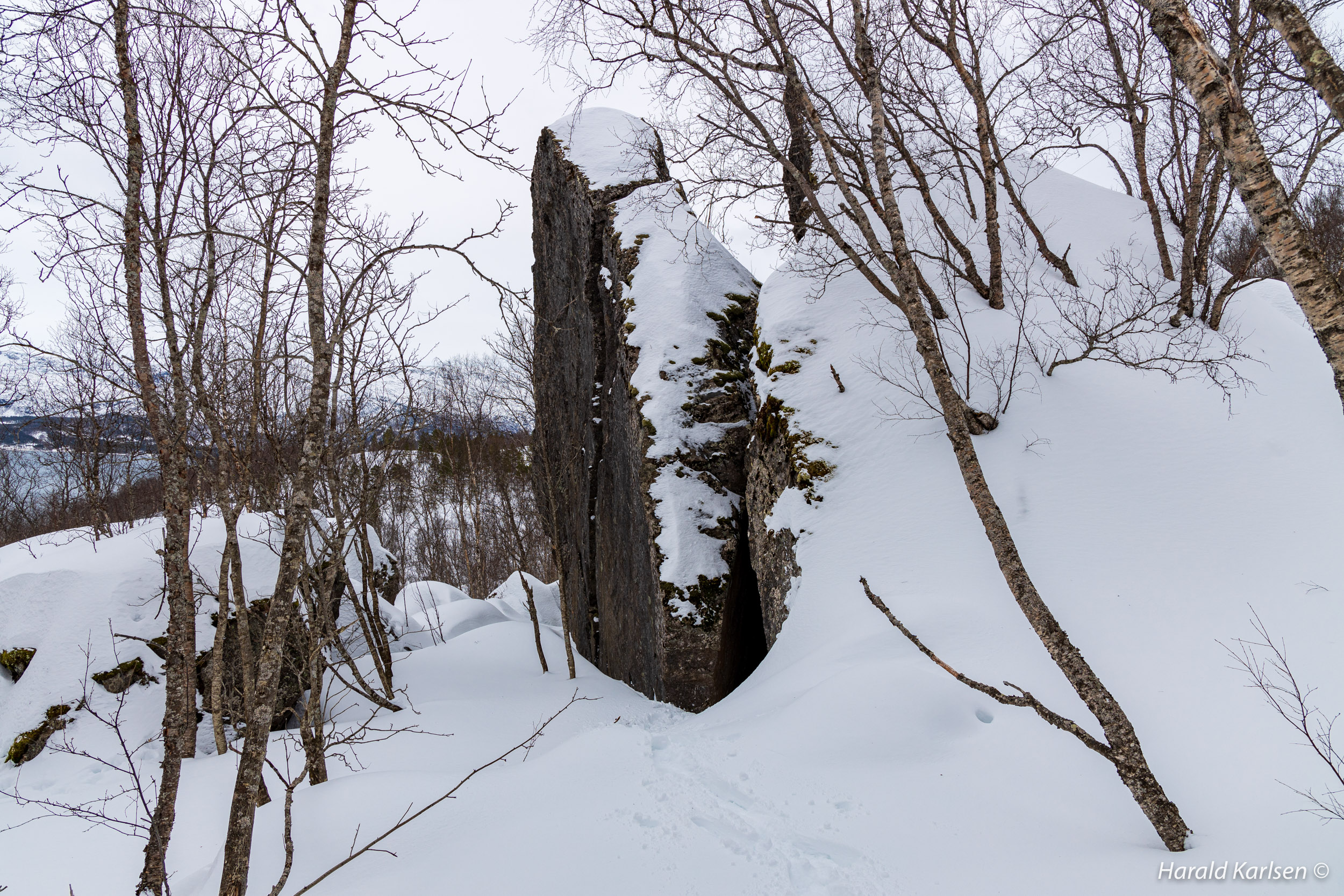 When I was a kid, a friend and I built a small cabin in one of the many caves in the area. I visited the cave some years ago, and there was still trace after the adventurous boys. Because of the snow I could not see our secret cabin today. I may take a visit during the summer.