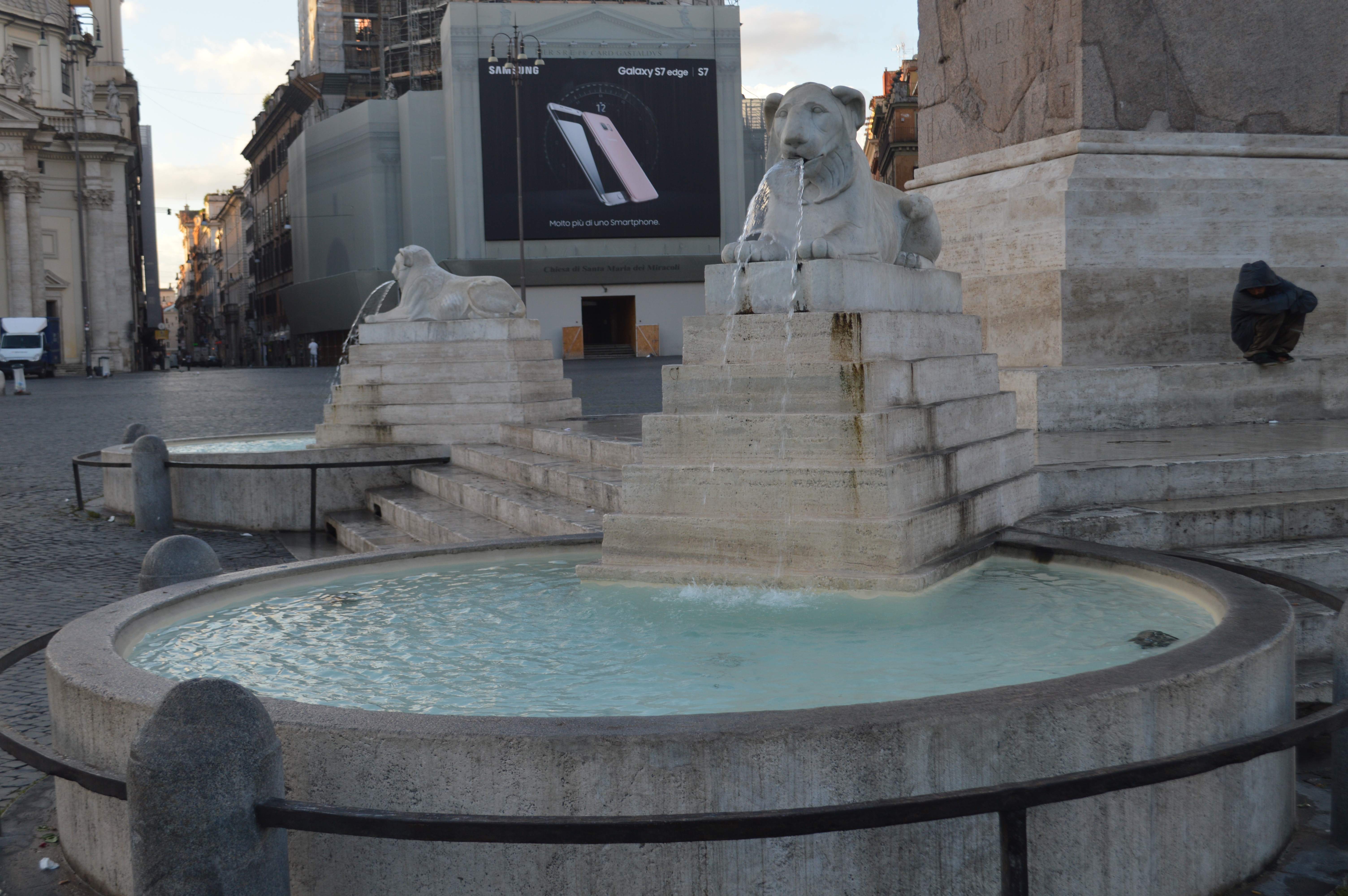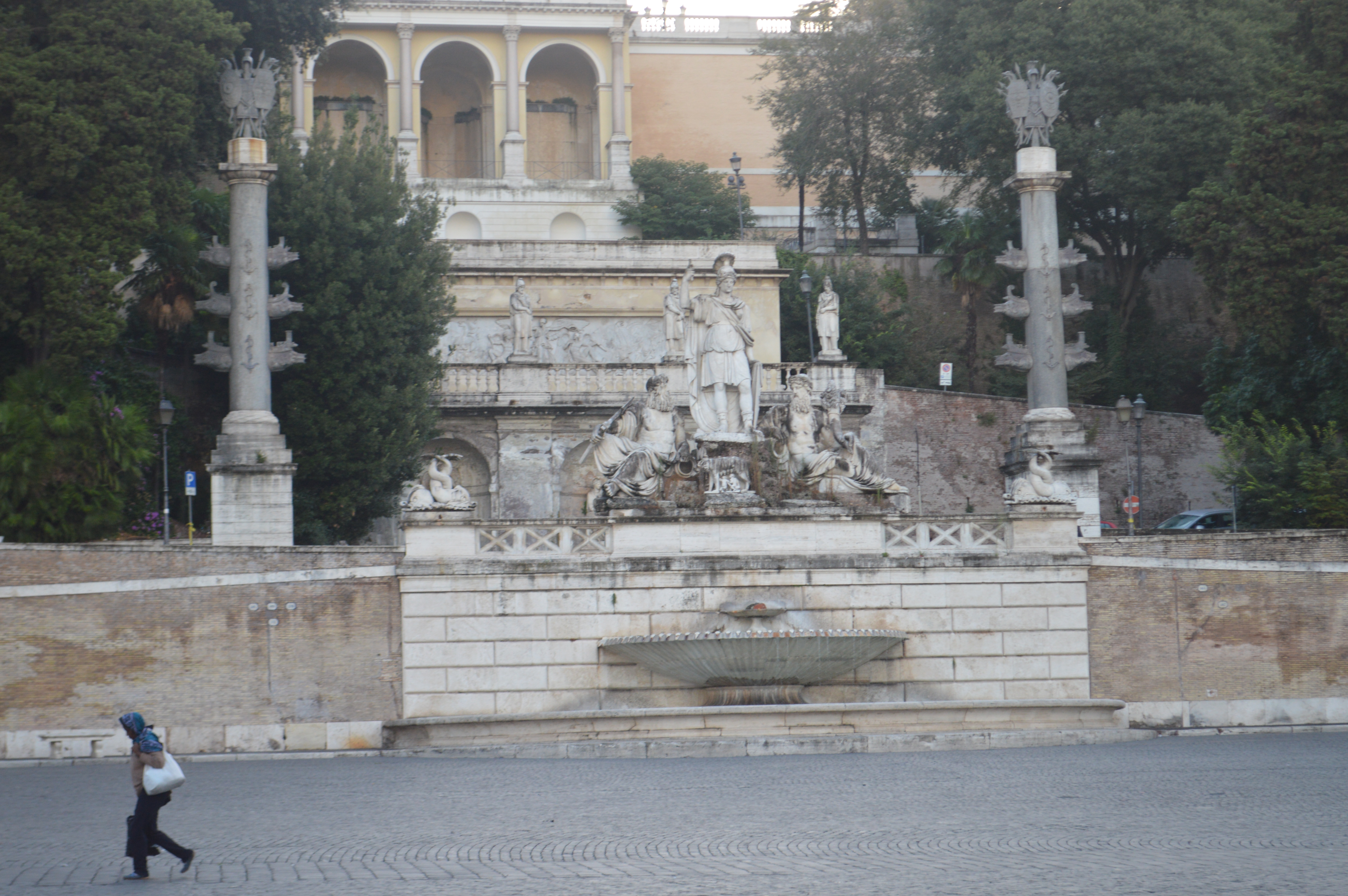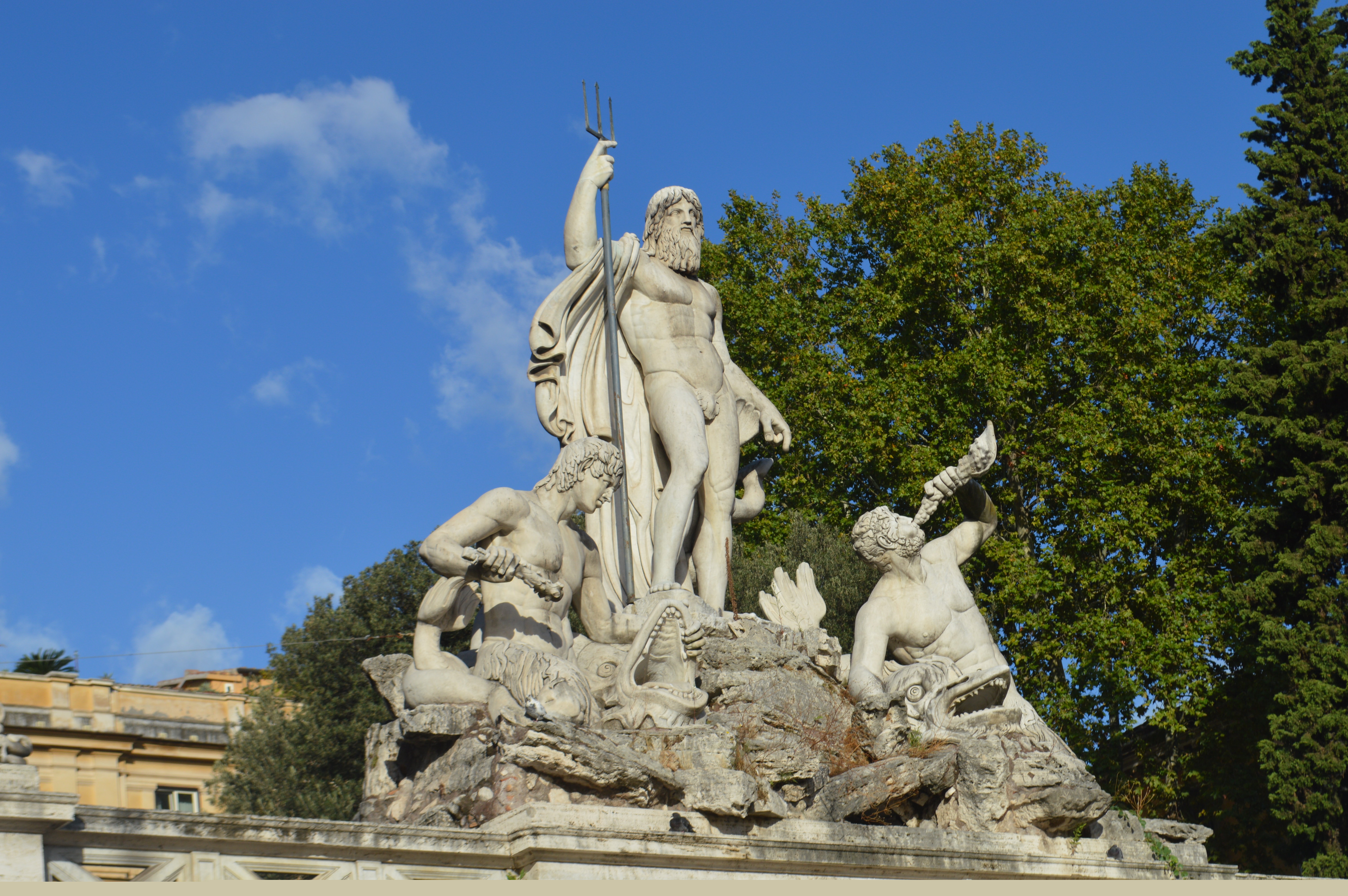 It is assumed that the architect Valadier designed two fountains that were embedded in the walls of Piazza del Popolo. The fountain in the western part of the square toward the Tiber River was the Neptune Fountain (Fontana del Nettuno) The fountain was erected between 1814 and 1823. The fountain depicts a Neptune with a trident accompanied by two Tritons. Neptune was the ancient God of sea and earthquake.