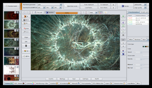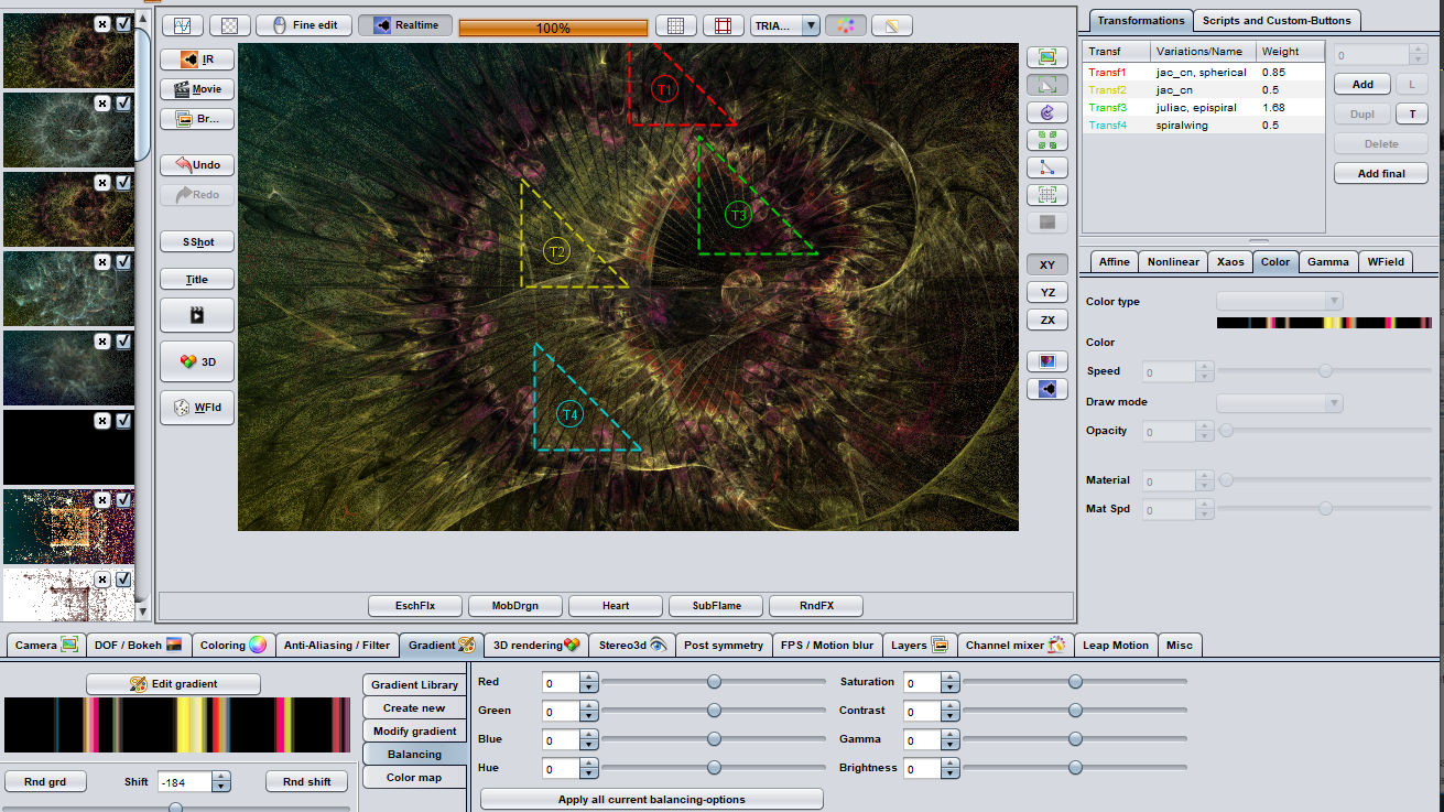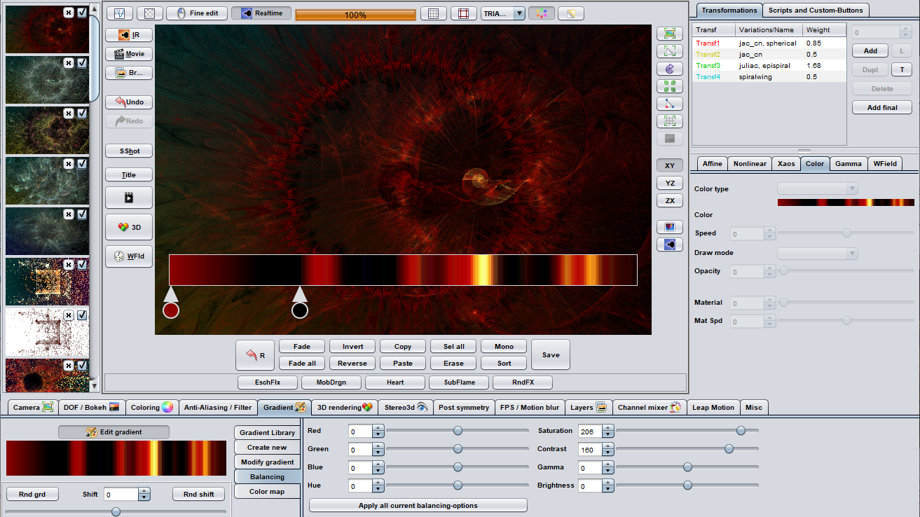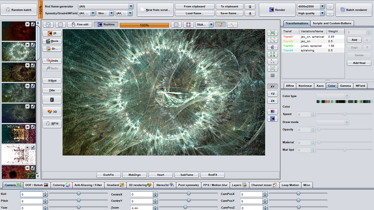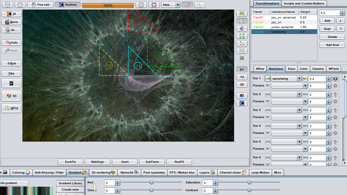 Some formulas have a wide effect on the whole fractal, others on just a part of the picture and some just add shapes without messing with the rest; furthermore, you can control how a transformation interacts with each other transformation to get the results you desire. I added one more transformation with the "spiralwing" formula, forming that purple shape in the middle; had to tweak the settings so that the fractal I had so far remained intact. I also inreased the "strength" of the 3rd transformation to make it more prominent.