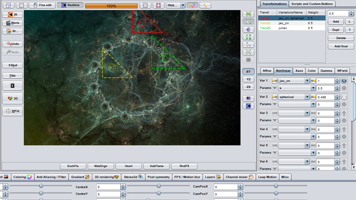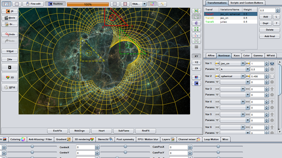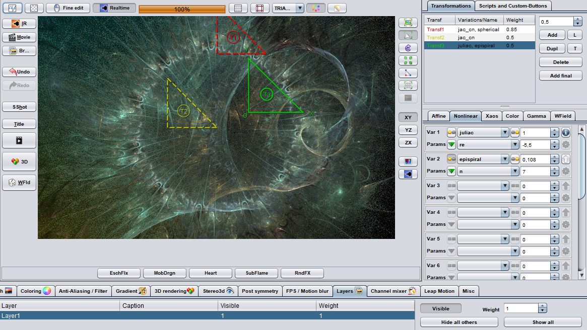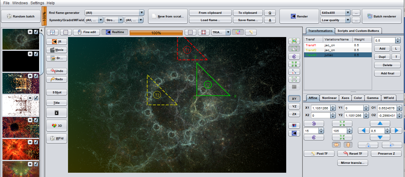 In a blank fractal in JWildFire, I add three Transformations with one formula each: 2x "jac_cn" & 1x "juliac". Transformations are groups of mathematic formulas that are iterated until a condition is met and the color of a pixel is decided. I use the default values for each formula, and I move their triangles as seen in the picture. The triangle controls how the transformation affects the area of the picture.