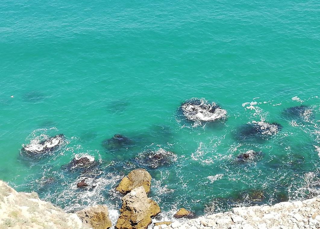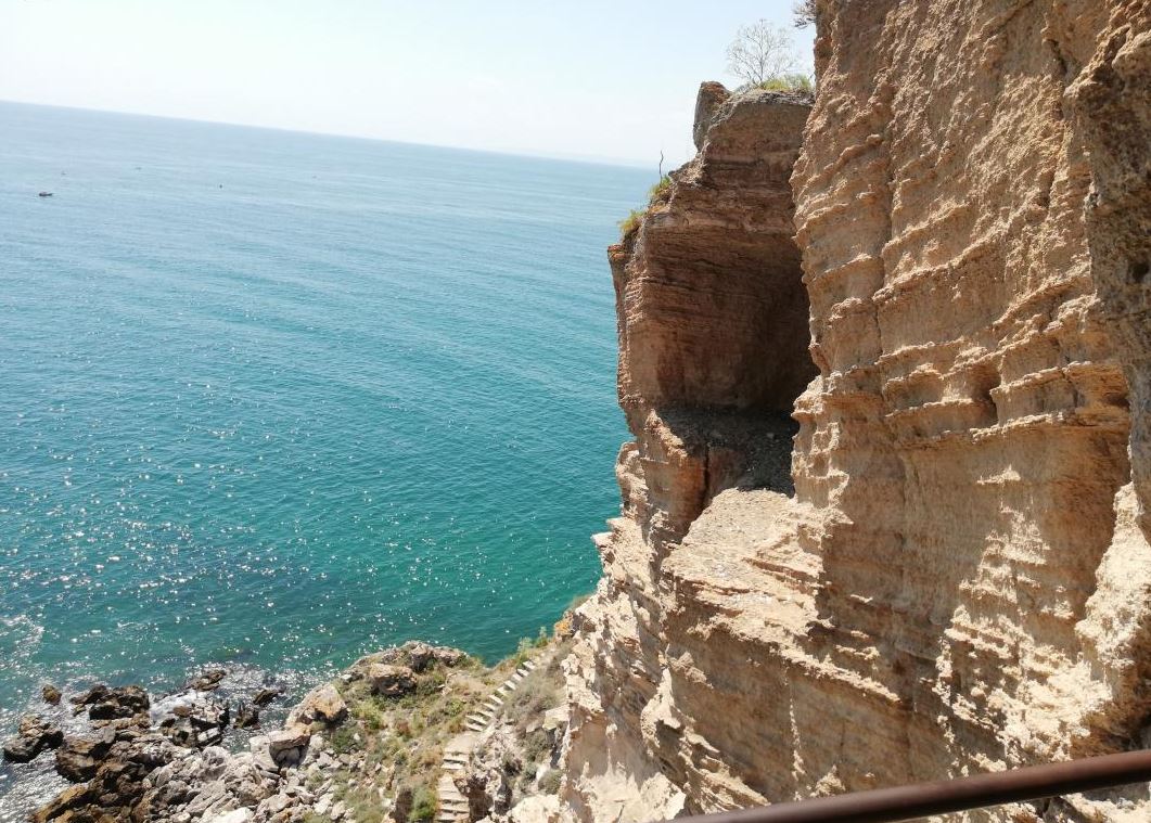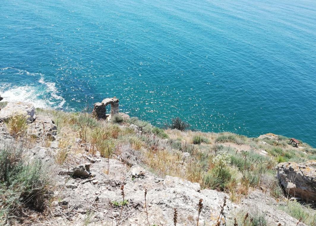 We passed by a gentleman who perfectly animated the atmosphere, playing the guitar, the whole painting being absolutely magical. We pass the access gate, heading towards the promontory. I notice a few small stairs that go down to the sea, I venture out, take my heart in my teeth, make a superb picture of the remnant of a bow near the sea and continue my way to the end of the rocks. At large you can see the midi farm from Dalboka and Balchik. The adventure continues on the narrow alley, lined with pieces of stone, linked by a very thick chain to prevent tourists from descending the high shore with reddish soil. The alley is on a slope.