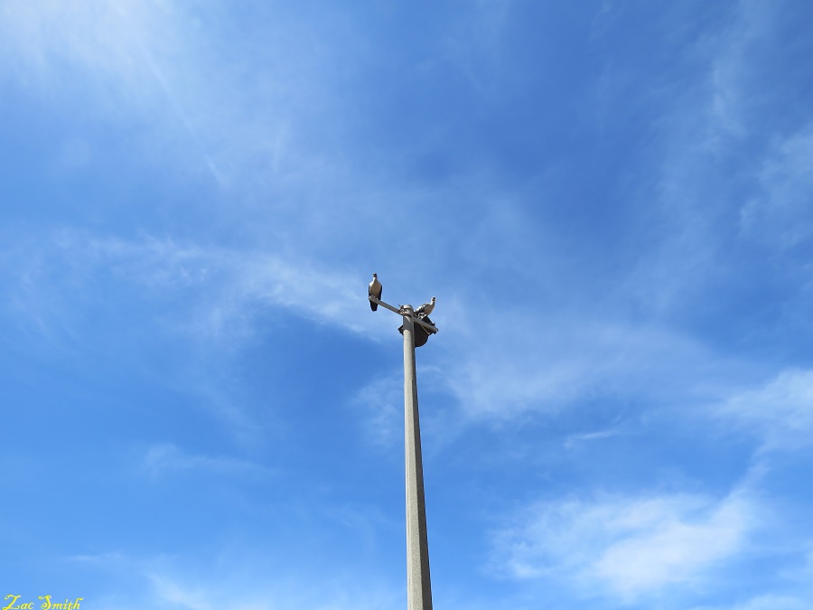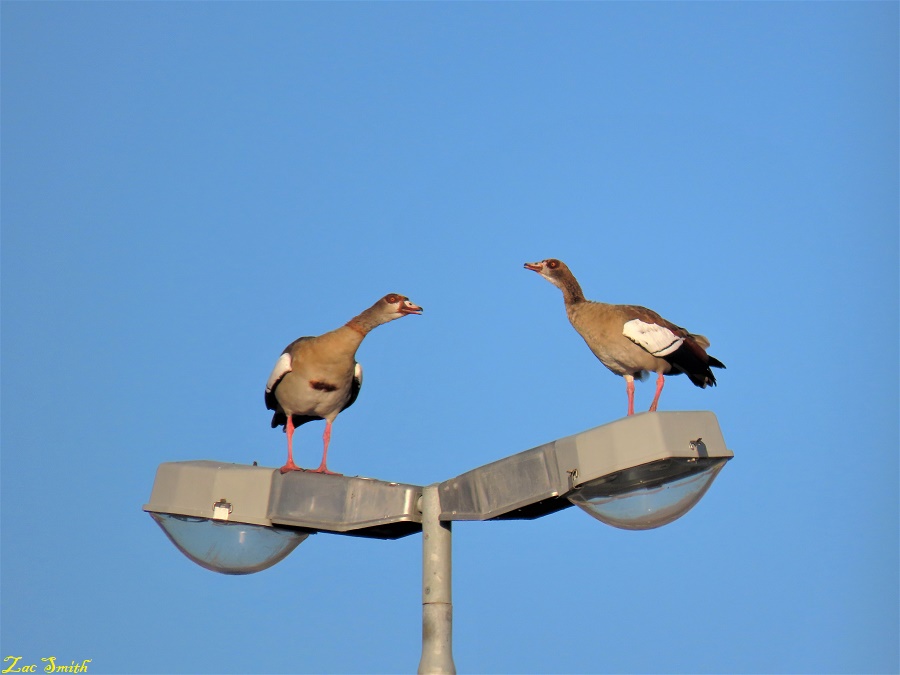 Here we have a pair of Egyptian geese on a highway lamppost!