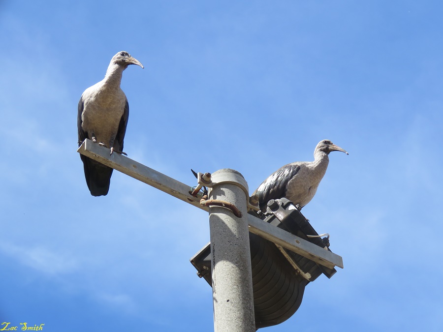 A pair of Hadeda Ibis birds sitting on a high floodlight post!