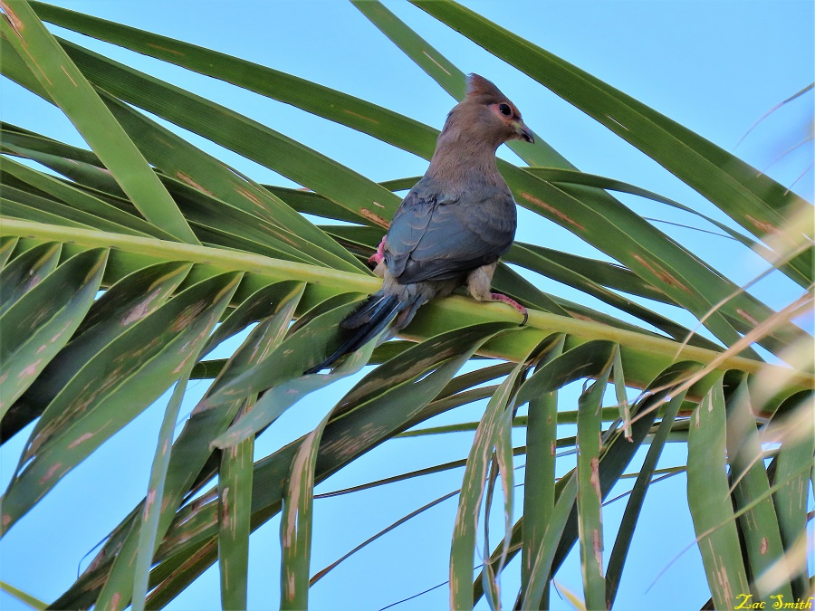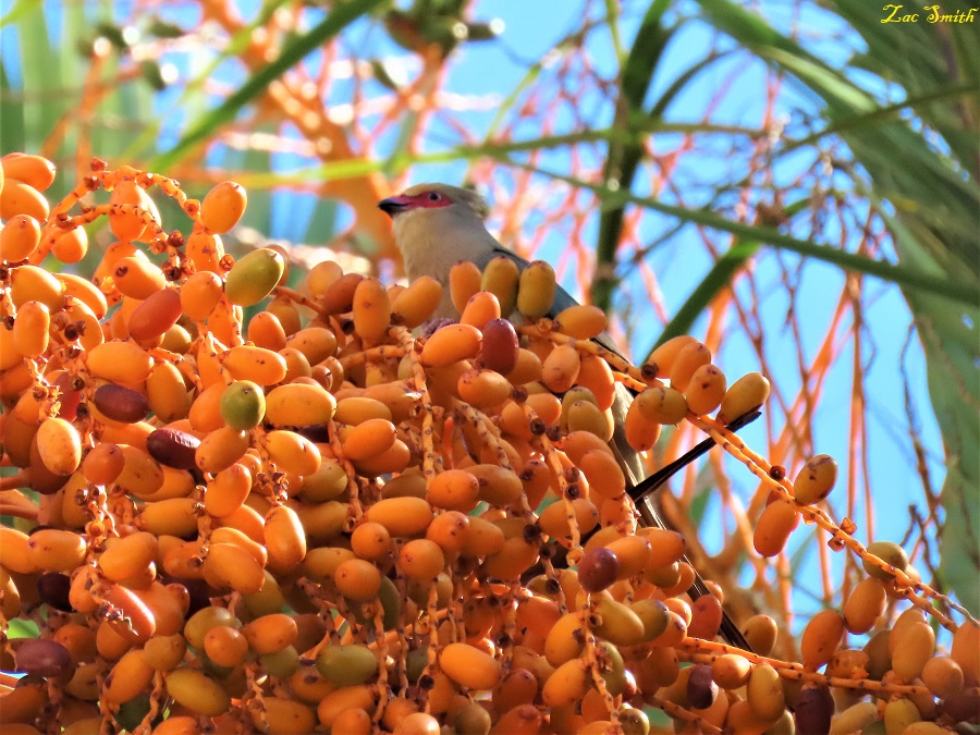 An abundance of fruit here in our palm tree for this young "Red-faced Mousebird"!