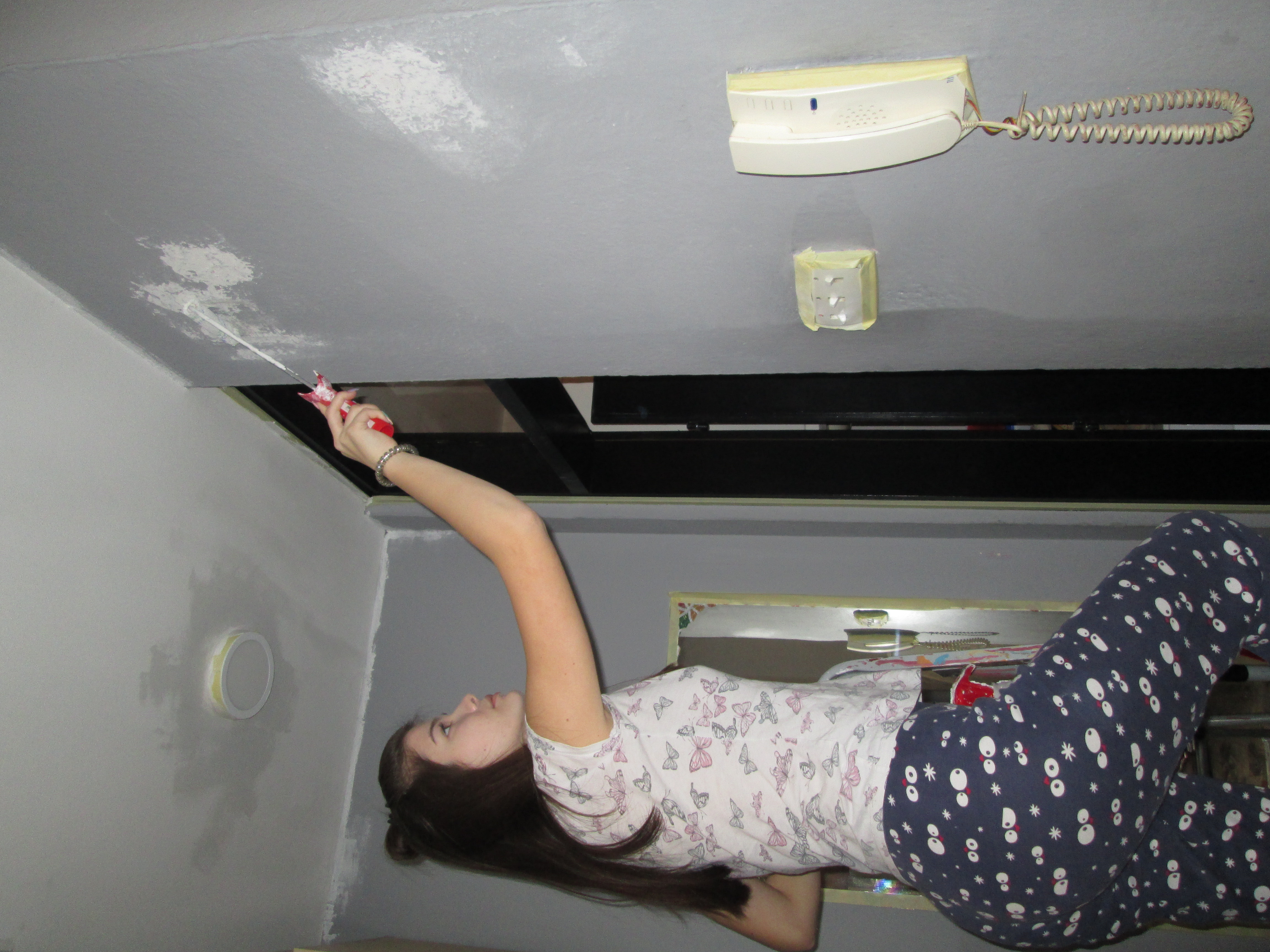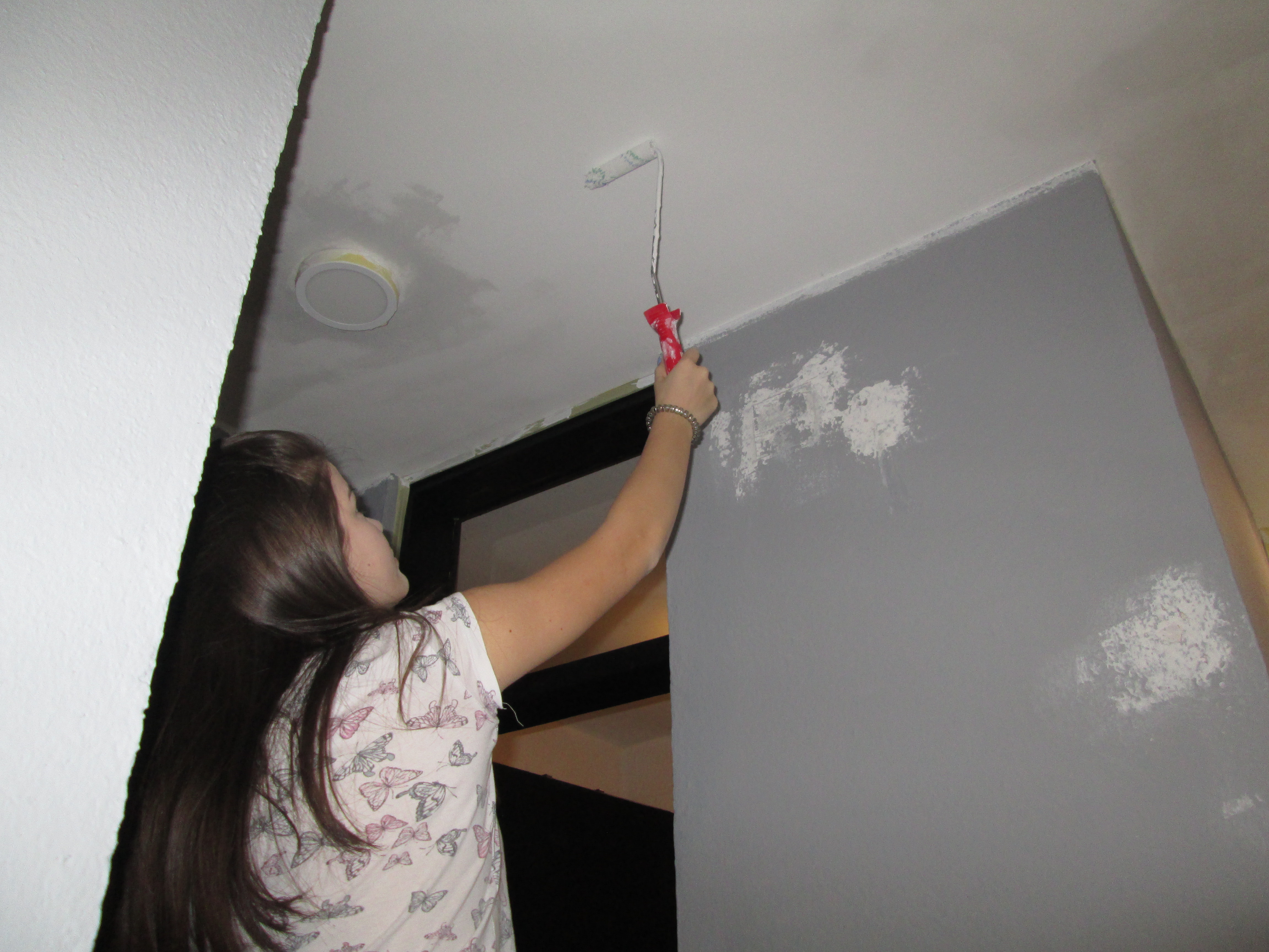 Прво сам све површине и зидове које не желим да буду окречени заштитила. А затим сам прво окречила плафон. Око плафона сам се највише мучила јер треба да будем све време на мердевинама и гледам у плафон. Тако да ми се мало завртело у глави. Накох што сам окречила плафон, сачекала сам да се лепо осуши како бих и њега заштитила. Нако што сам све то урадила бацила сам не на посао до којег сам и желела да стигнем. Наравно није се све завршило, тако да ме овај посао чека сутра.
