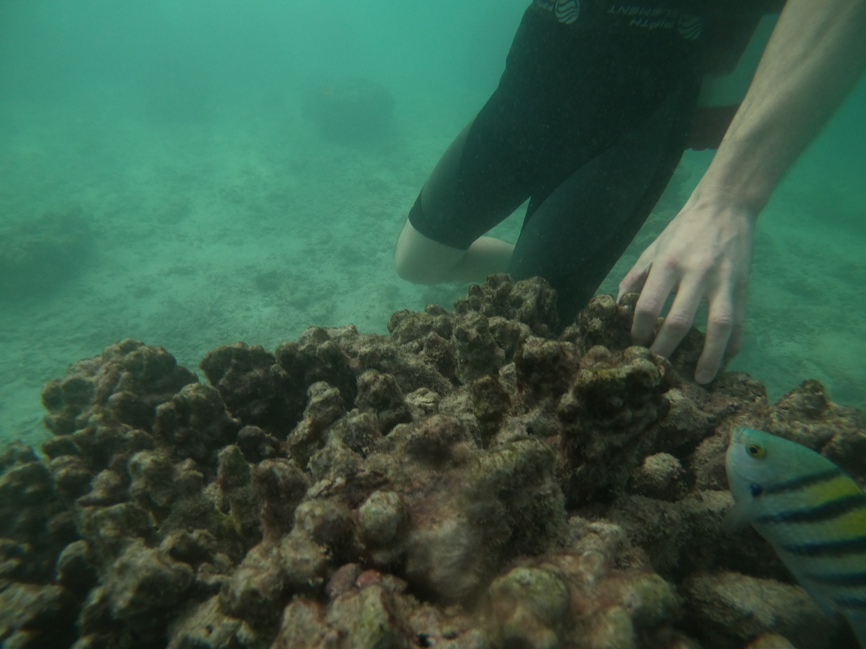 Unfortunately, there weren't any corals around here, but that was probably also much better for them as us tourists would have probably damaged them. Instead there were these large stones or were they dead corals after all? Most of the marine life seemed to be gathering around them and with just a bit of food they all came flocking around me. I could identify at least 4 or 5 different kinds of fish with one being quite large (about 40 cm) and blue. The most common were the yellow grey stripped ones which seemed friendly enough :)