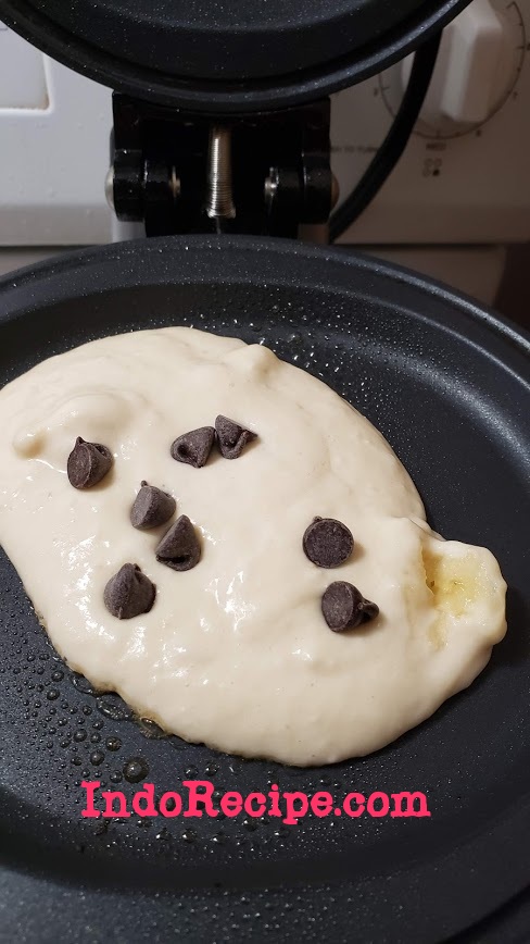 - Pour 1/4 c batter, add some chocolate chips, cover choc chips with more batter, cook for 1 minute on one side, turn pancake over, cook for another 2 minutes