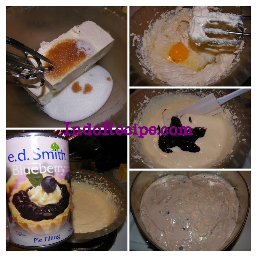 - Fold in 1/2 cup of blueberry pie filling into cream cheese mixture then pour mixture into cooled crust