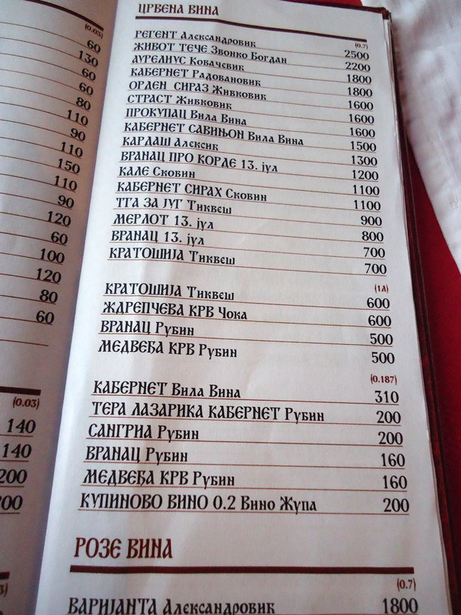 Menu - wine list. All prices are in dinars.