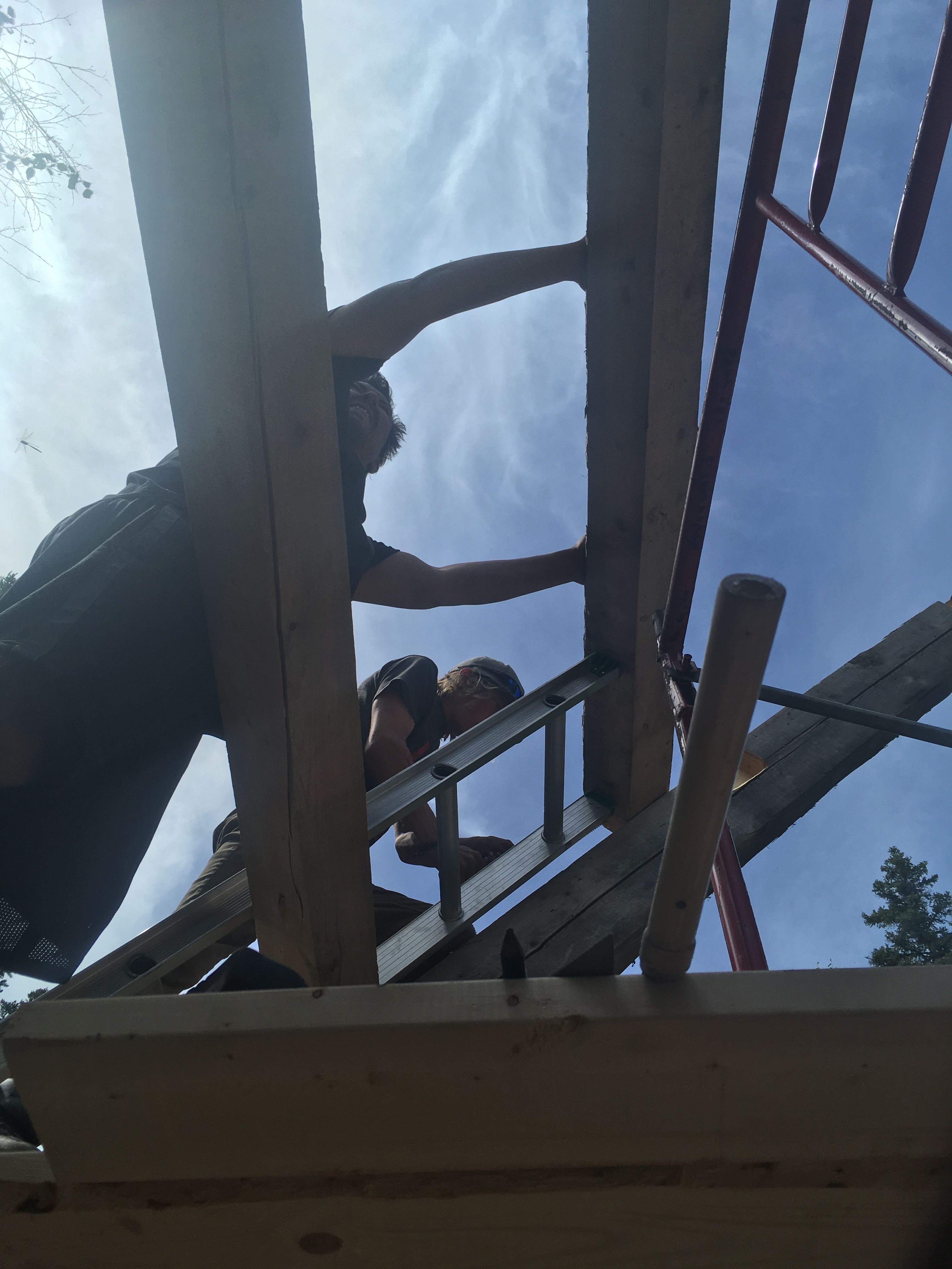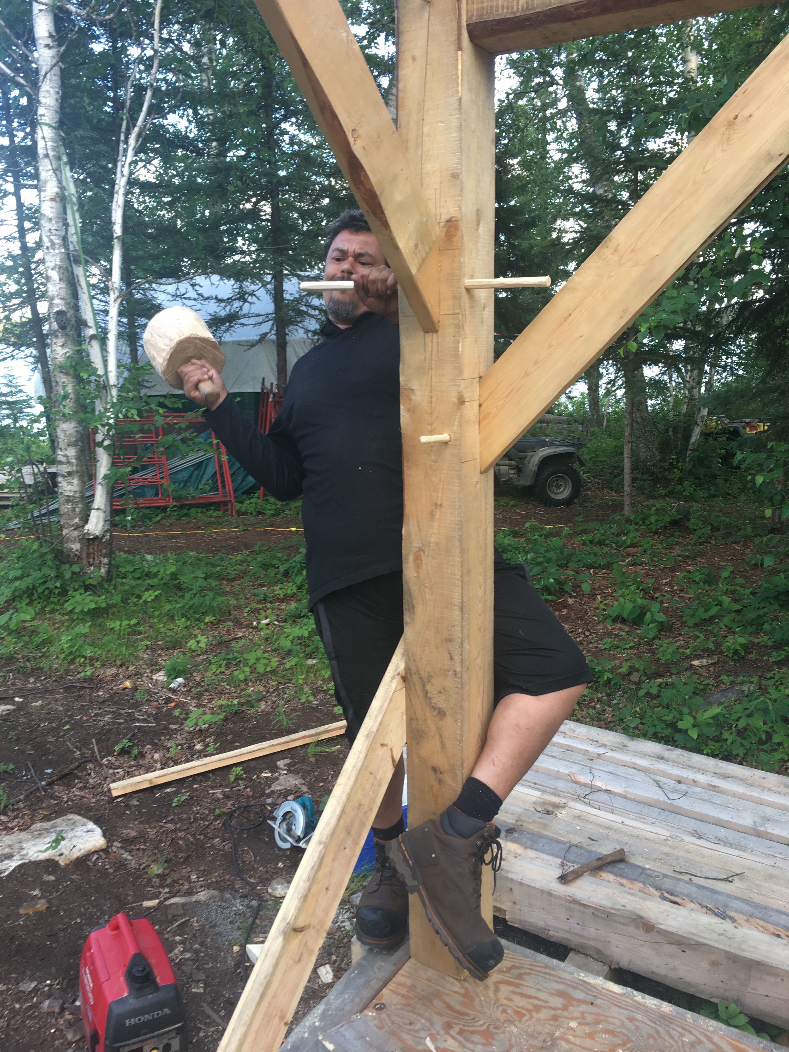 The seventh day Jay did some touch-ups, Dallas hammered the pegs in one side and when it was ready to lift I came to help.
