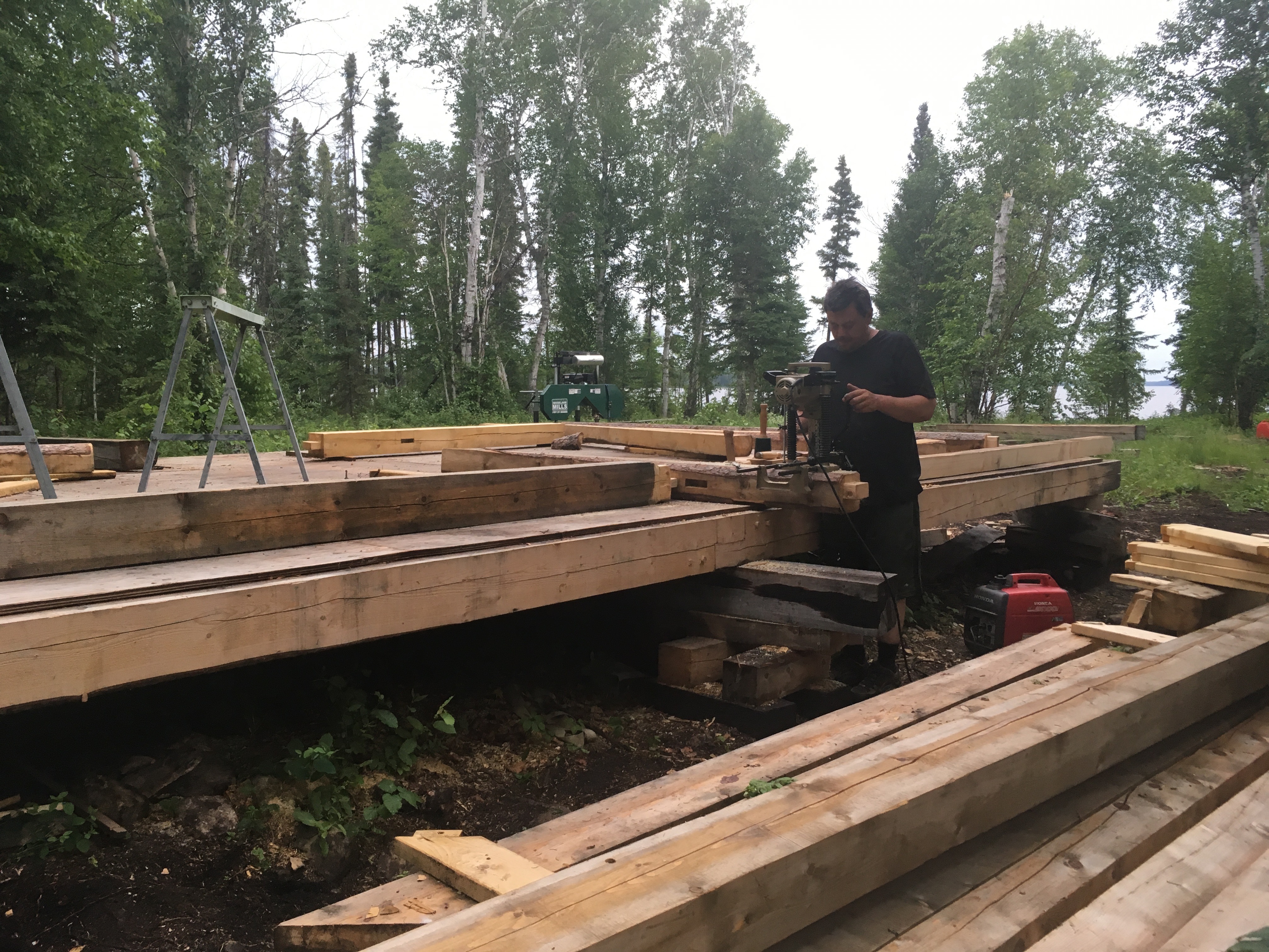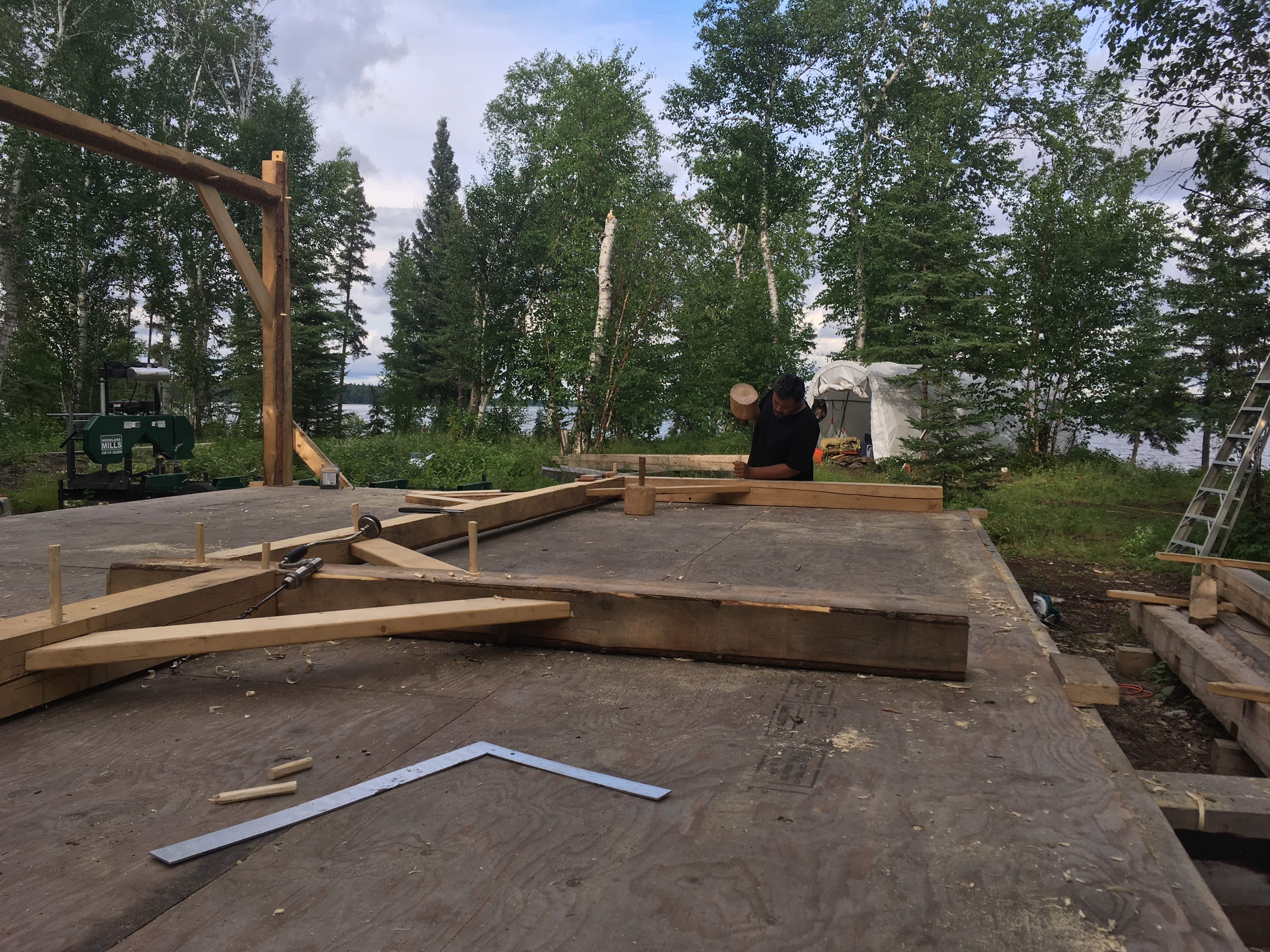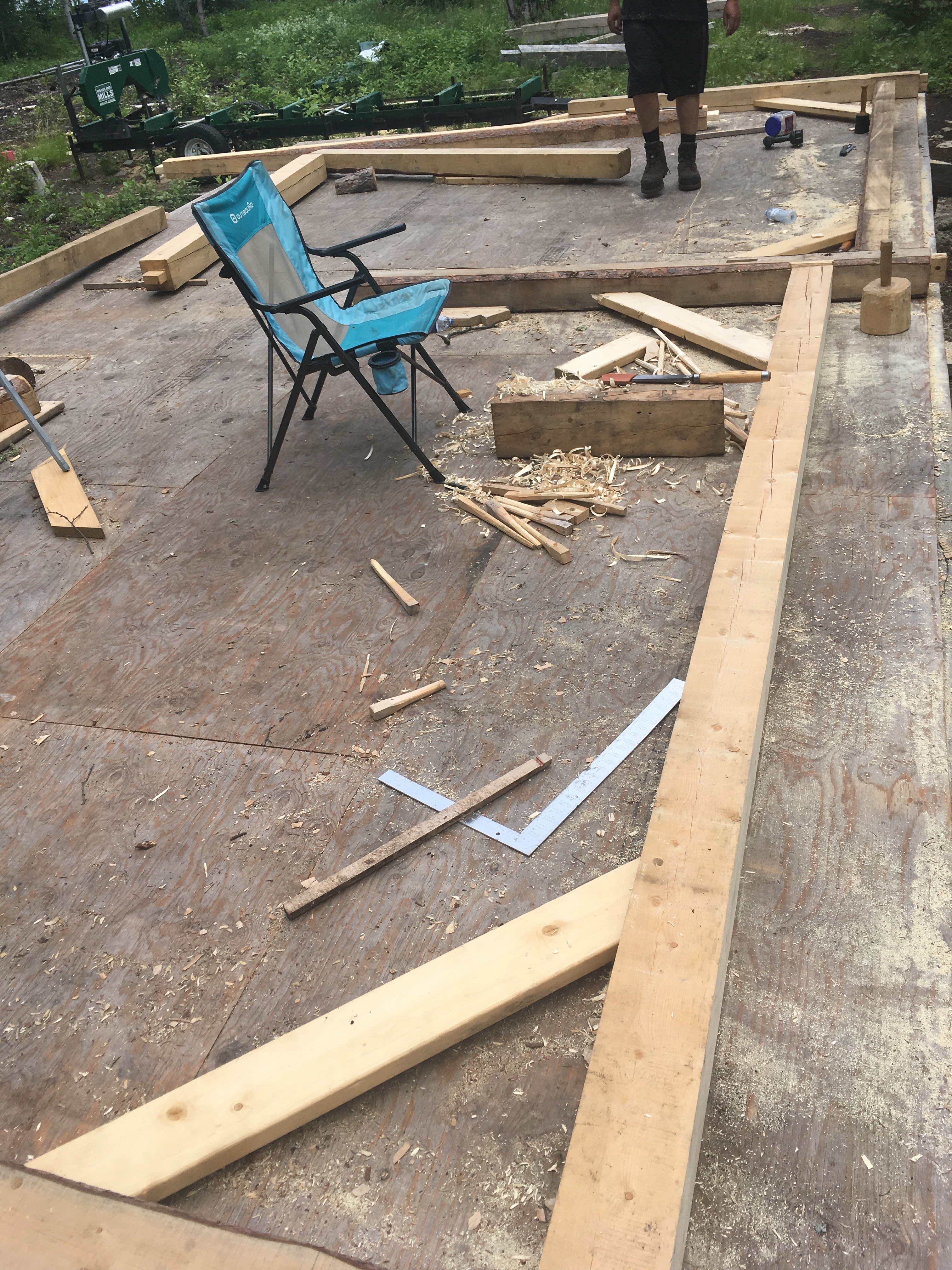 We moved the tie beams to the cabin floor where Jay made the measurements and cuts.