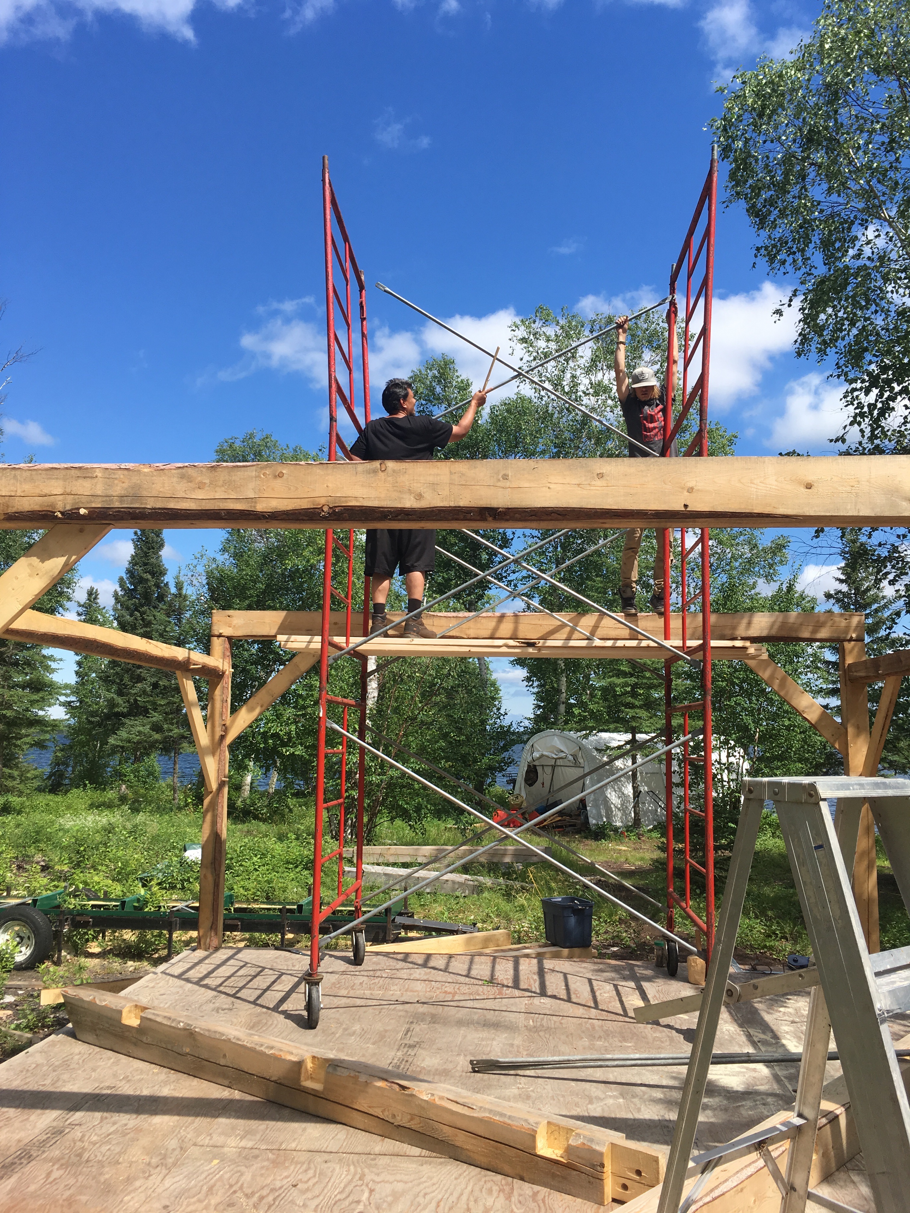 Day eight, Dallas and Jay getting the scaffolding together for putting up the rafters and purlins.