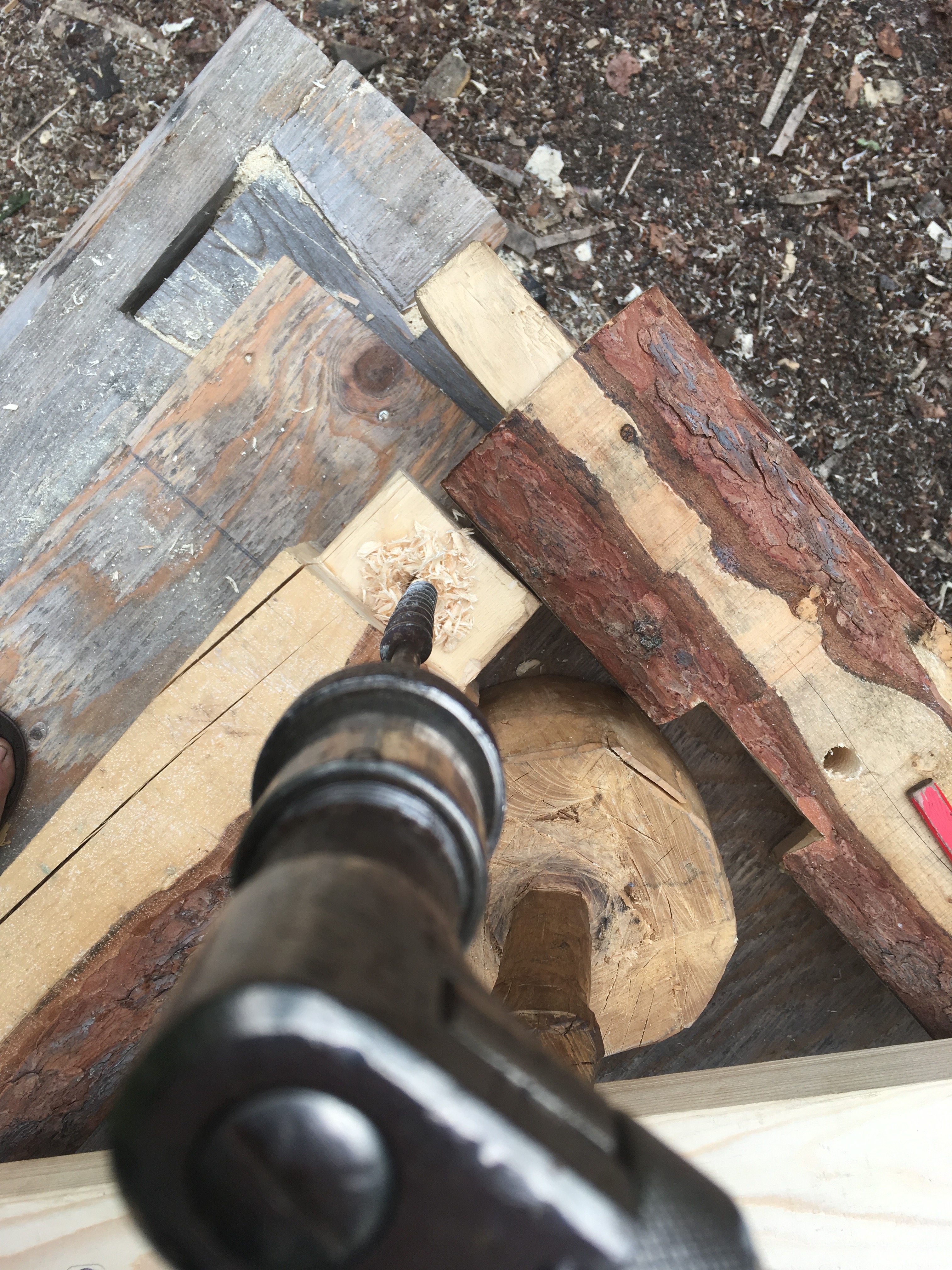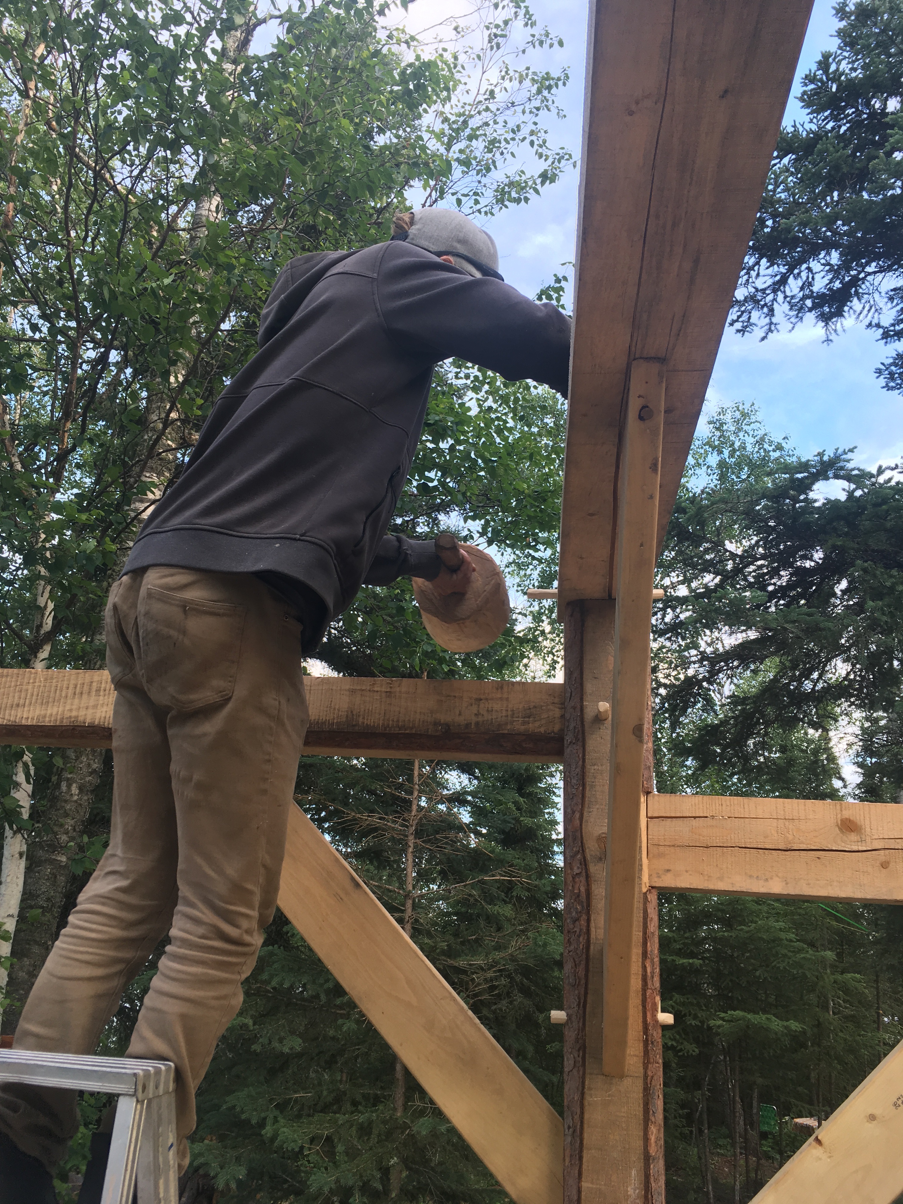 The fifth day Jay and I spent a lot of the day fitting the braces into the tie beams, leg posts, drilling the peg holes and making a few more pegs.
