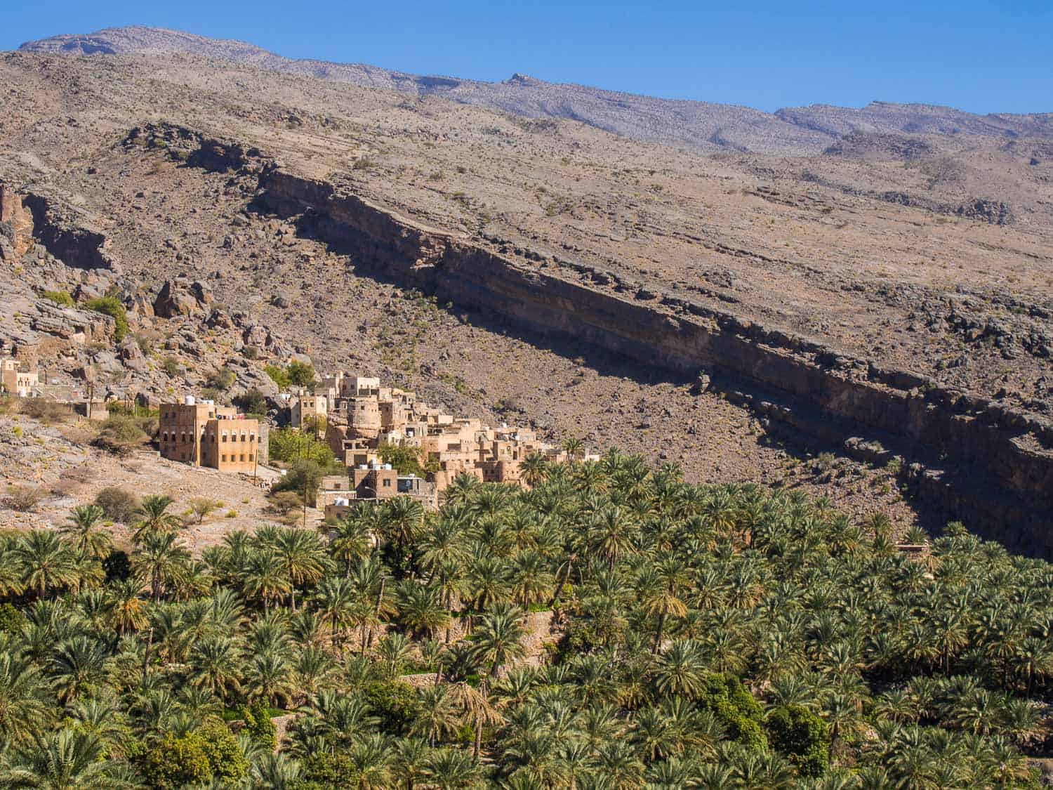 It’s a maze-like village of crumbling mud houses in narrow passageways sloping down the mountainside. Below the village you can follow the falaj irrigation channels and walk through the lush date and banana plantations—it’s shockingly green after the desert.