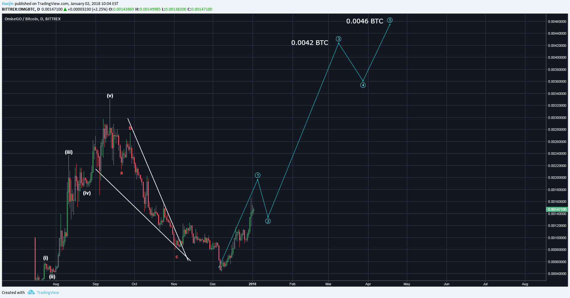 The OMG/BTC is being targeted for 0.0046 BTC for wave 5. Wave 3 target is 0.0042 BTC. Note how price went below the apex of the symmetrical triangle and this is quite ok as you can see, price had no problem rising and impulsing up!!