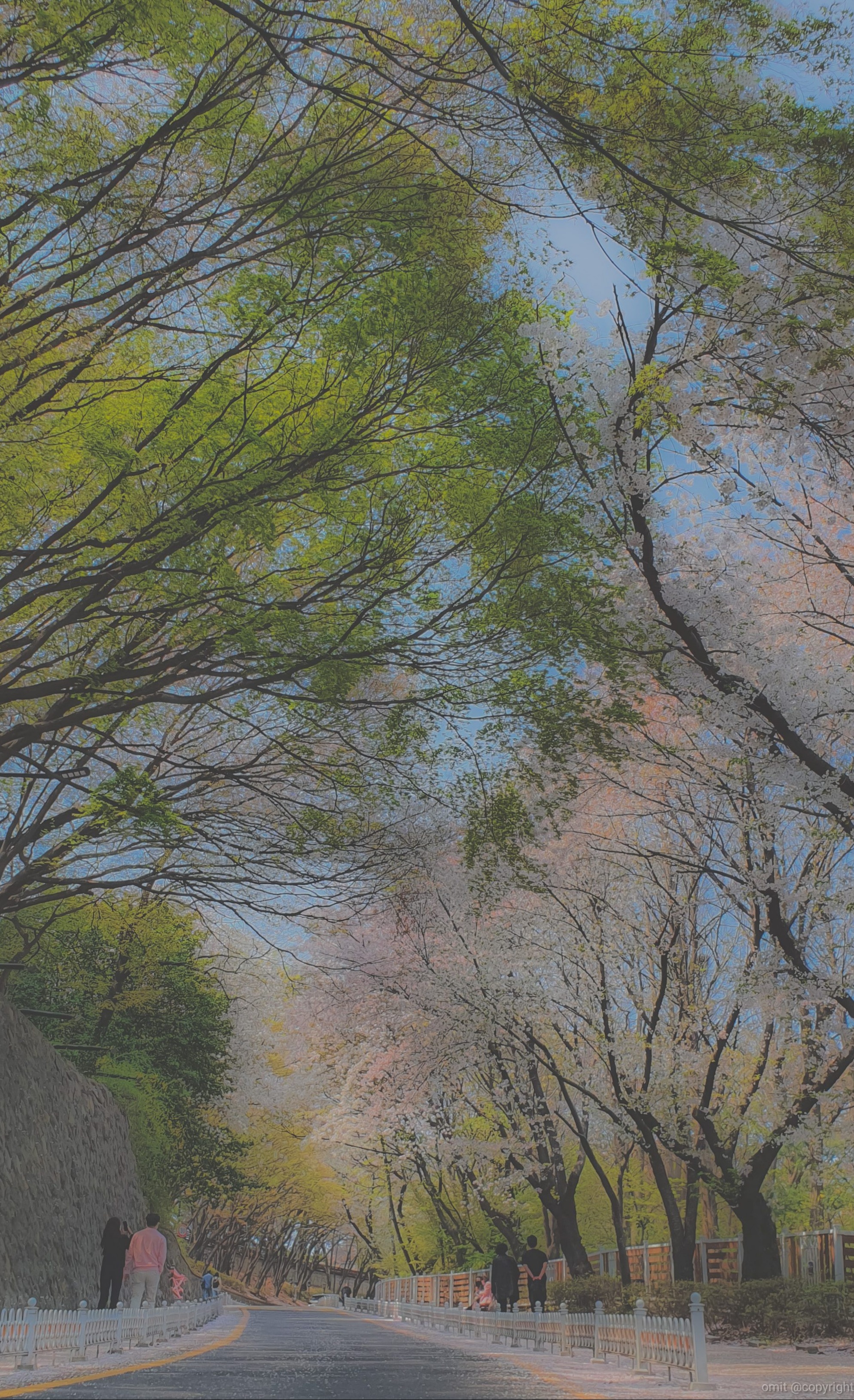 연두와 분홍의 조화로운 길을, 흩날리는 벚꽃잎과 함께 한다.