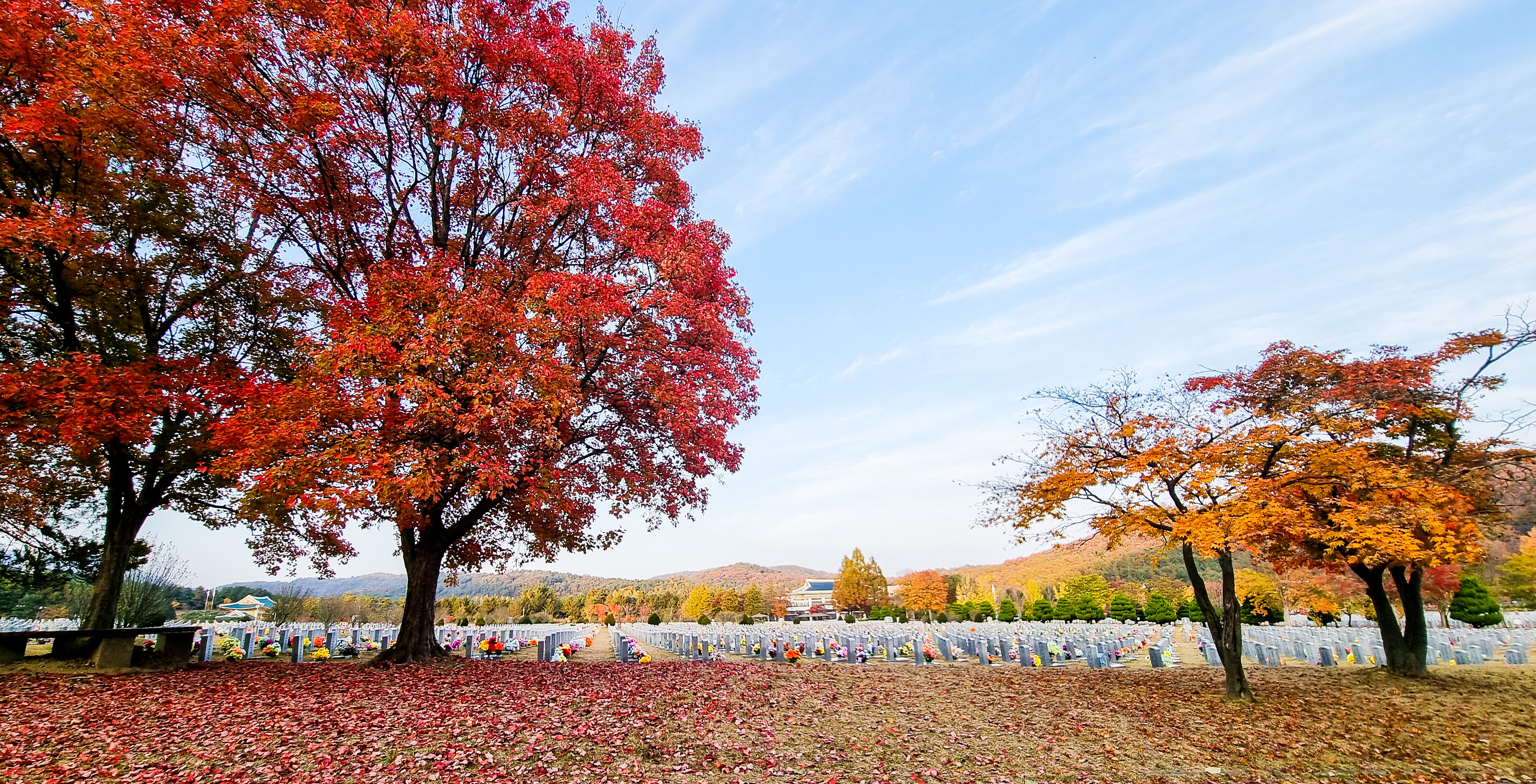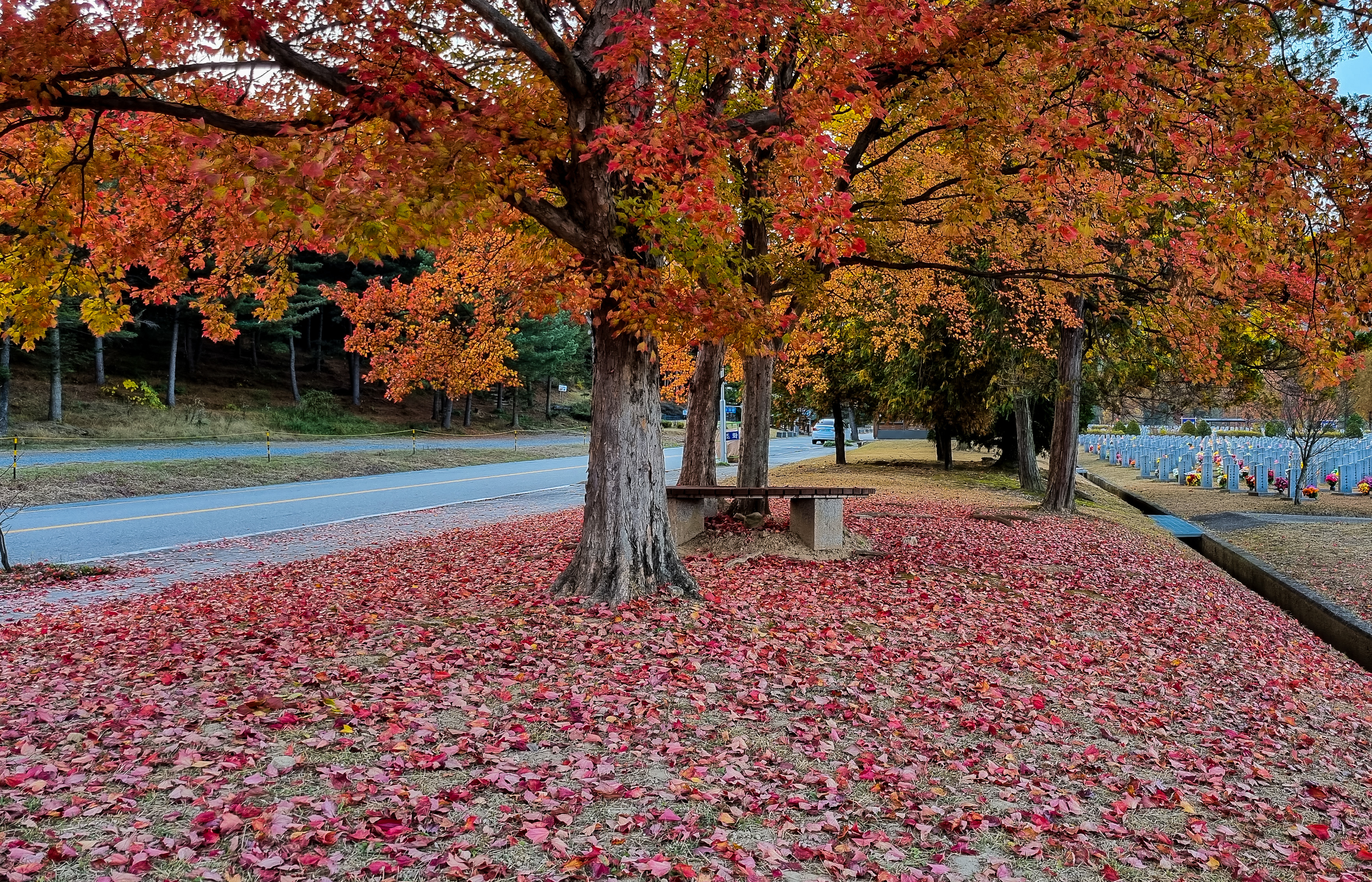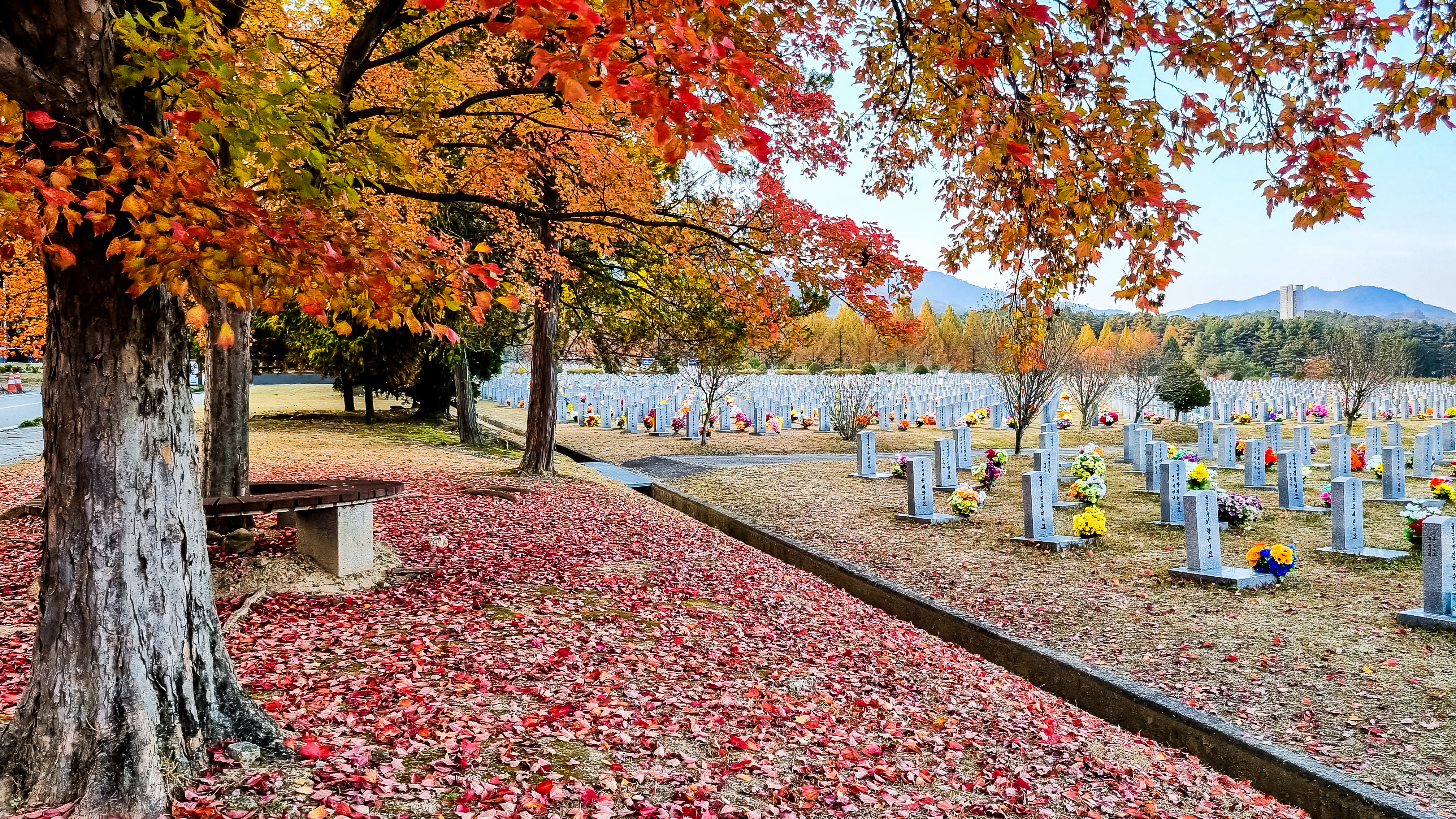 현충원인가요...? 단풍과 묘의 절묘한 조합이랄까요... 넋을 기리는 곳이니 조용하군요..^^ 오늘도 멋집니다 사진이