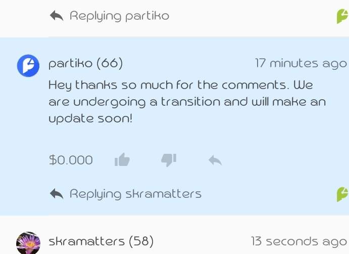 "For what is worth, Partiko is still functioning and we are still paying for the cost. The transition is a very painful decision."