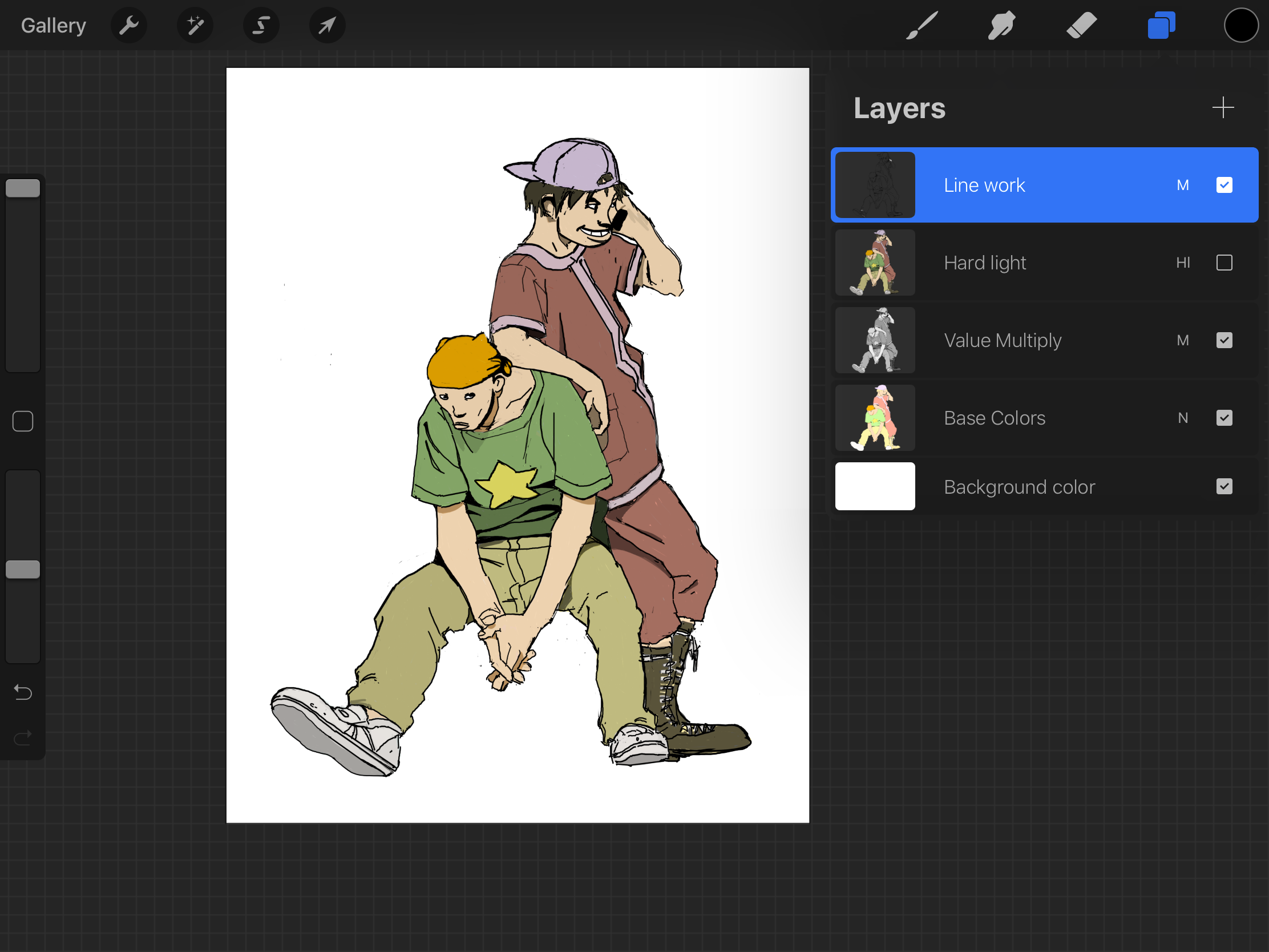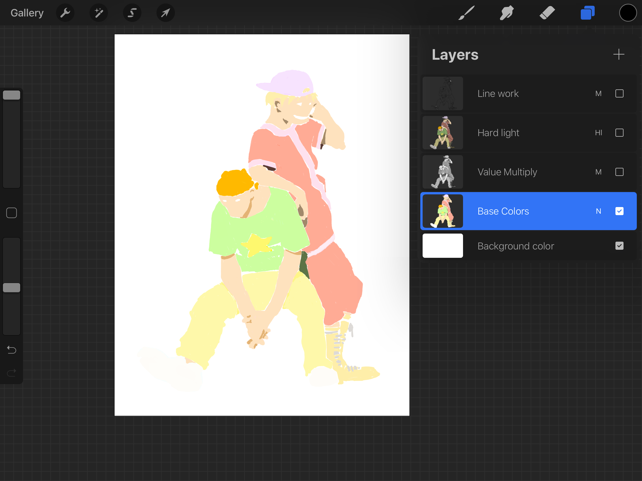 I like having my pure hues on a separate layer, so I can always sample them if I need to. Also, at this stage, I place the values layer above the hues layer, set to multiply mode; this provides an idea of the final result.