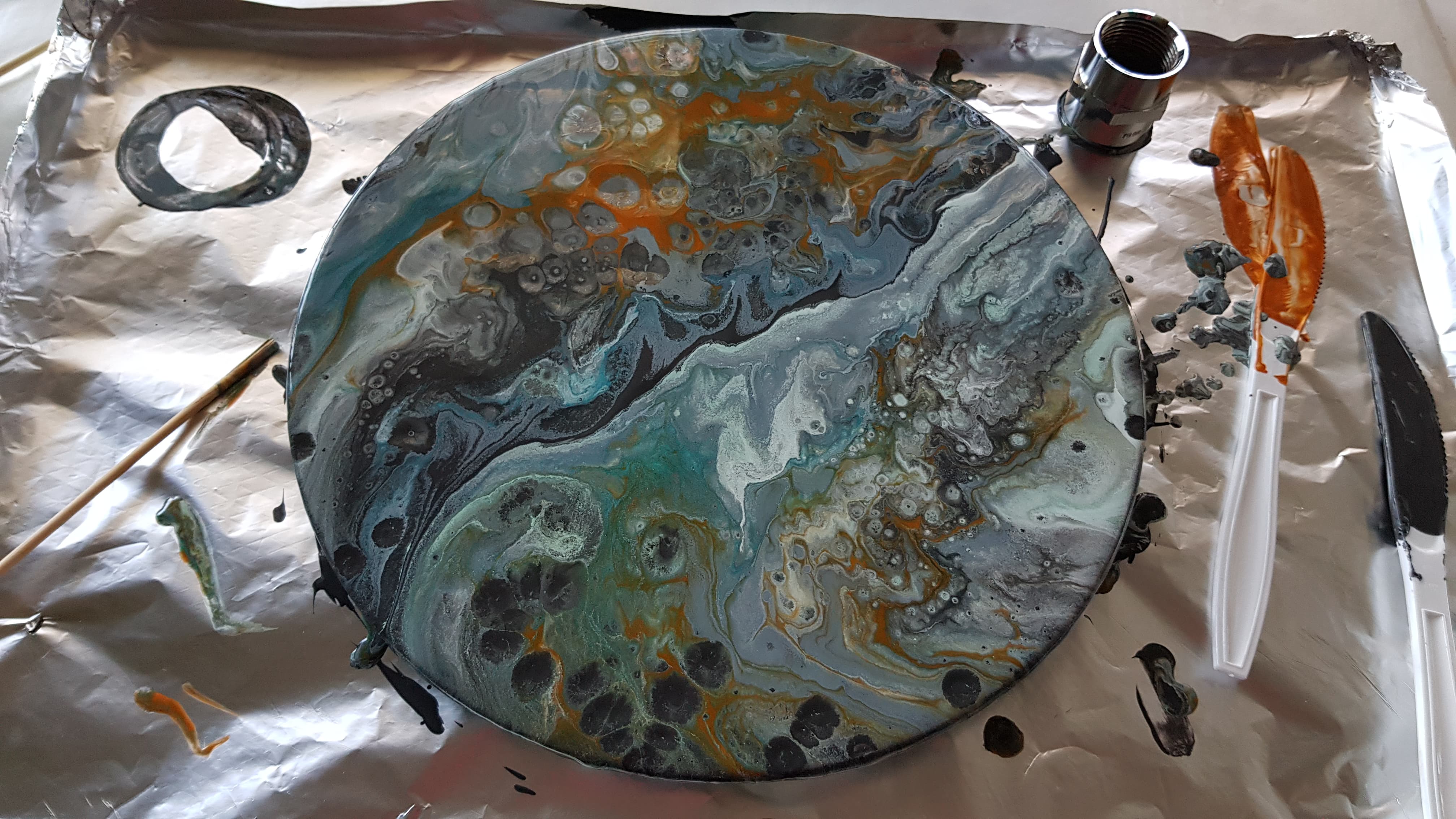 Is my second pour today using mostly house paint but with an enamel paint as well as the teal metallic from DecoArt. The main reason I'm using house paint this time around is so I can use them all up and wash the jars to put new paint in.This size canvas also called for more paint than what my shot glasses can do so it all worked out.