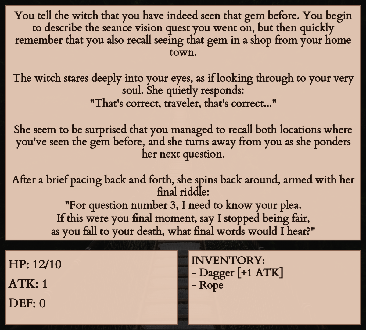You tell the witch that you have indeed seen that gem before. You begin to describe the seance vision quest you went on, but then quickly remember that you also recall seeing that gem in a shop from your home town.
