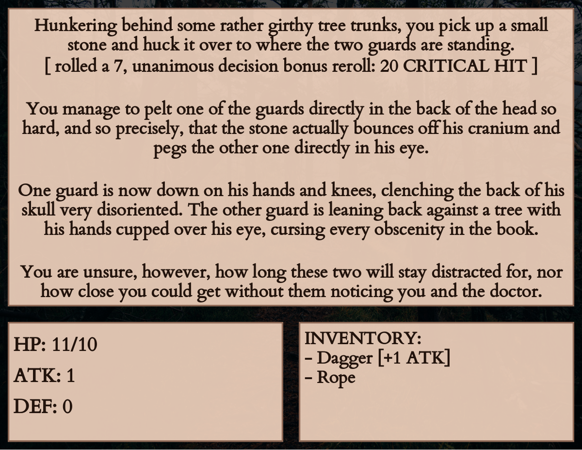 [ rolled a 7, unanimous decision bonus reroll: 20 CRITICAL HIT ]You manage to pelt one of the guards directly in the back of the head so hard, and so precisely, that the stone actually bounces off his cranium and pegs the other one directly in his eye.