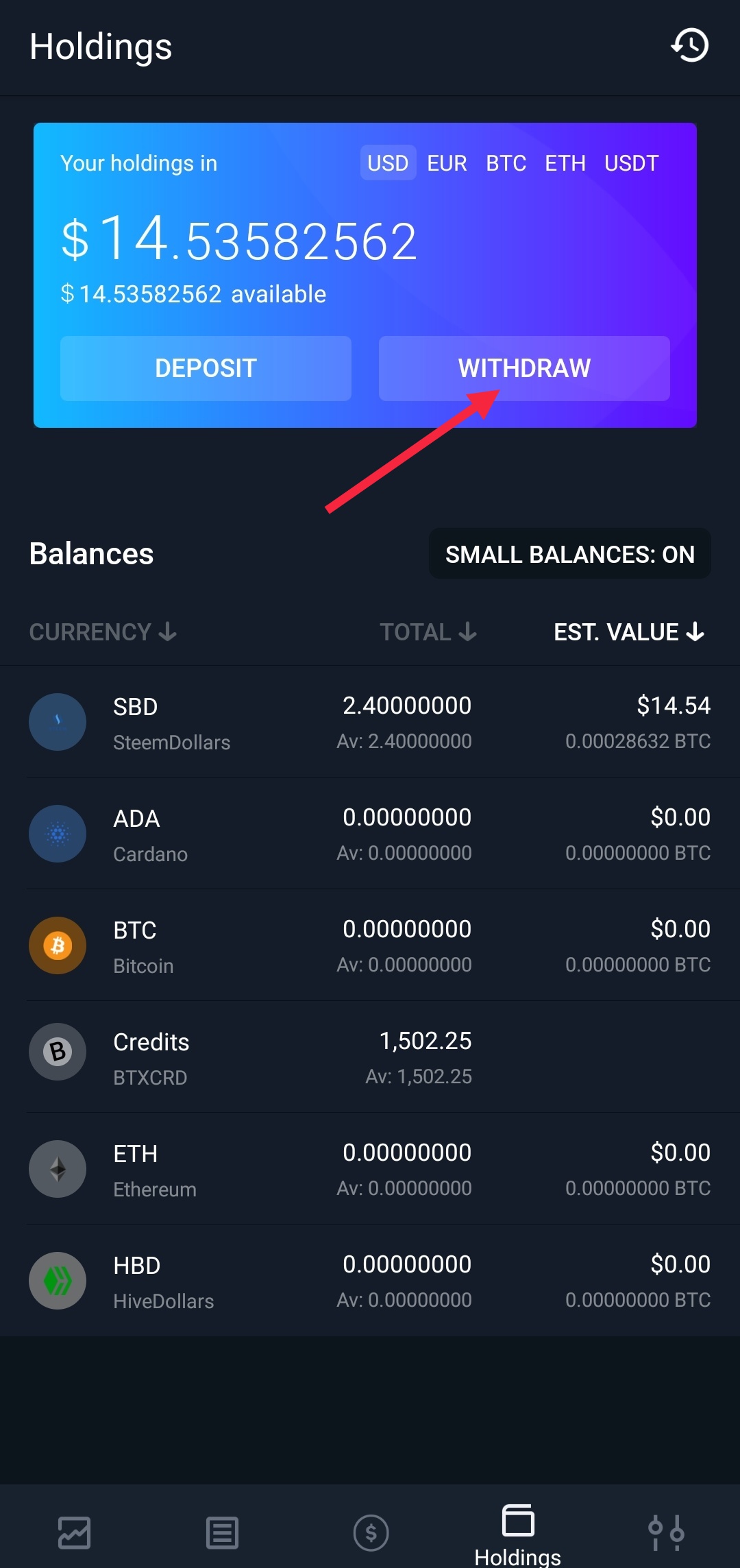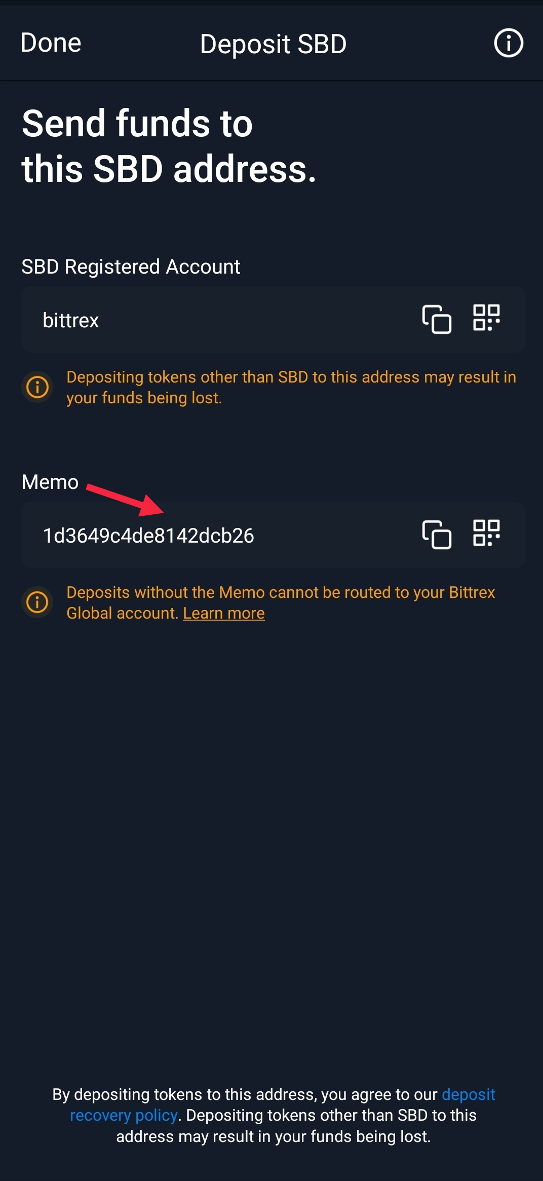 -- Go to the Bittrex app, tap on holdings, and select deposit.
