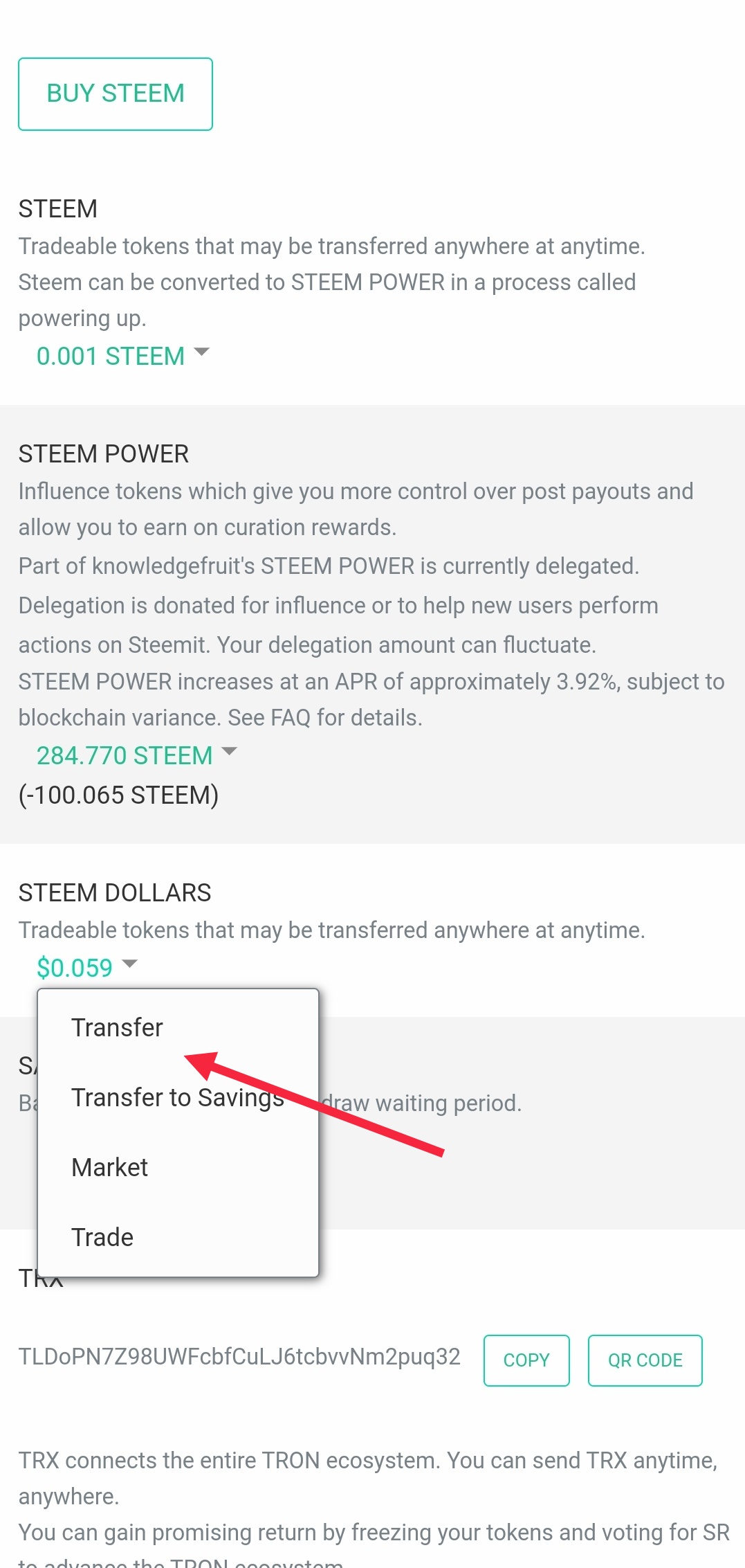 -- Click on the down arrow against your Steem Dollar balance and select transfer.