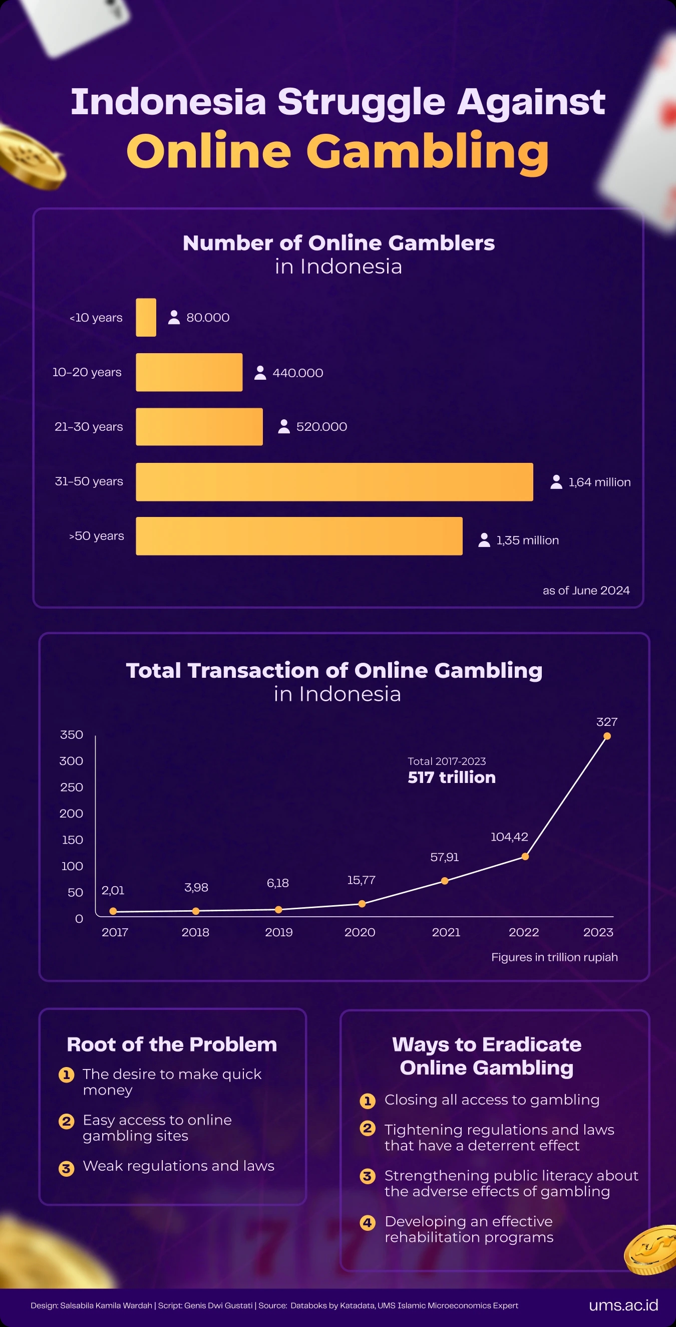 다양한 보고서에 따르면, 인도네시아에서 온라인 도박 이용자 수는 계속 증가하고 있으며, 불법 도박 사이트는 정부의 차단 노력에도 불구하고 점점 더 쉽게 접근할 수 있게 되었습니다. 한 보고서에 따르면, 인도네시아에서는 8,800만 명 이상의 사람들이 온라인 도박에 참여하고 있으며, 이들 대부분은 젊은 층입니다. 이들은 종종 단조로운 일상에 갇혀 있다고 느끼며 도박을 통해 탈출구를 찾으려 합니다. 그 결과, 막대한 재정적 손실에서부터 사회적 생활을 해칠 수 있는 심리적 장애까지 심각한 영향을 미칩니다.